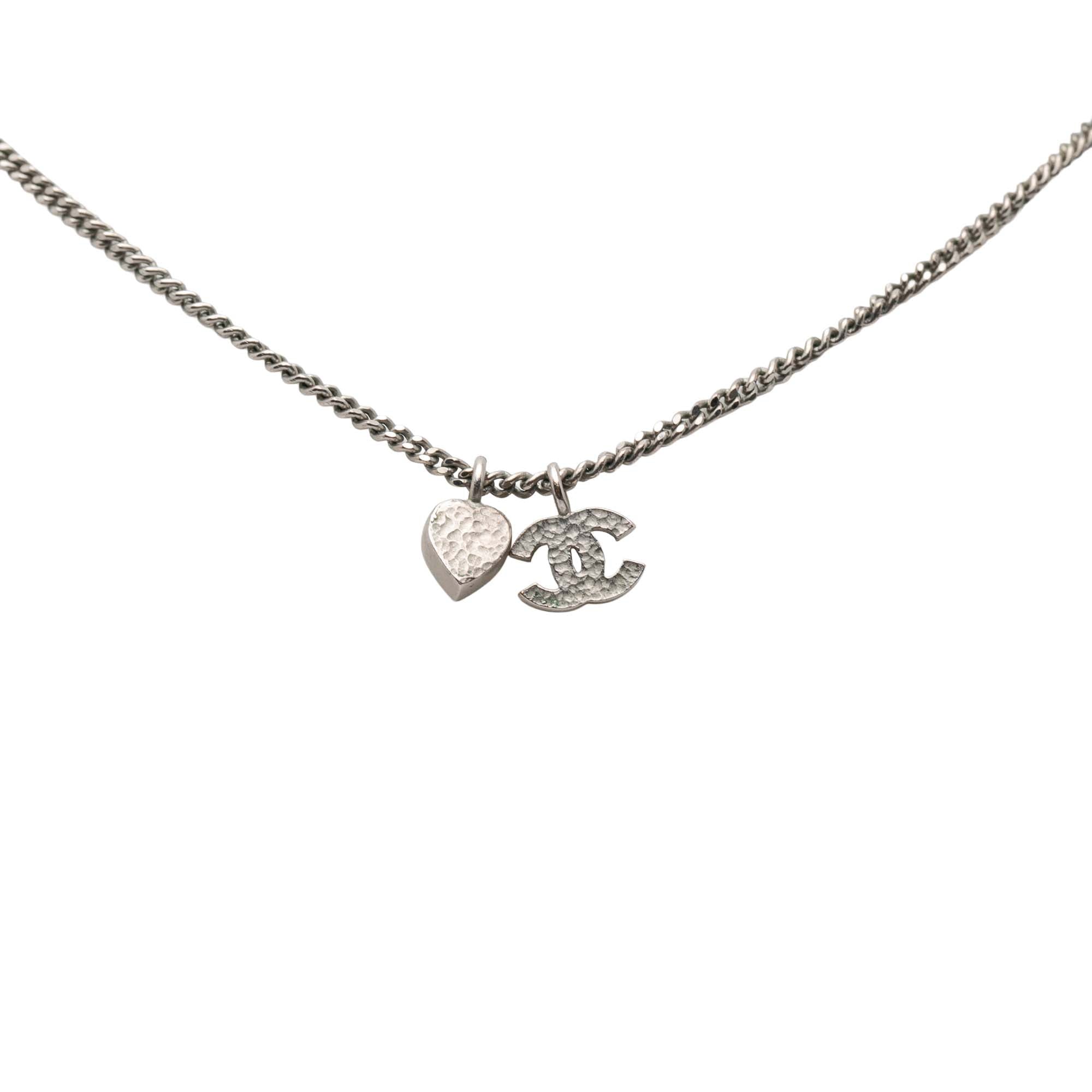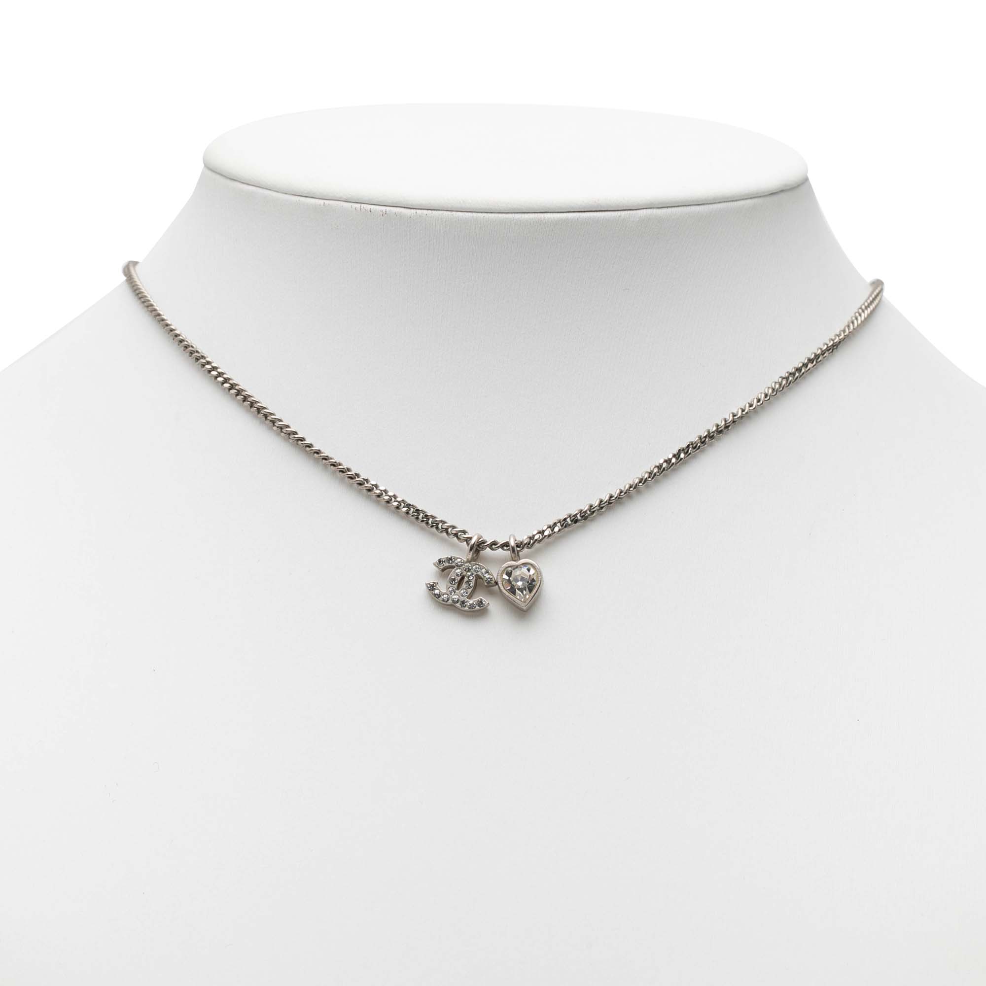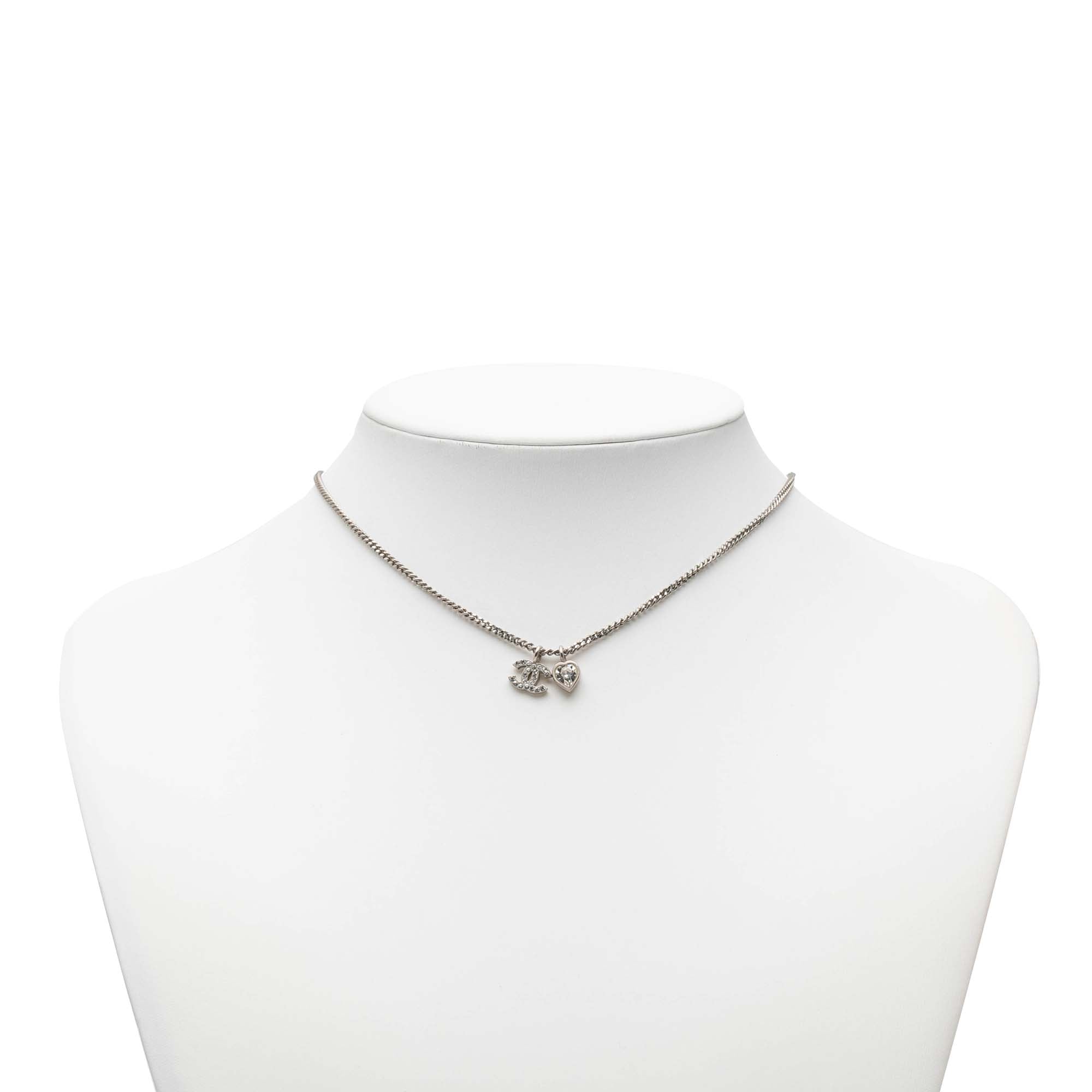 Chanel Silver Plated CC Rhinestone and Heart Pendant Necklace
