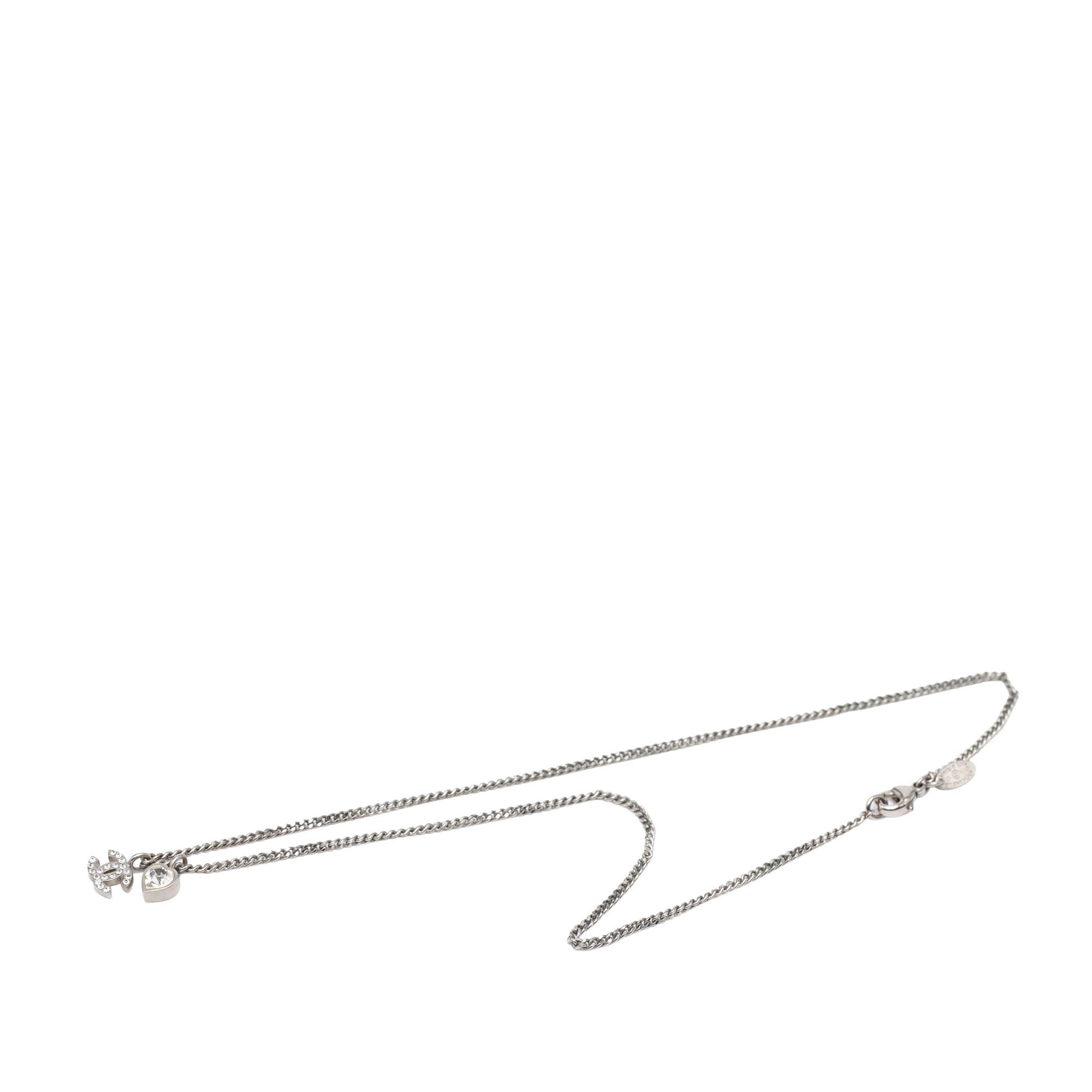 This necklace features a silver-plated body with rhinestone-embellished interlocking CC logo heart pendant, and lobster clasp closure. Inclusion: Dust bag, box. Retail Price: 1500.00