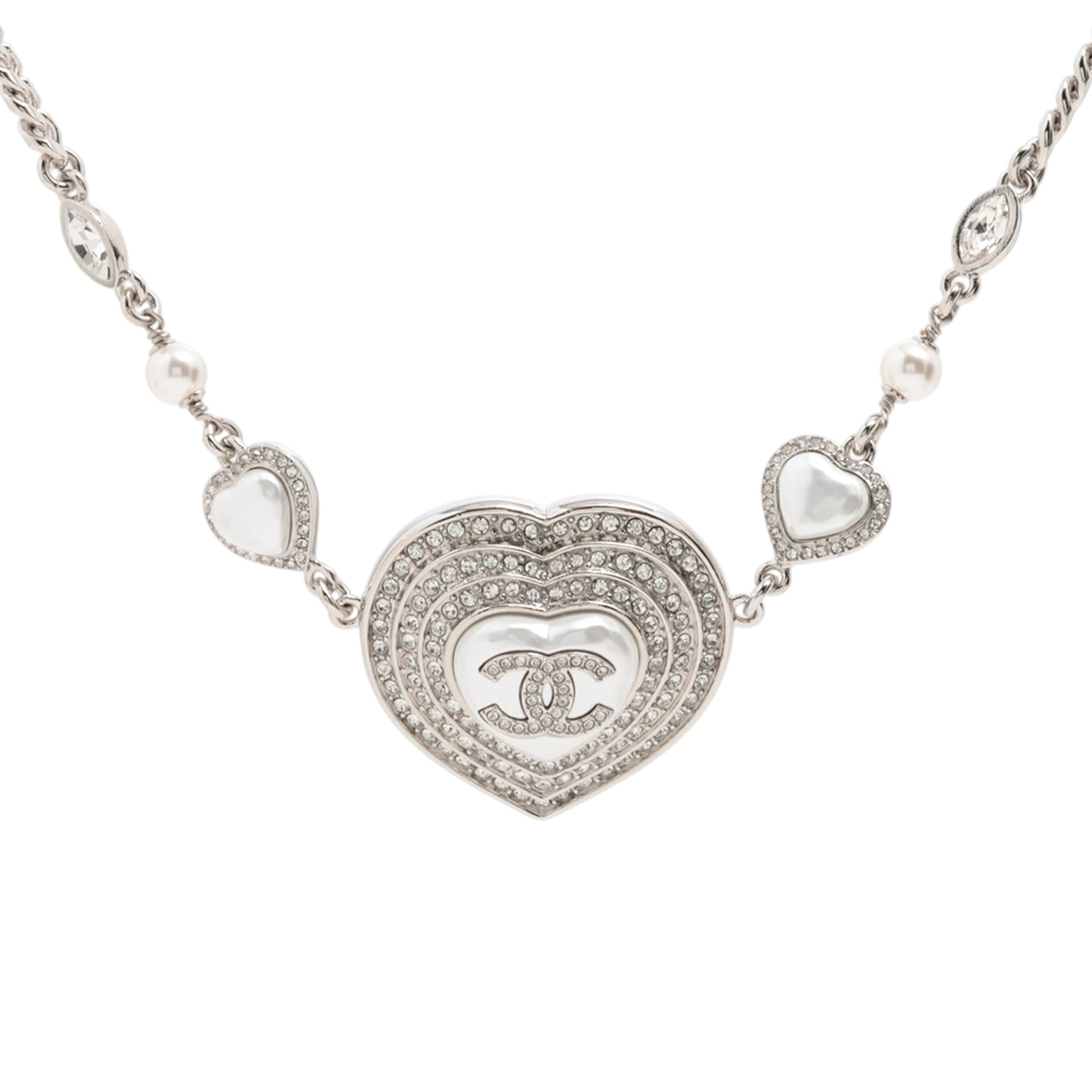 Chanel Silver Plated CC Rhinestones Heart Pendant Necklace