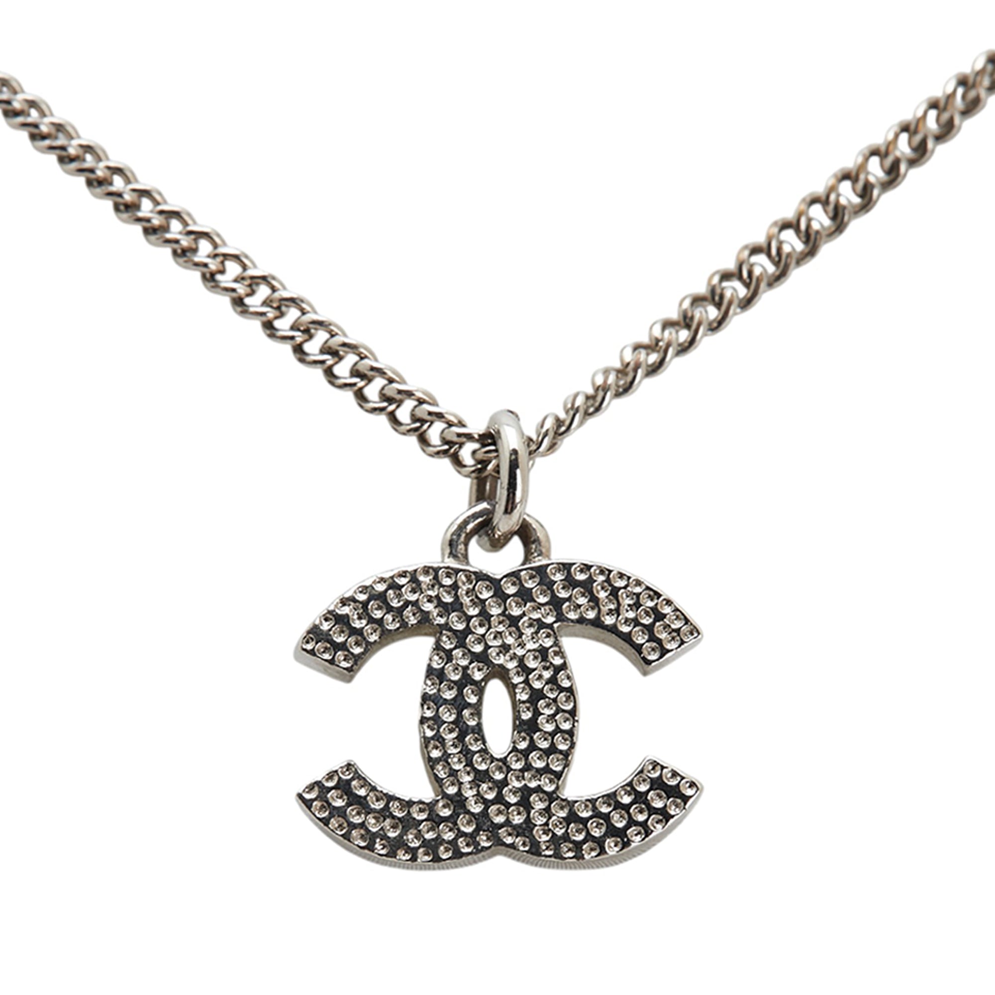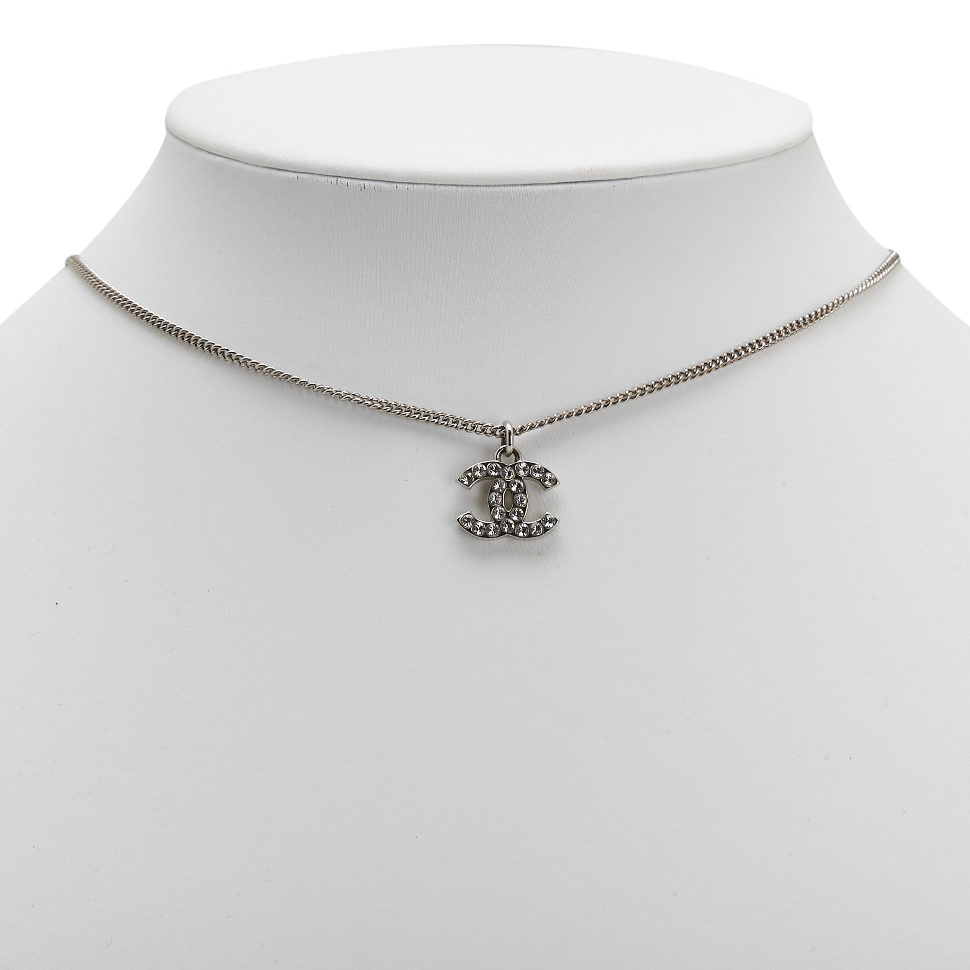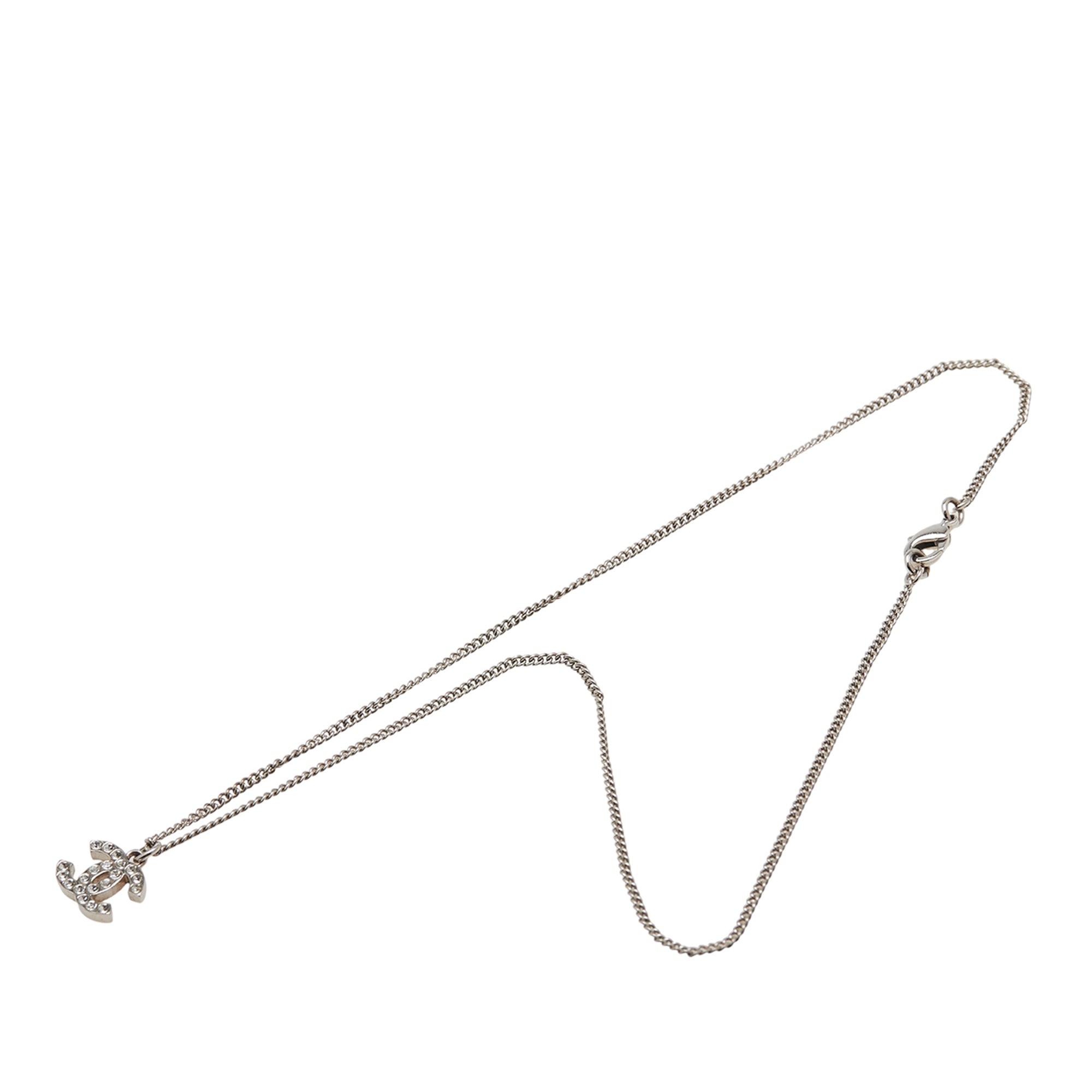 Chanel Silver Plated CC Rhinestones Pendant Necklace