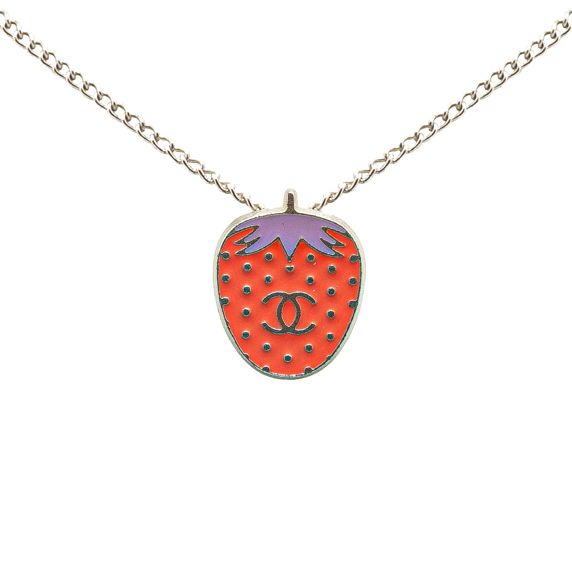Chanel Silver Plated Enamel CC Strawberry Charm Pendant Necklace