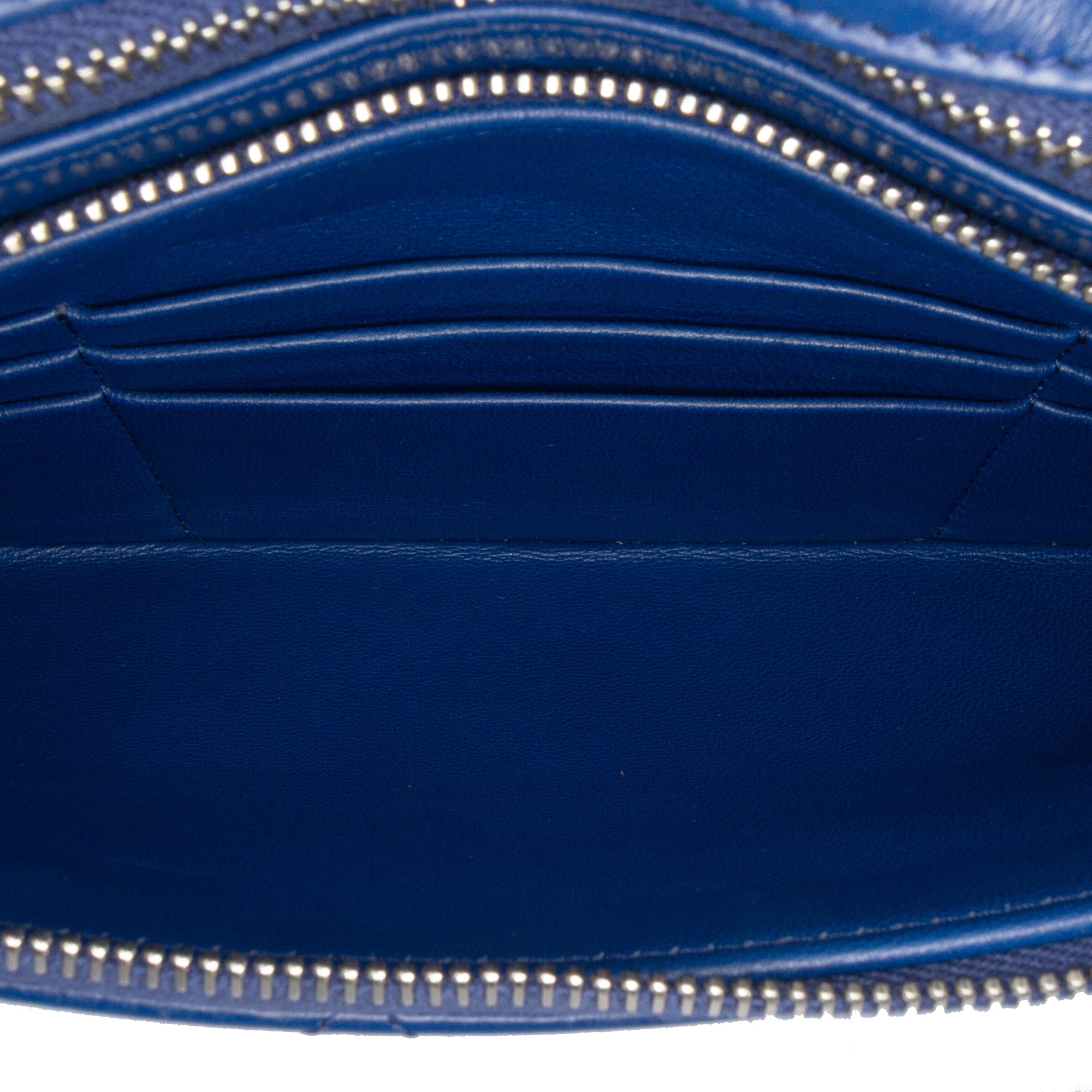This clutch features a quilted leather body, a front flap, a top zip closure under the flap, an exterior back slip pocket, and interior zip and slip pockets. Retail Price: 1760.00