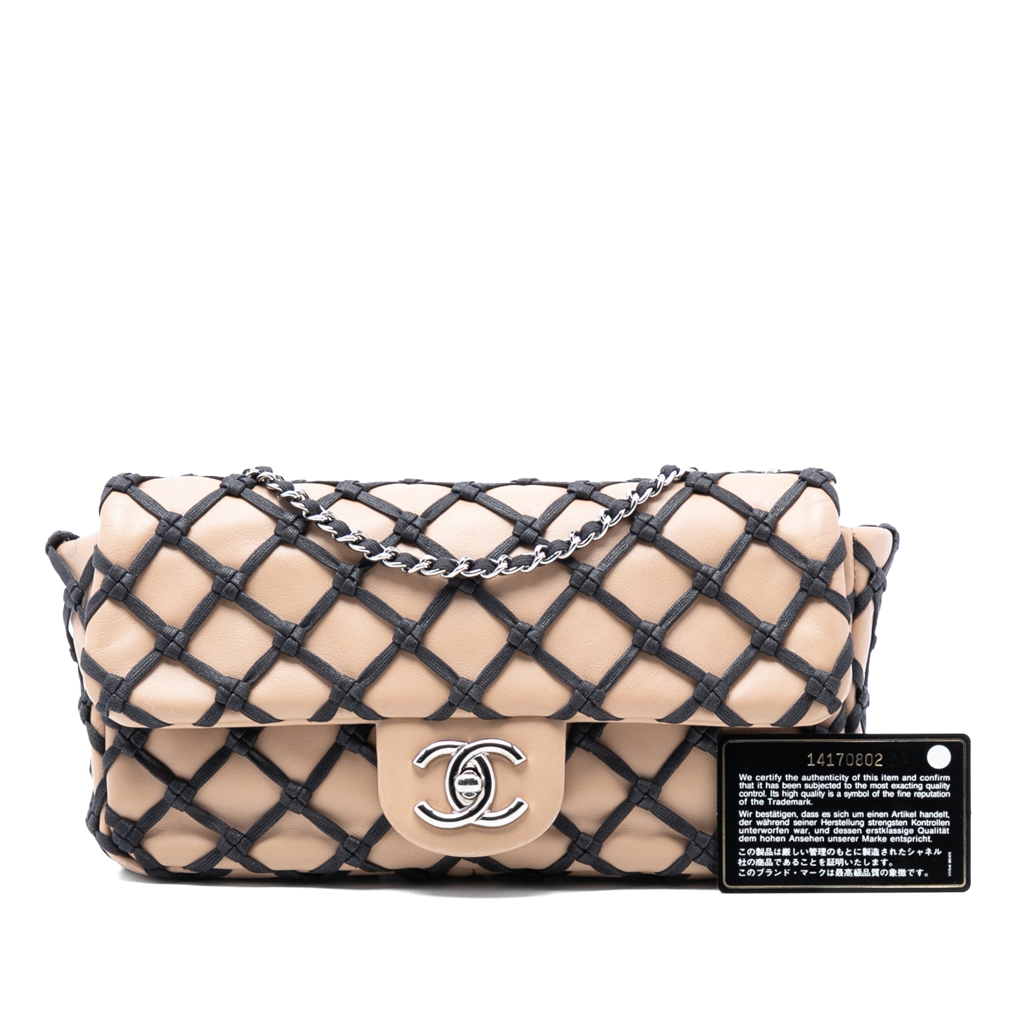 This shoulder bag features a calfskin leather body with fabric netting details, fabric woven chain link straps, a flap with CC turn lock closure, and an interior zip pocket. Inclusion: authenticity card. Retail Price: 2700.00