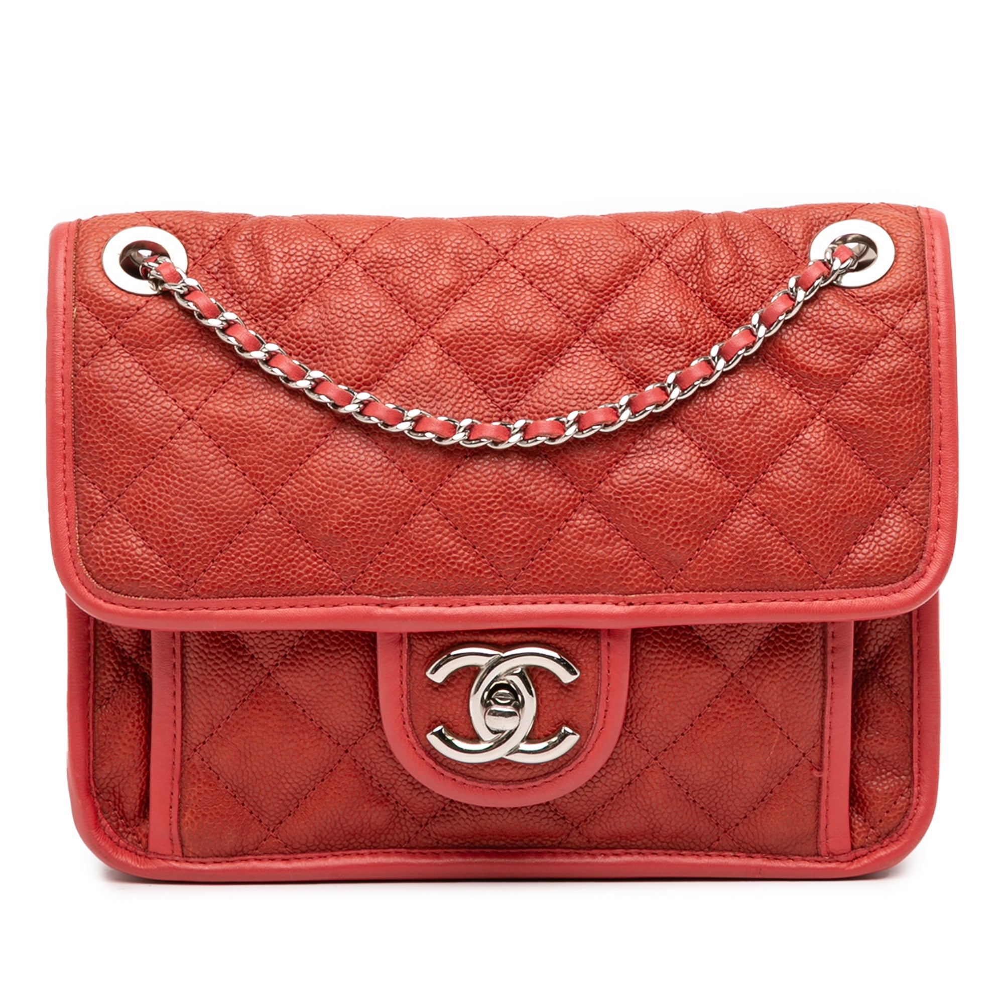 The French Riviera flap bag features a quilted caviar leather body, leather-woven chain straps, a top flap with interlocking CC turn lock closure, and an interior zip pocket. Inclusion: authenticity card. Retail Price: 3060.00