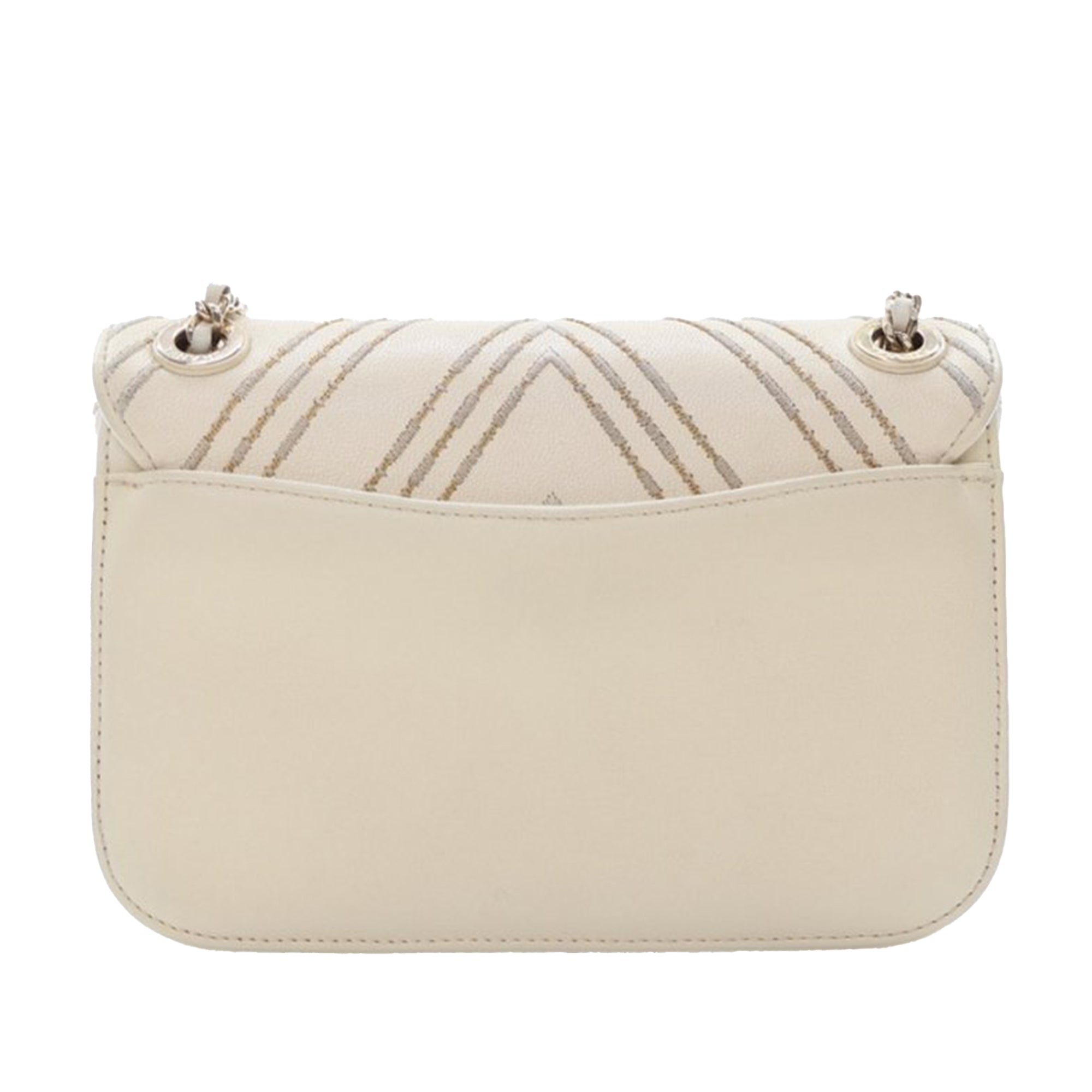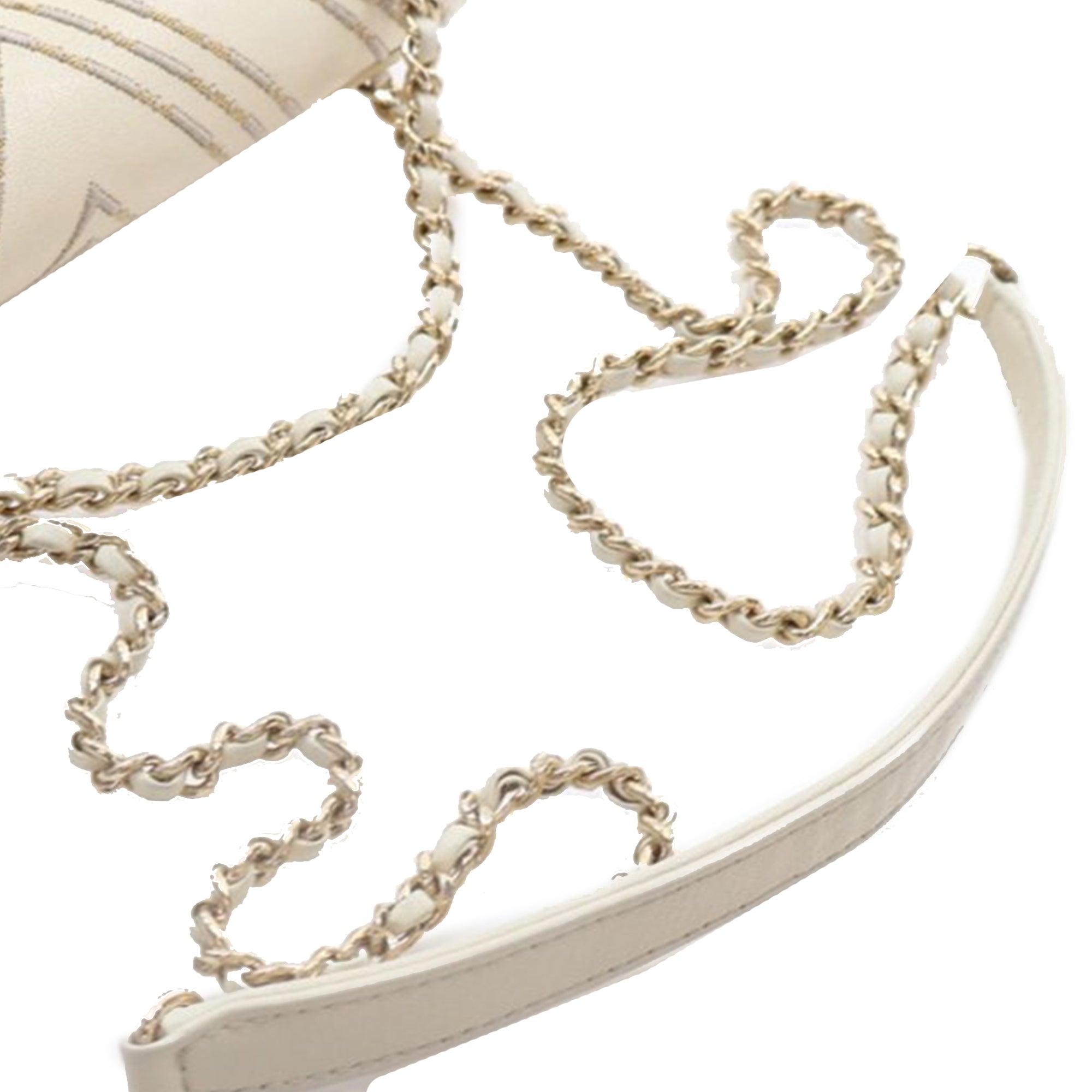 This crossbody bag features a sheepskin leather body, a sliding leather woven chain shoulder strap with leather guard, a front flap with a CC flip-lock closure, and an interior slip pocket. Inclusion: authenticity card. Retail Price: 3700.00