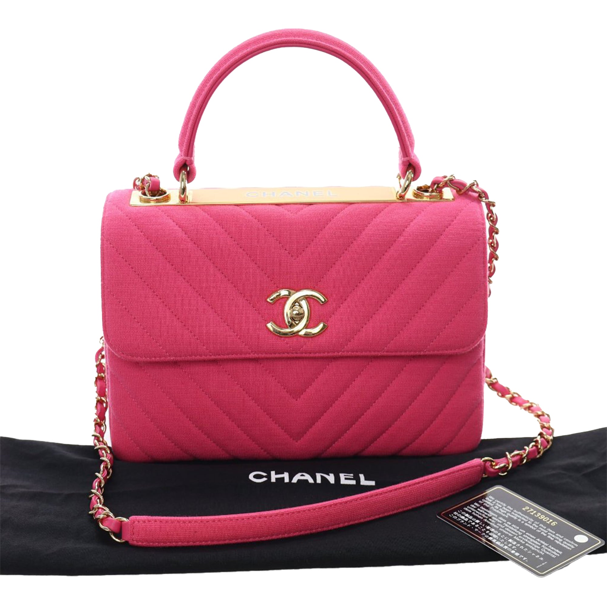 The Trendy CC satchel features a quilted jersey body, a jersey top handle, a jersey woven chain link strap with shoulder guard, a front flap with CC turn-lock closure, an exterior back slip pocket, and interior zip and slip pockets. Inclusion: Dust bag, authenticity card. Retail Price: 5562.00