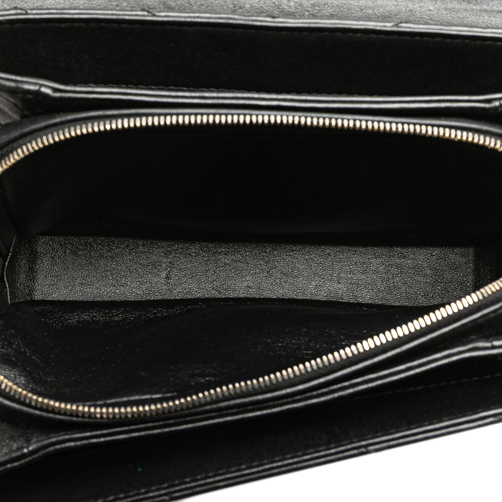 This shoulder bag features a lambskin leather body, a leather-woven chain link strap with leather guard, a front flap with turn lock closure, interior zip and slip compartment, and an interior zip pocket. Retail Price: 5500.00