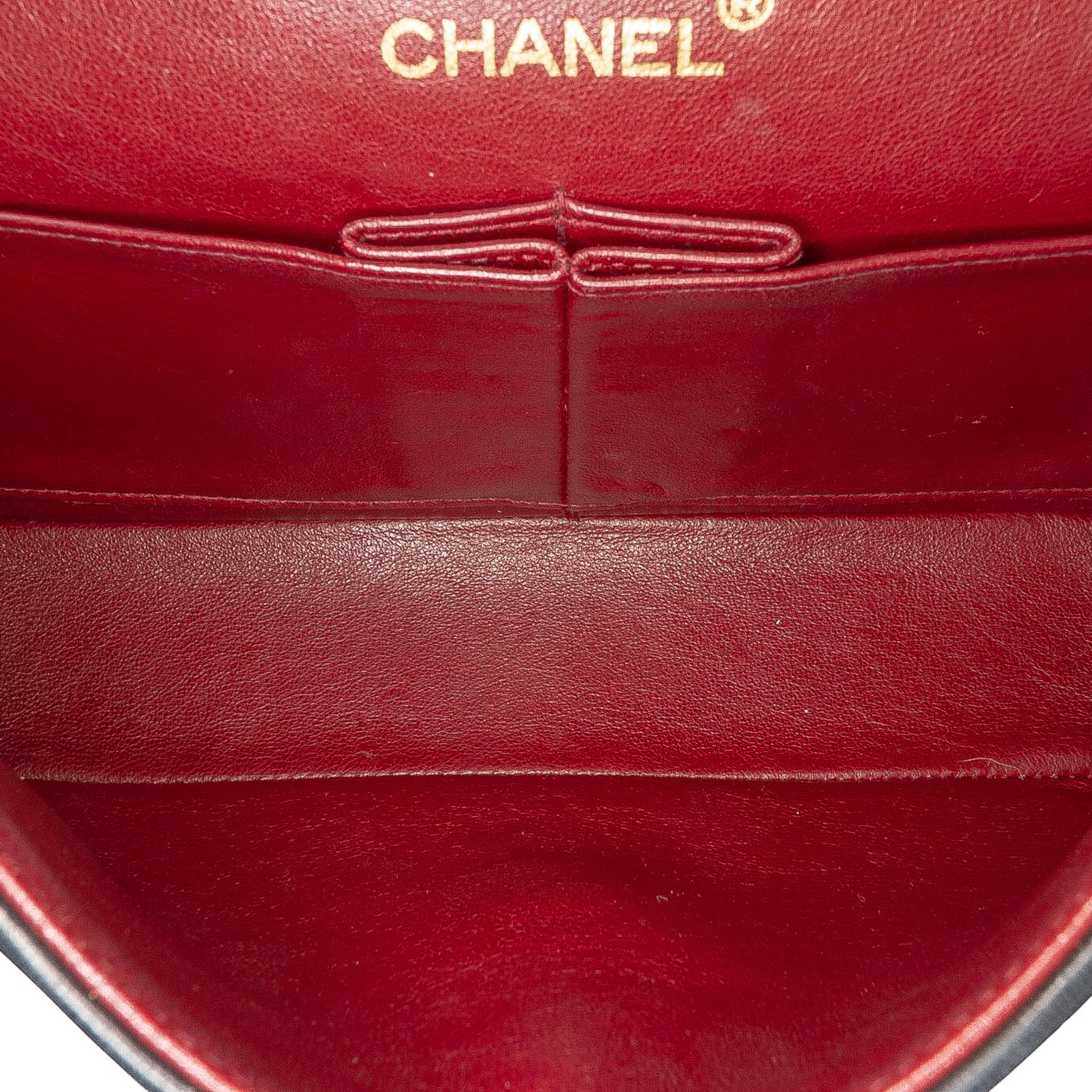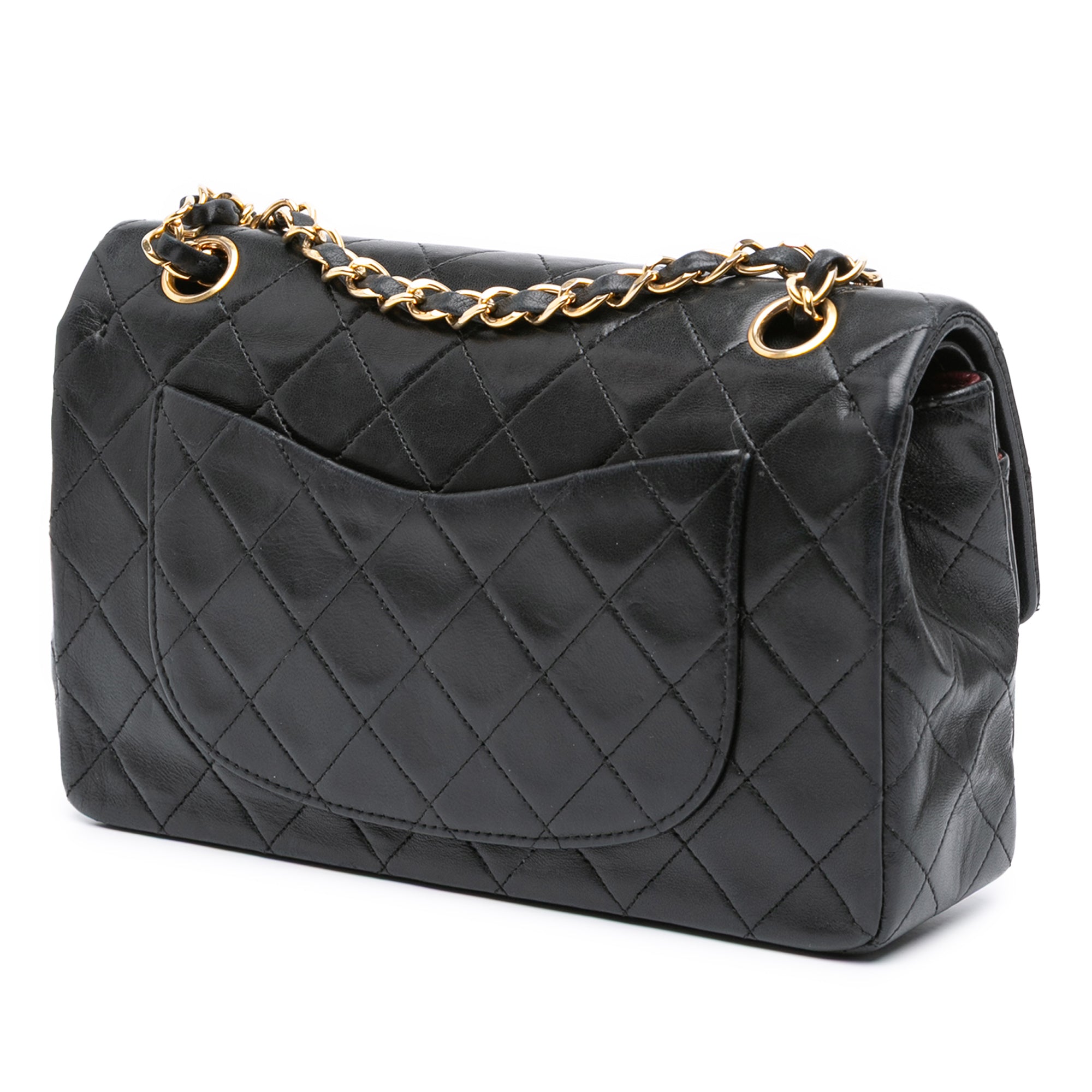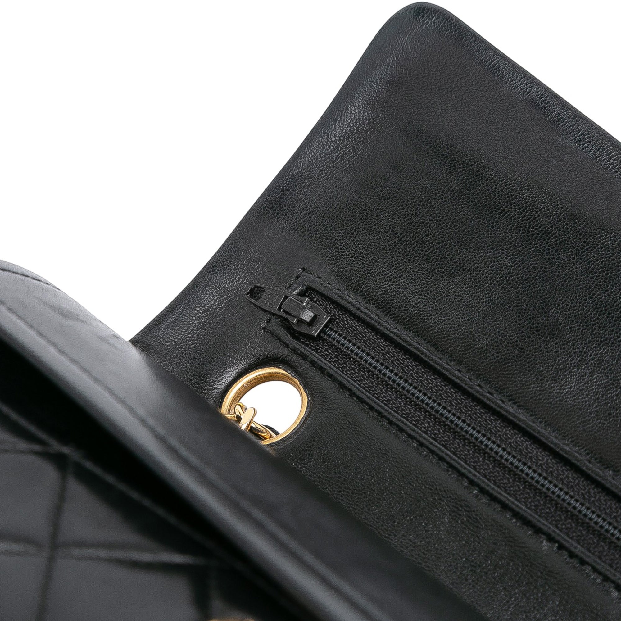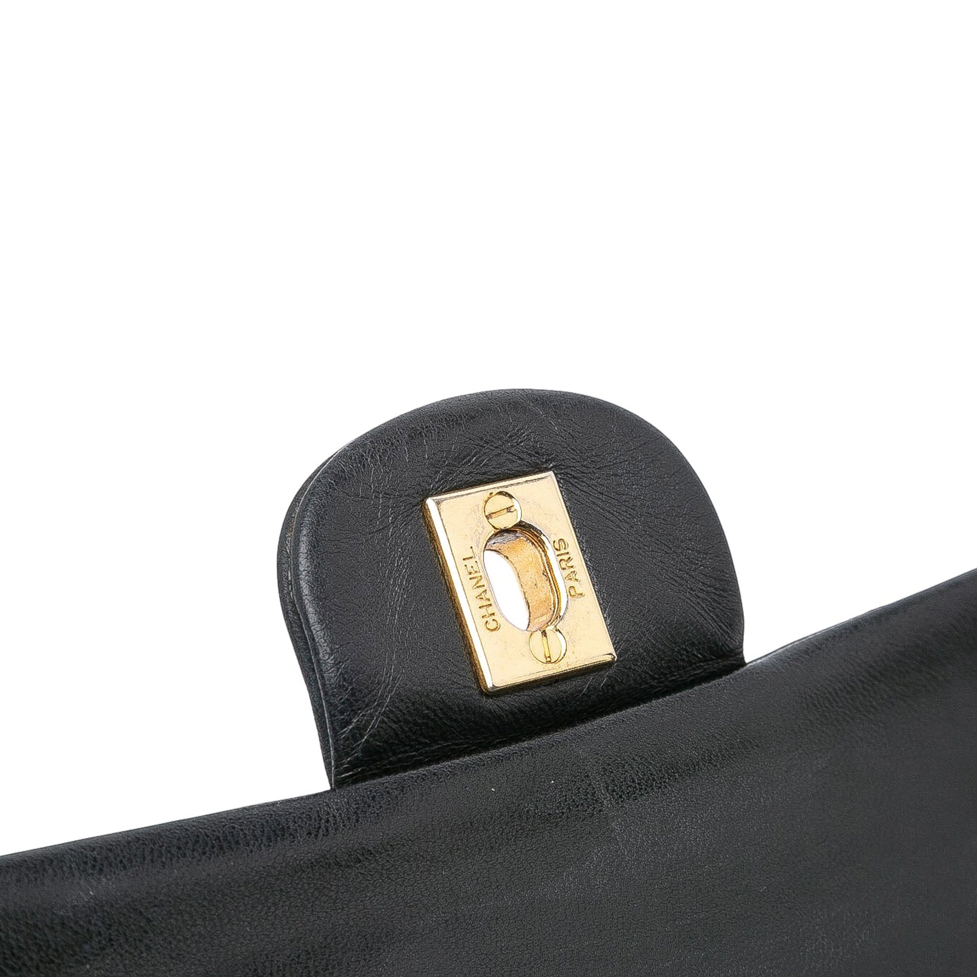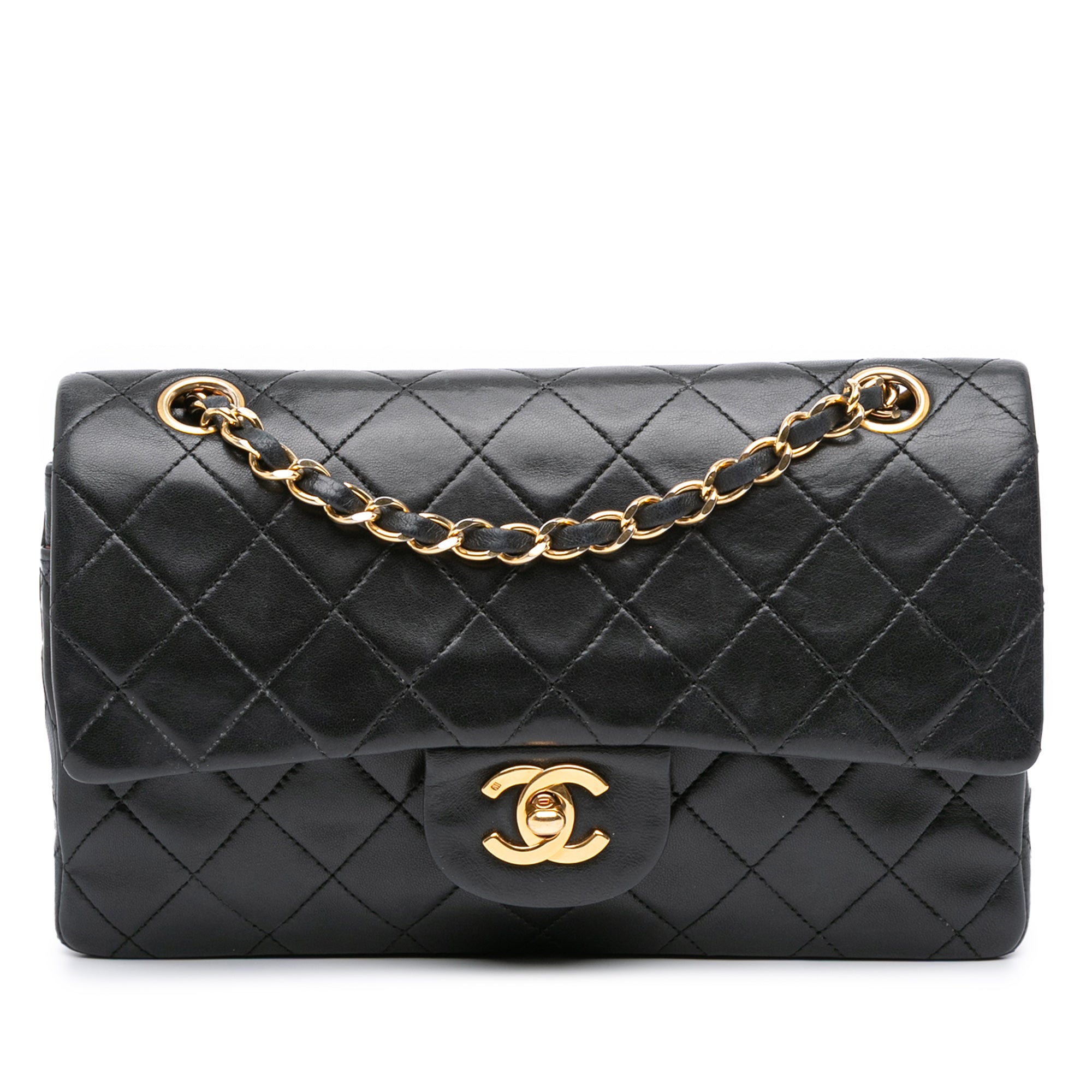 This shoulder bag features a quilted lambskin body, leather woven chain shoulder straps, double front flaps with interlocking Cs and a twist lock closure, an exterior back slip pocket, and interior slip pockets. Retail Price: 10400.00