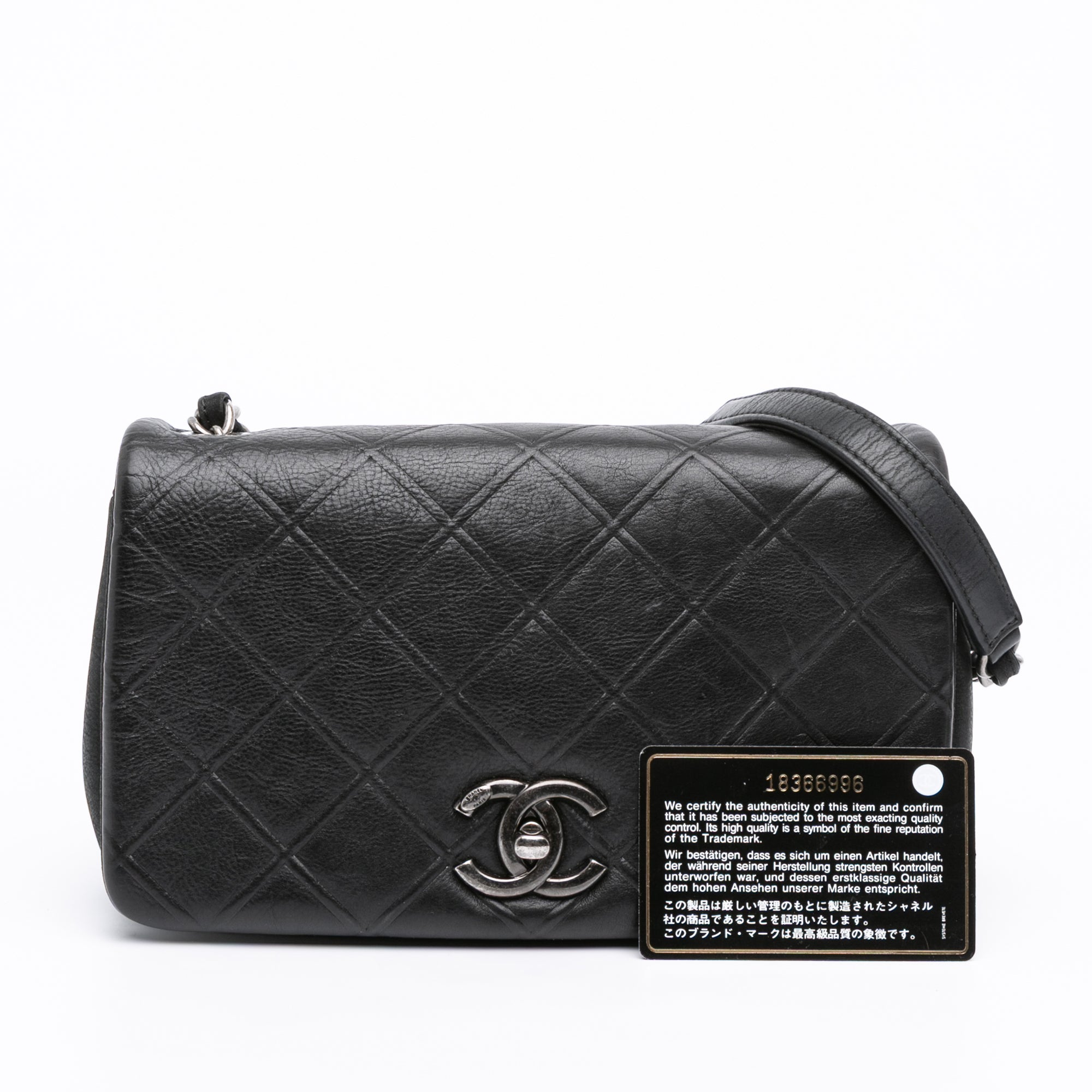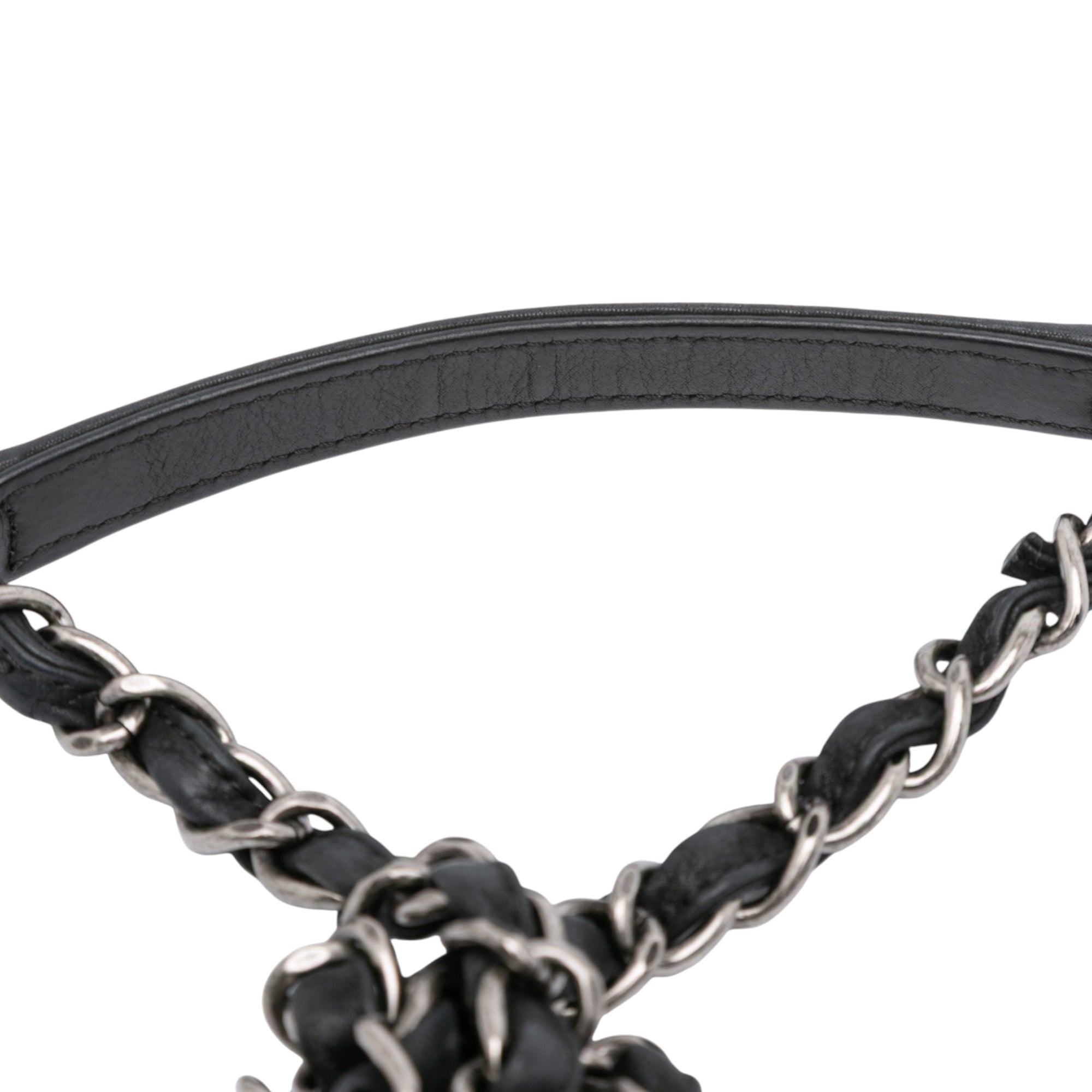 This crossbody bag features an embossed calfskin body, a leather woven chain link strap with leather shoulder guard, a front flap with a CC turn-lock closure, and an interior zip pocket. Inclusion: authenticity card. Retail Price: 3500.00