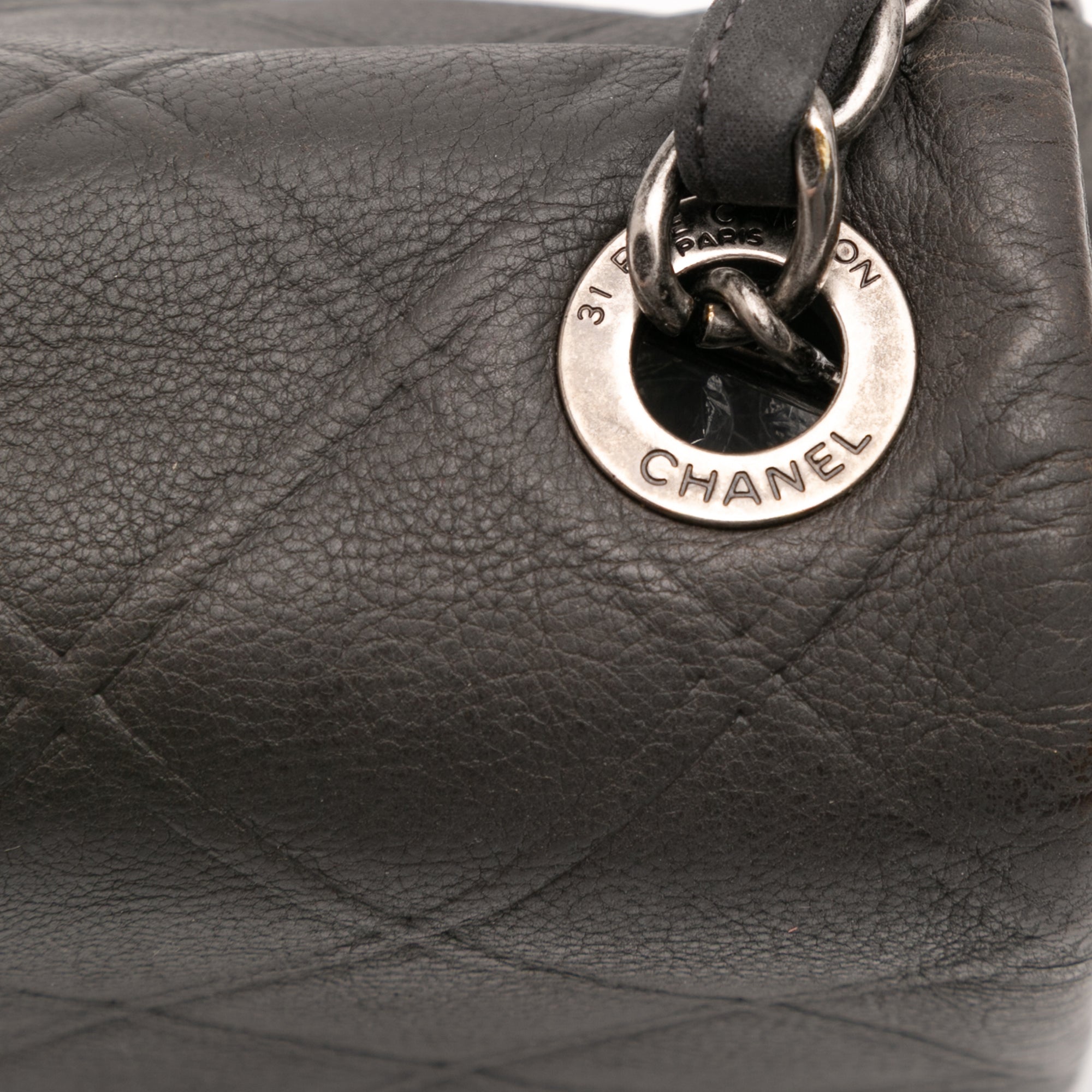 This shoulder bag features an embossed calfskin leather body, leather woven chain link strap with leather shoulder guard, a front flap with a CC turn-lock closure, and an interior zip pocket. Retail Price: 3500.00