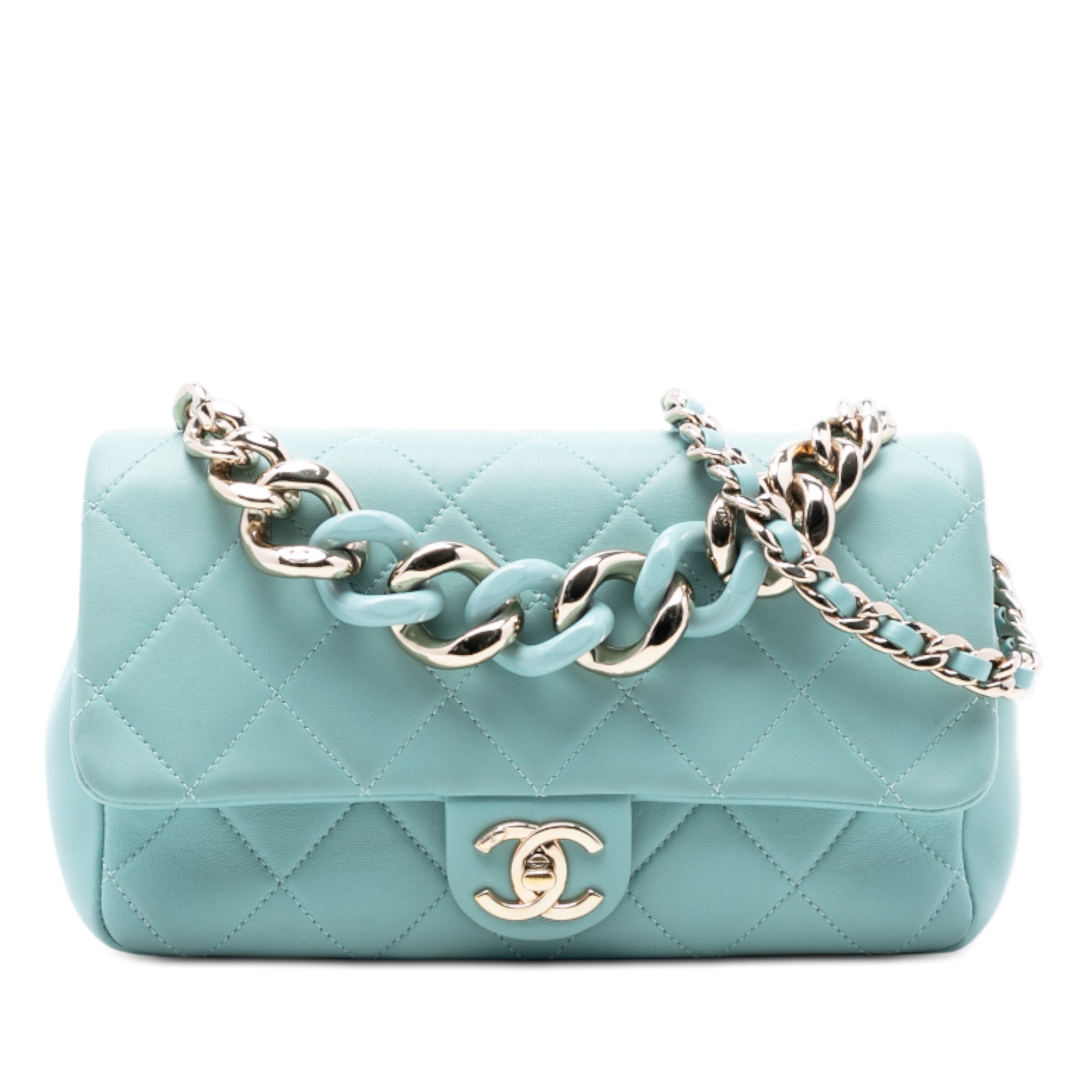 This satchel features a quilted lambskin leather body, an acrylic and metal chain handle, a leather woven chain strap with leather guard, a single front flap with CC turn-lock closure, an exterior back slip pocket, and an interior zip pocket. Retail Price: 5900.00