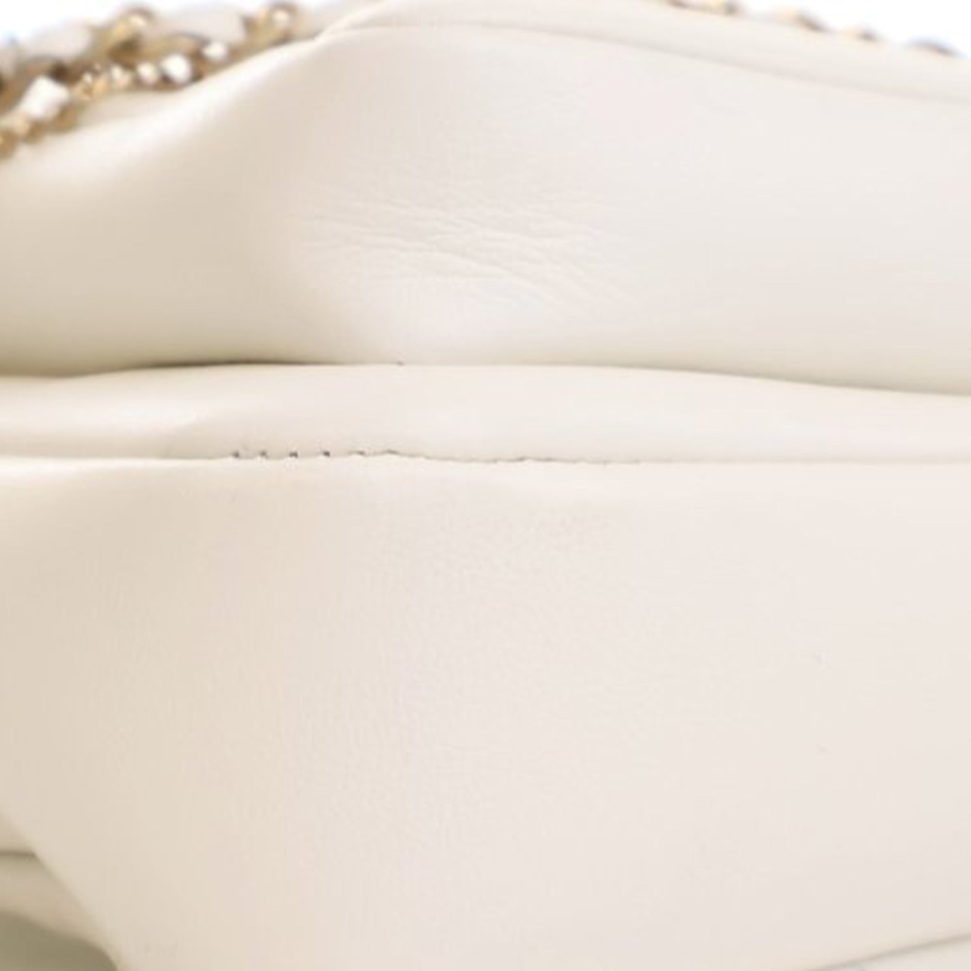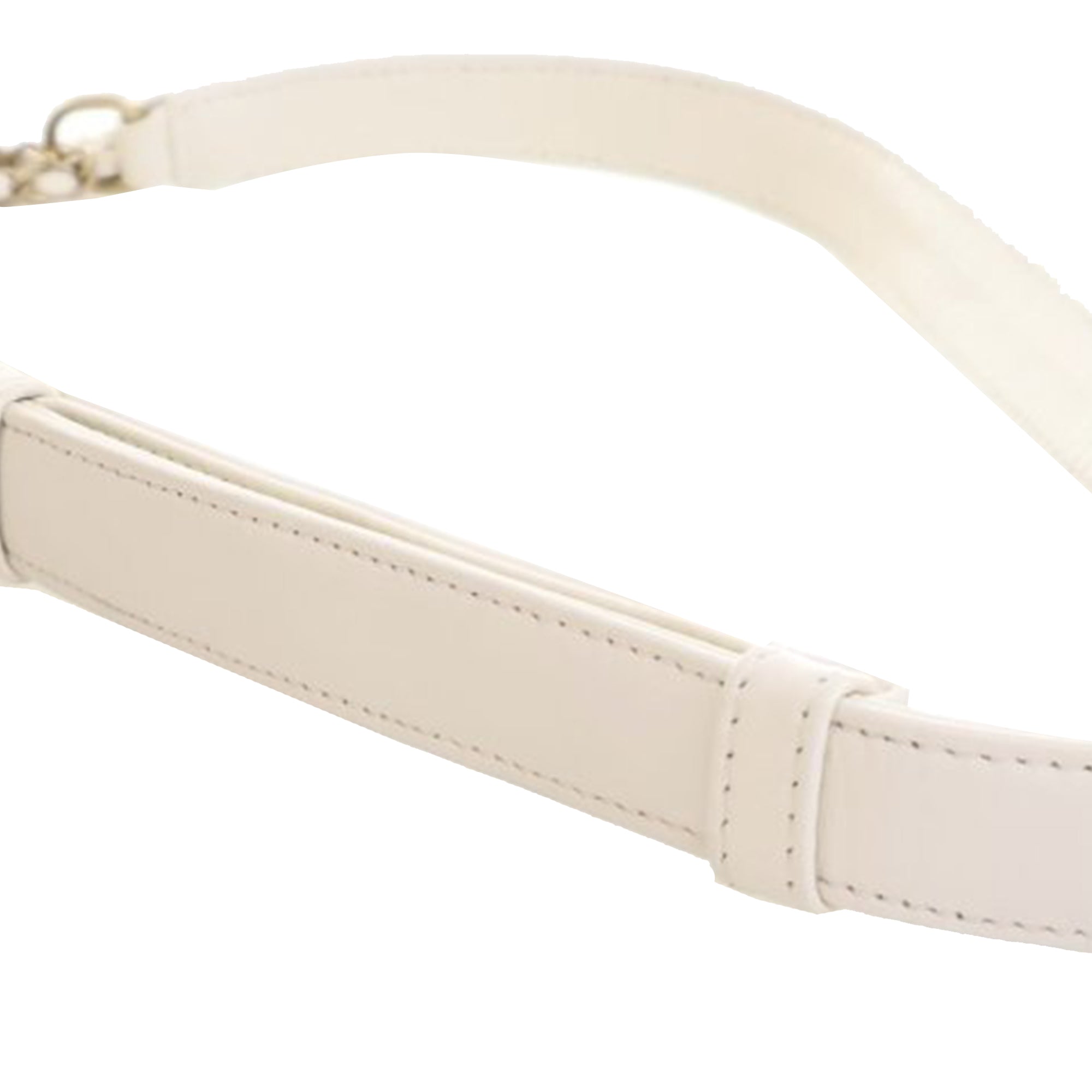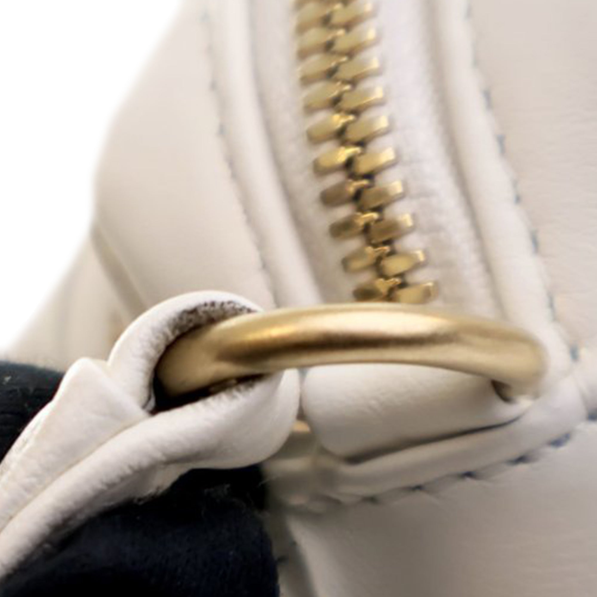 This camera case features a leather body, an adjustable flat leather strap with leather woven chain, a top zip closure, and front exterior zip pockets with chain and leather woven chain. Retail Price: 9900.00
