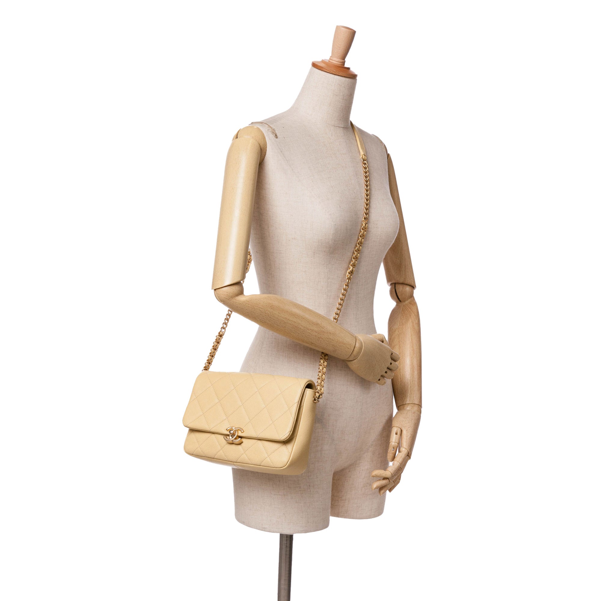 This crossbody bag features a quilted caviar leather body, a leather woven chain shoulder strap with leather guard, a front flap with a twist lock closure, and an interior zip pocket. Inclusion: Dust bag, box. Retail Price: 2900.00
