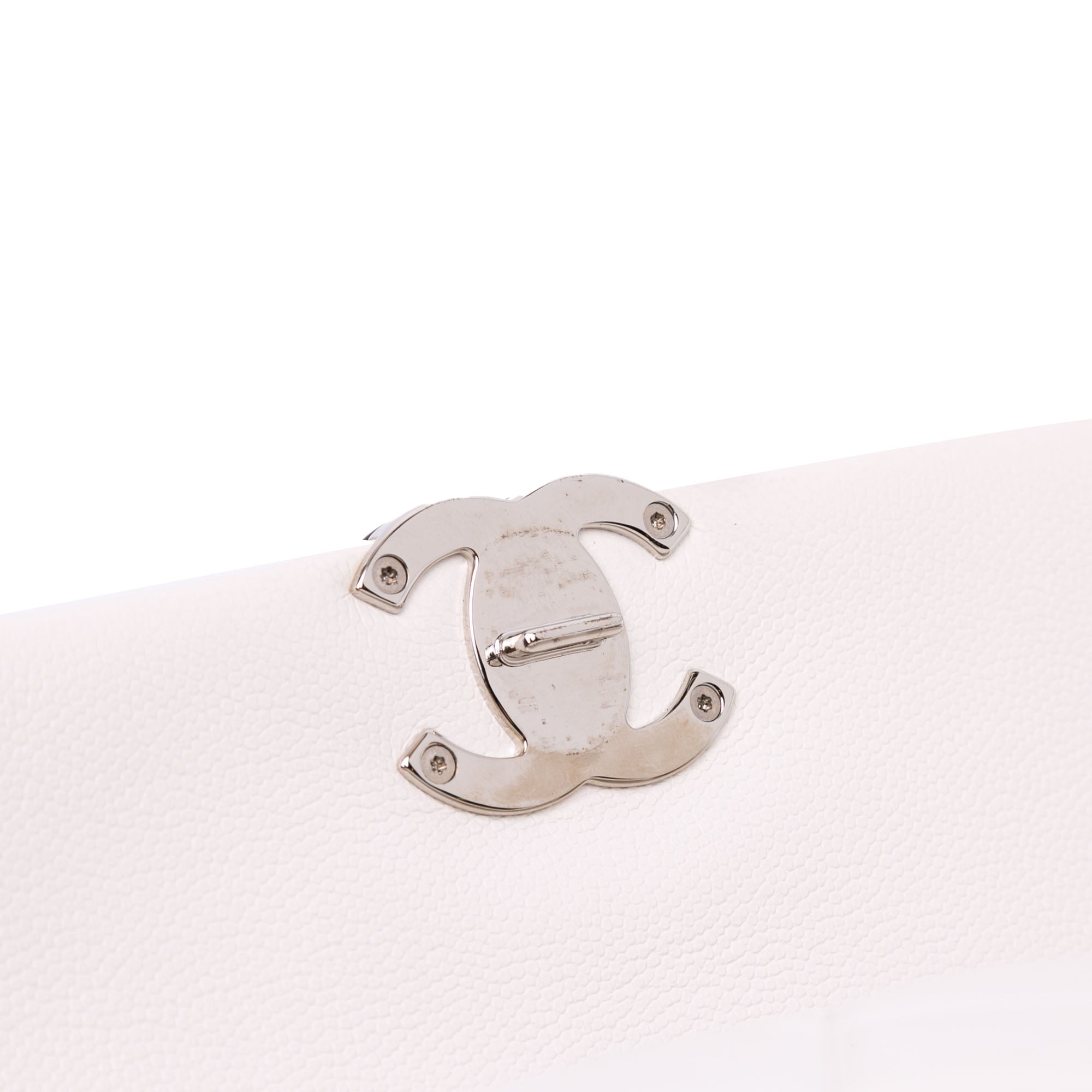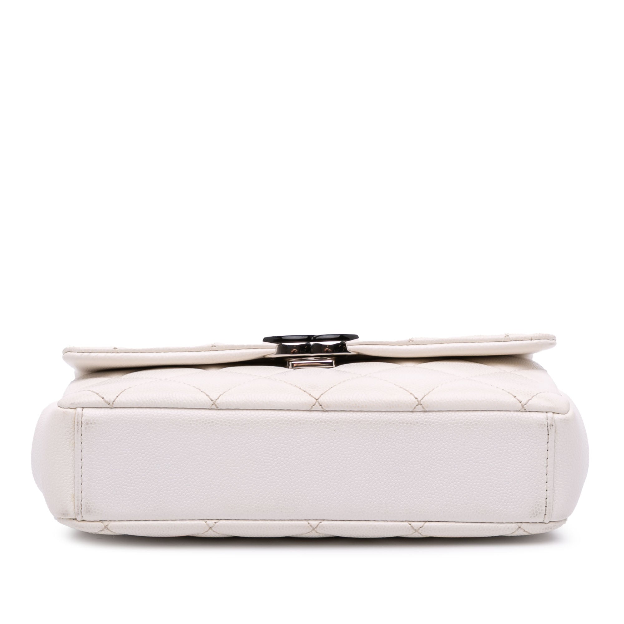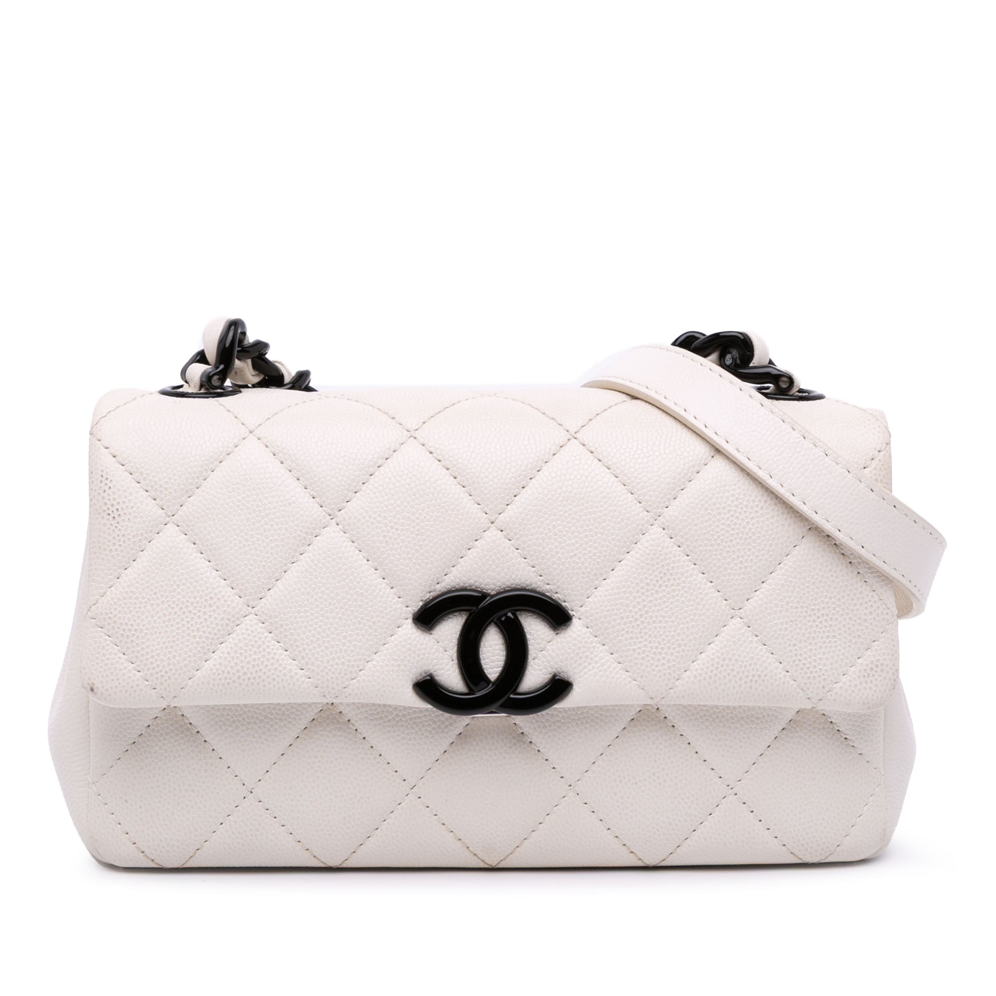 This flap bag features a quilted caviar leather body, a leather-woven chain strap with leather shoulder guard, a front flap with clasp closure, an exterior back slip pocket, and an interior zip pocket. Inclusion: authenticity card. Retail Price: 5330.00