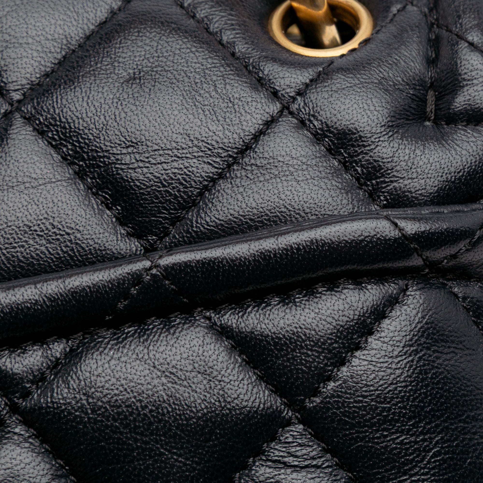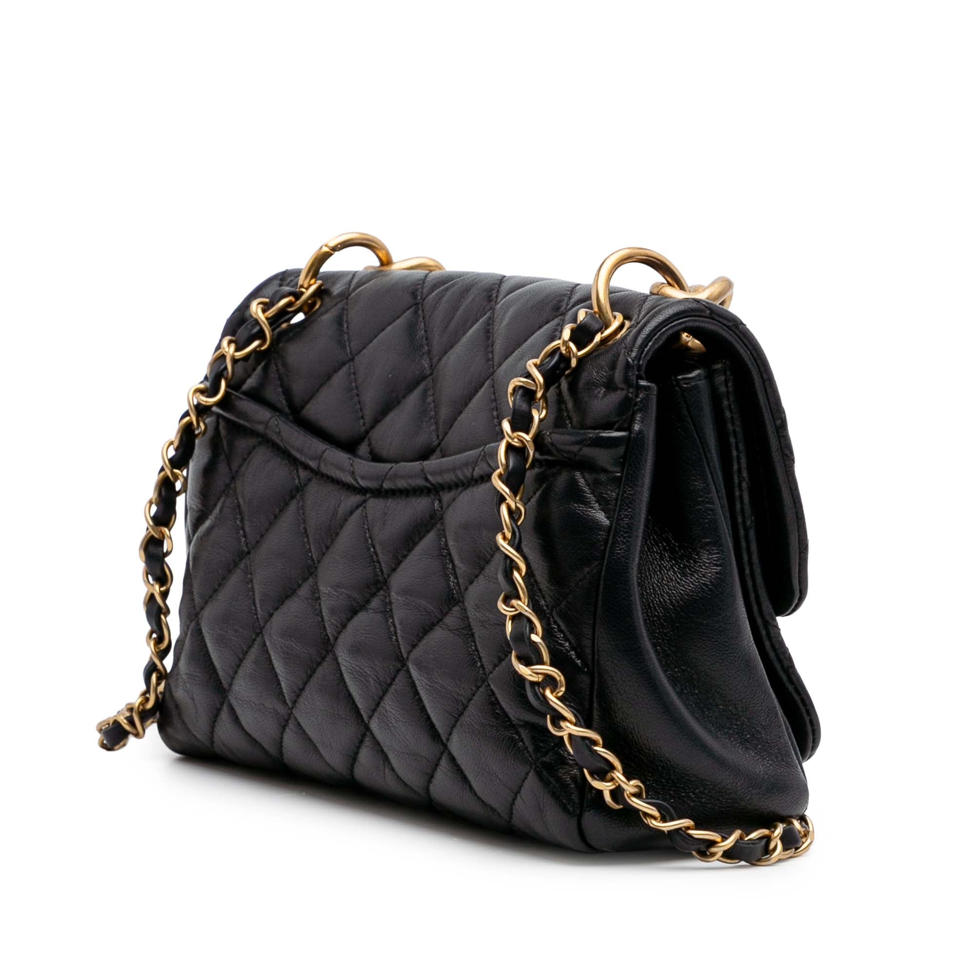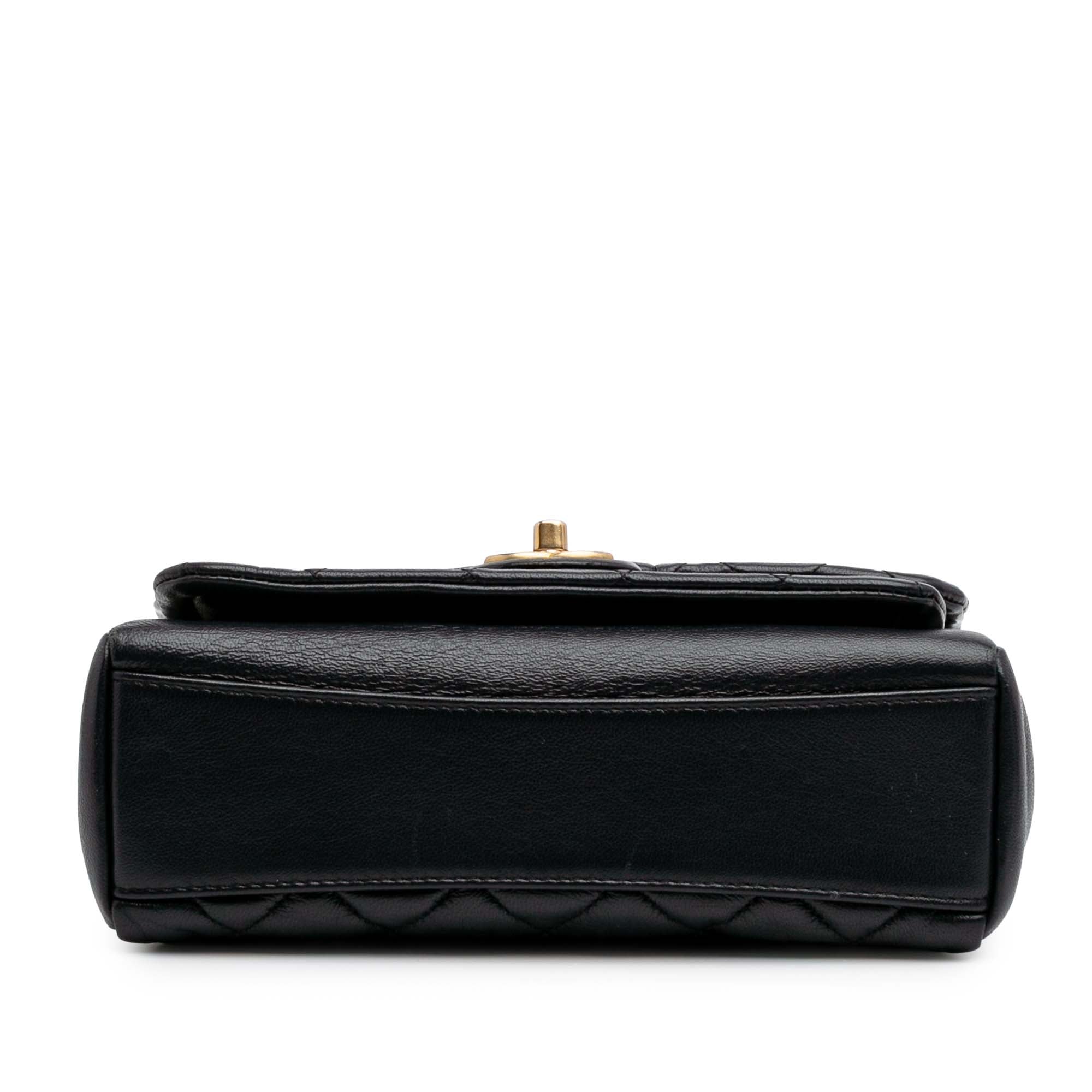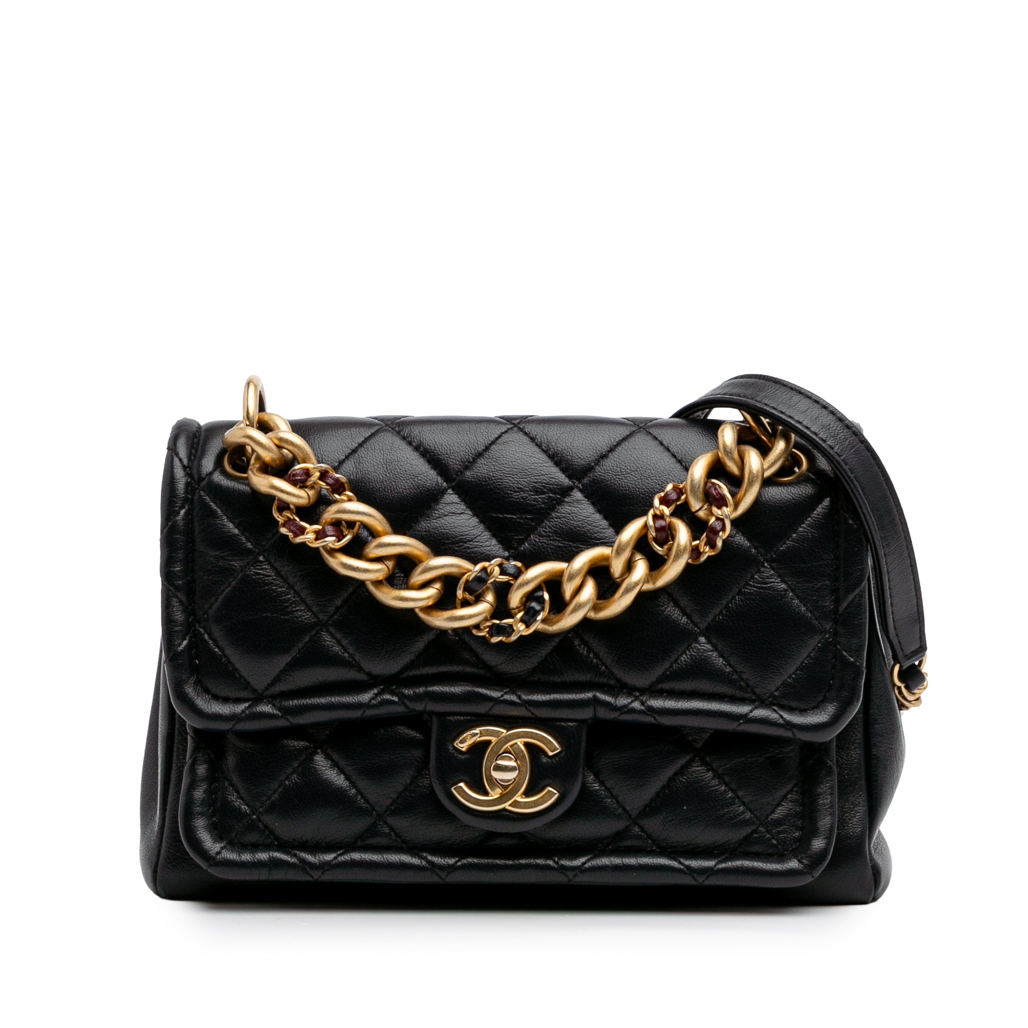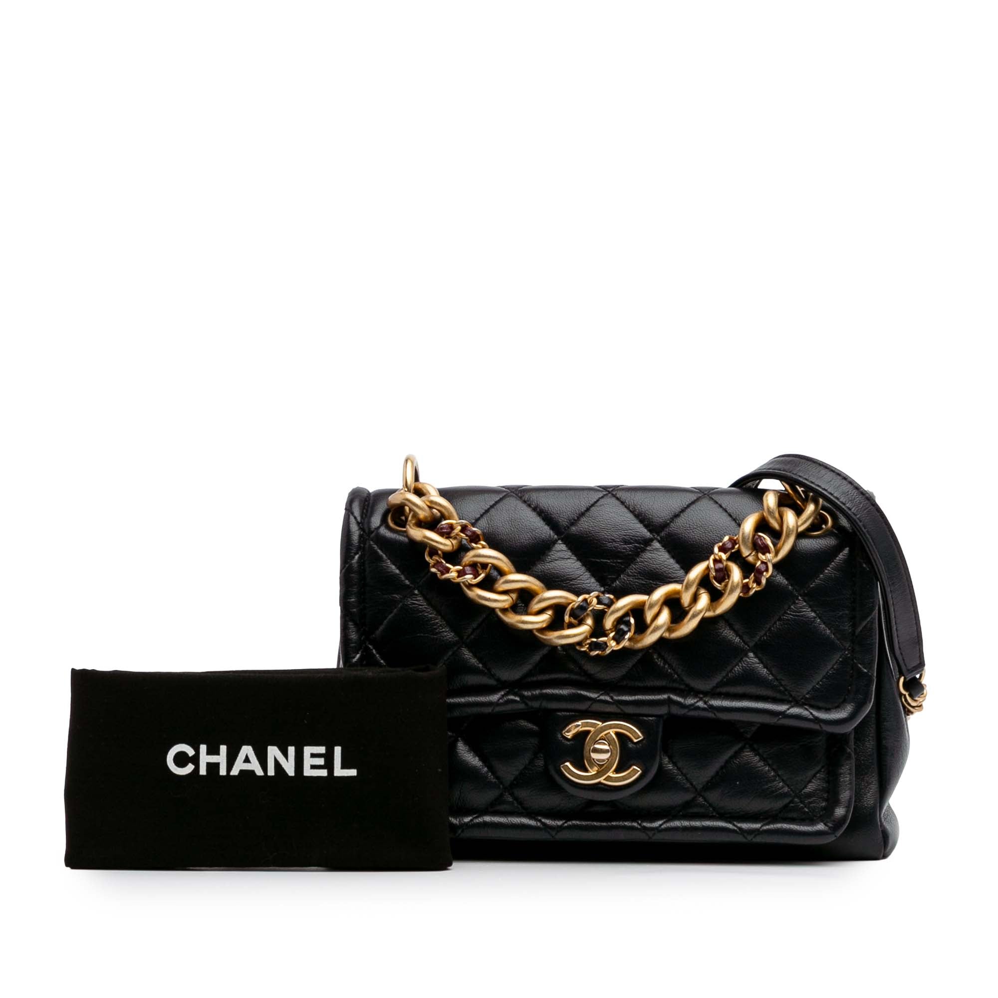 This flap bag features a quilted lambskin leather body, a chain link handle with leather woven chain links, a leather woven chain strap with leather guard, a front flap with CC turn-lock closure, an exterior back slip pocket, and interior zip and slip pockets. Inclusion: Dust bag. Retail Price: 5540.00