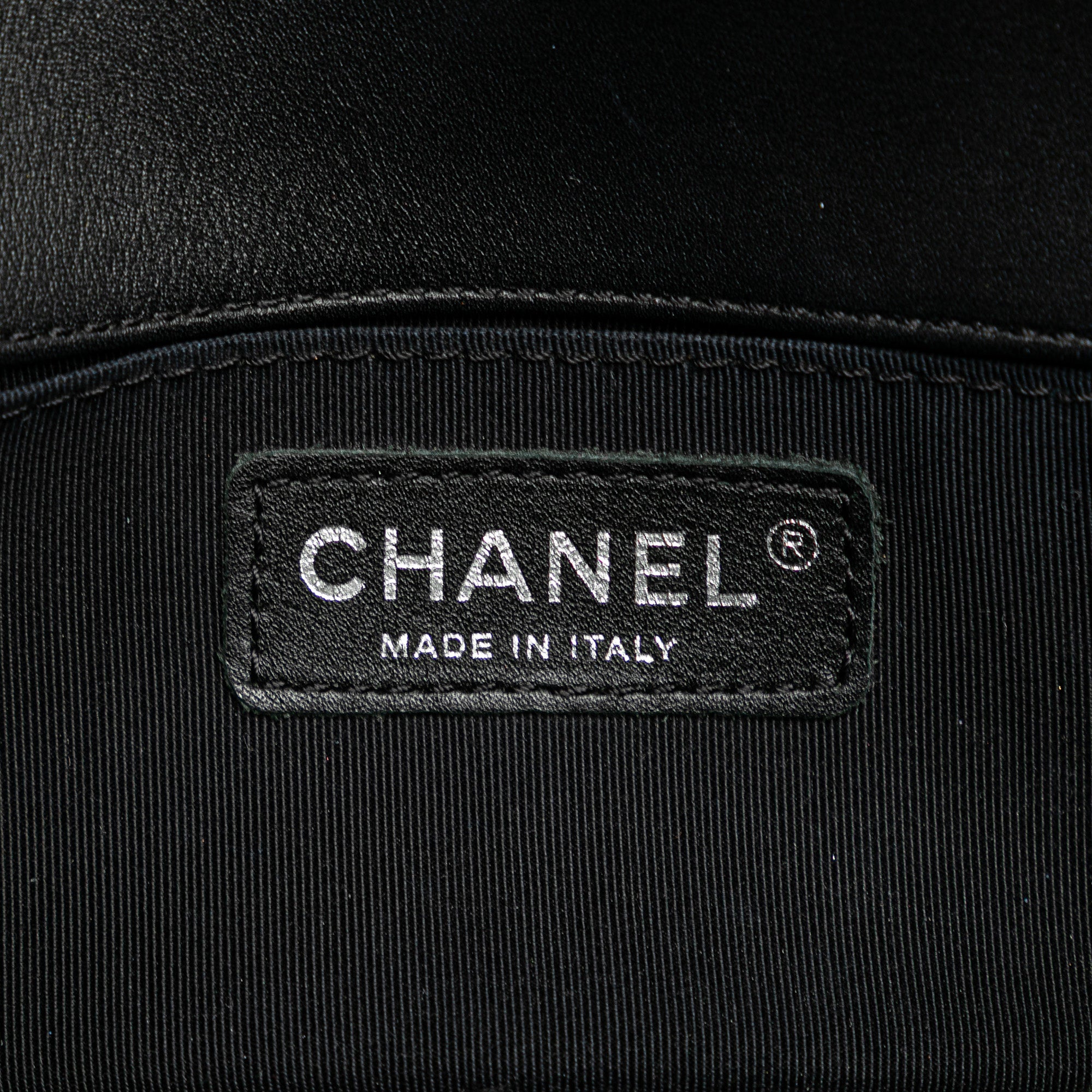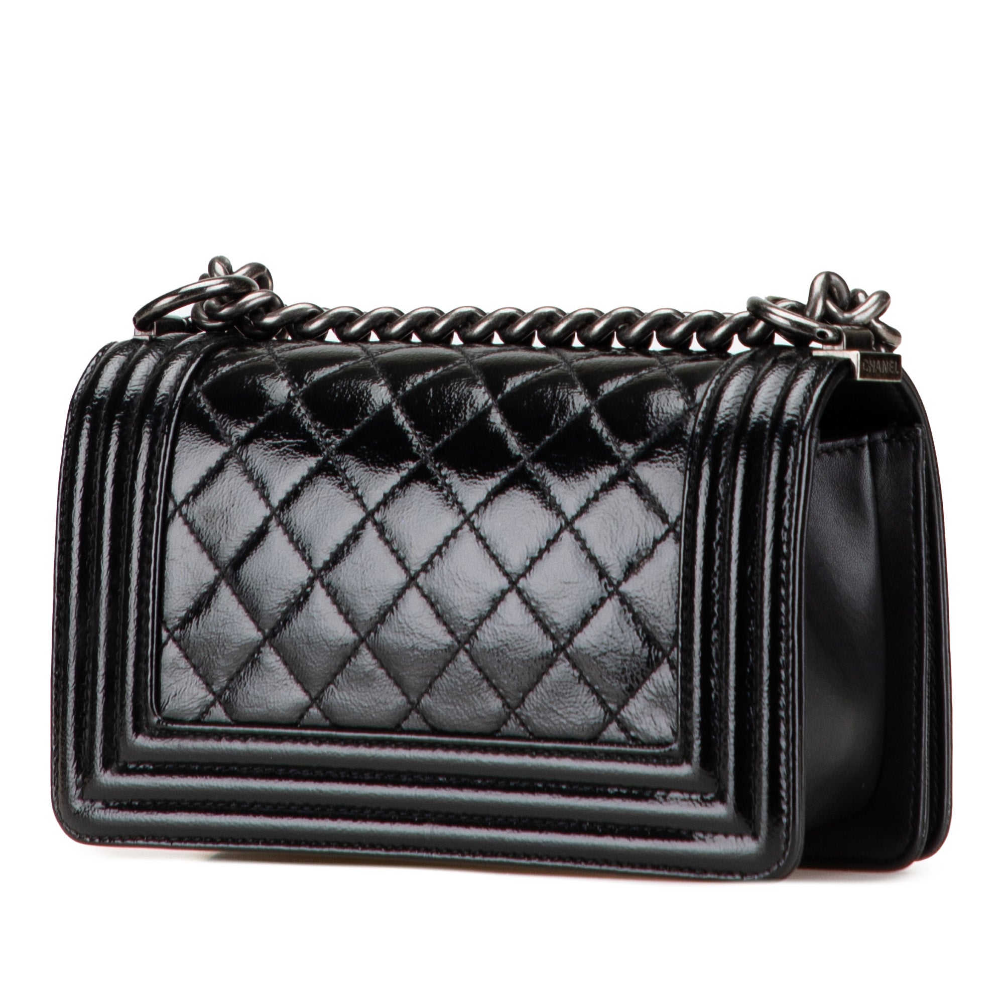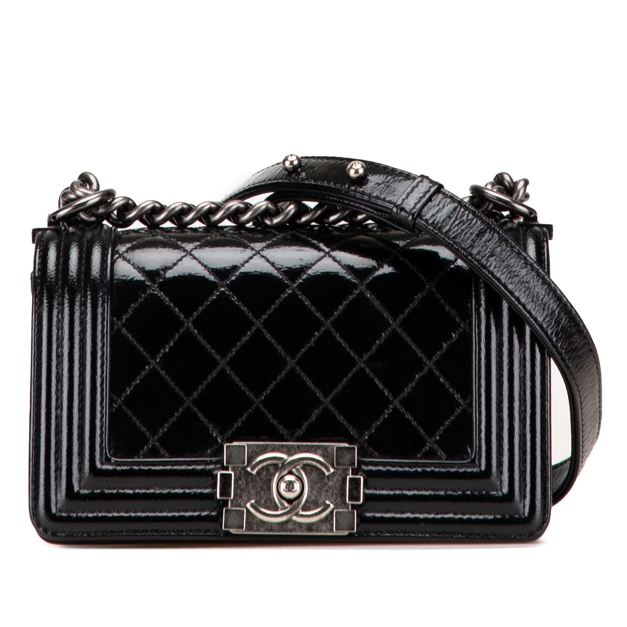 The Boy flap features a quilted patent leather body, a curb chain strap, a front flap with a push lock closure, and an interior slip pocket. Retail Price: 5400.00