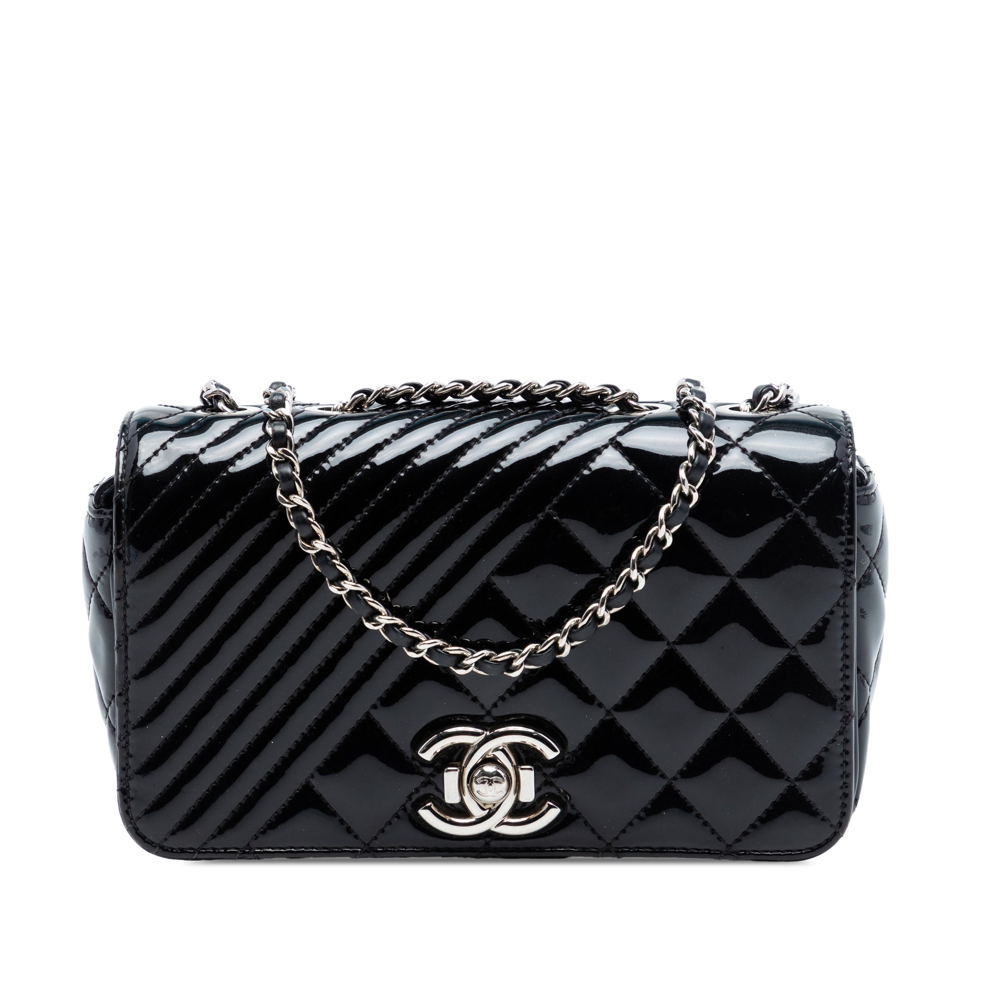 The Coco Boy Flap Bag features a quilted patent leather body, leather-woven chain straps, a front flap with push lock closure, and an interior zip pocket. Retail Price: 3700.00