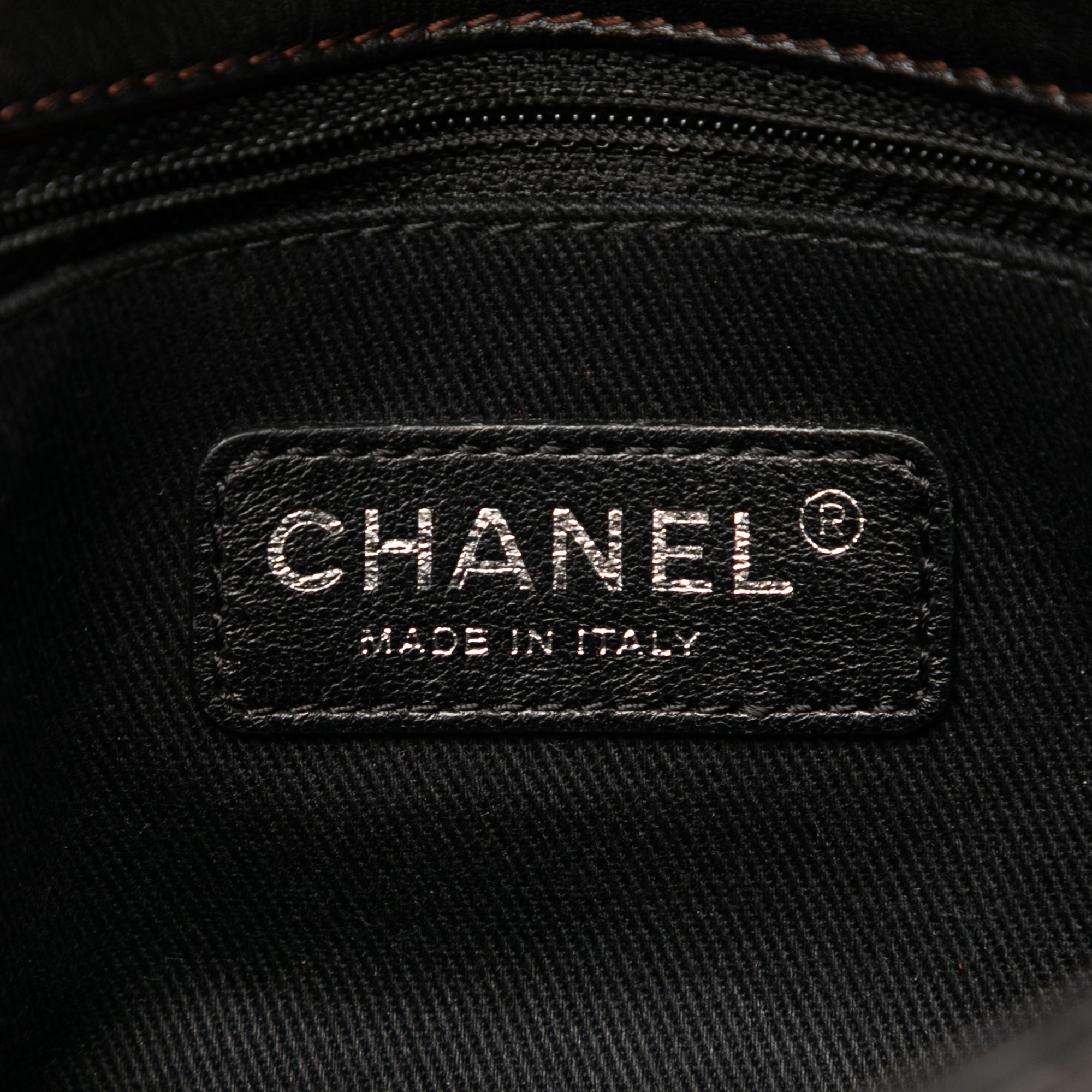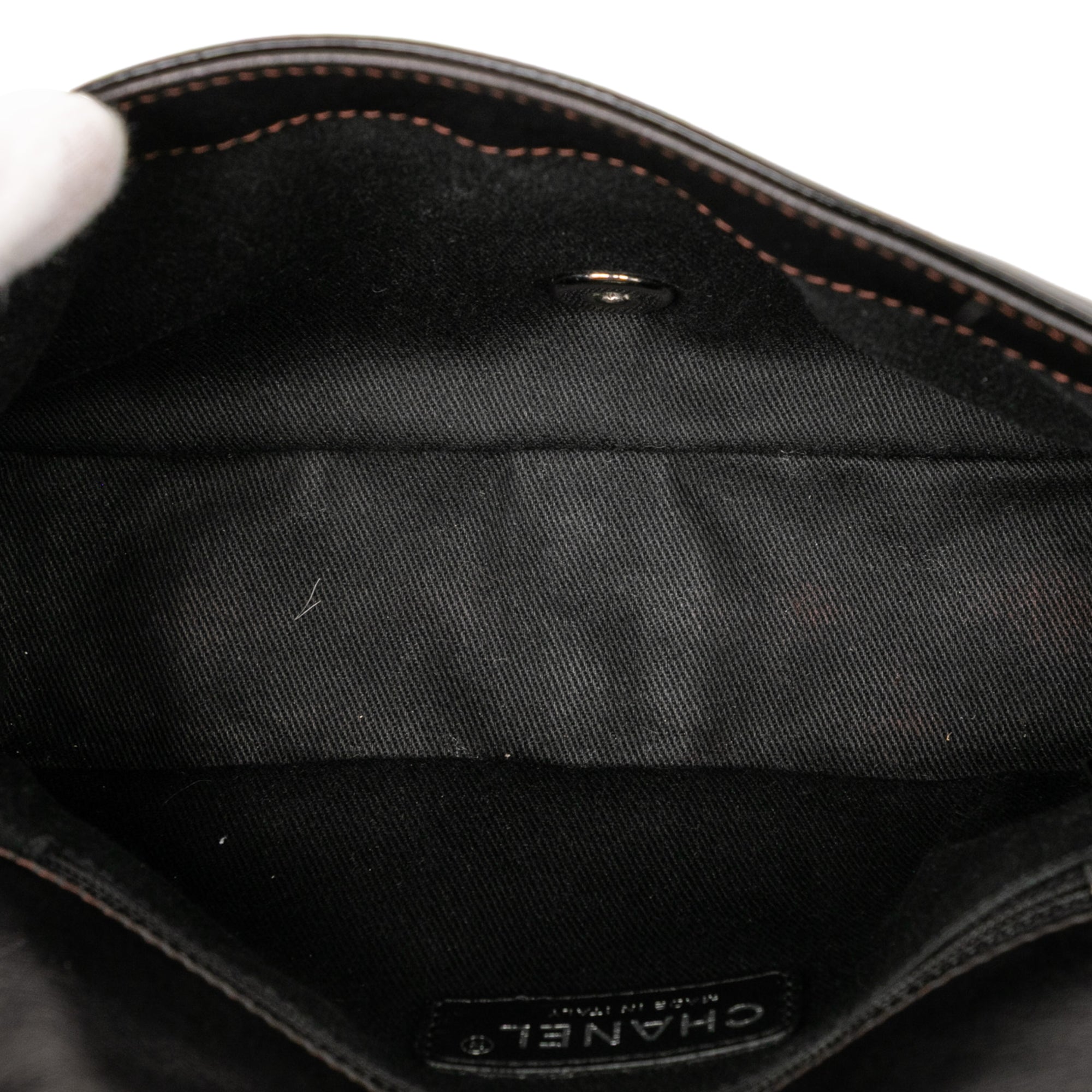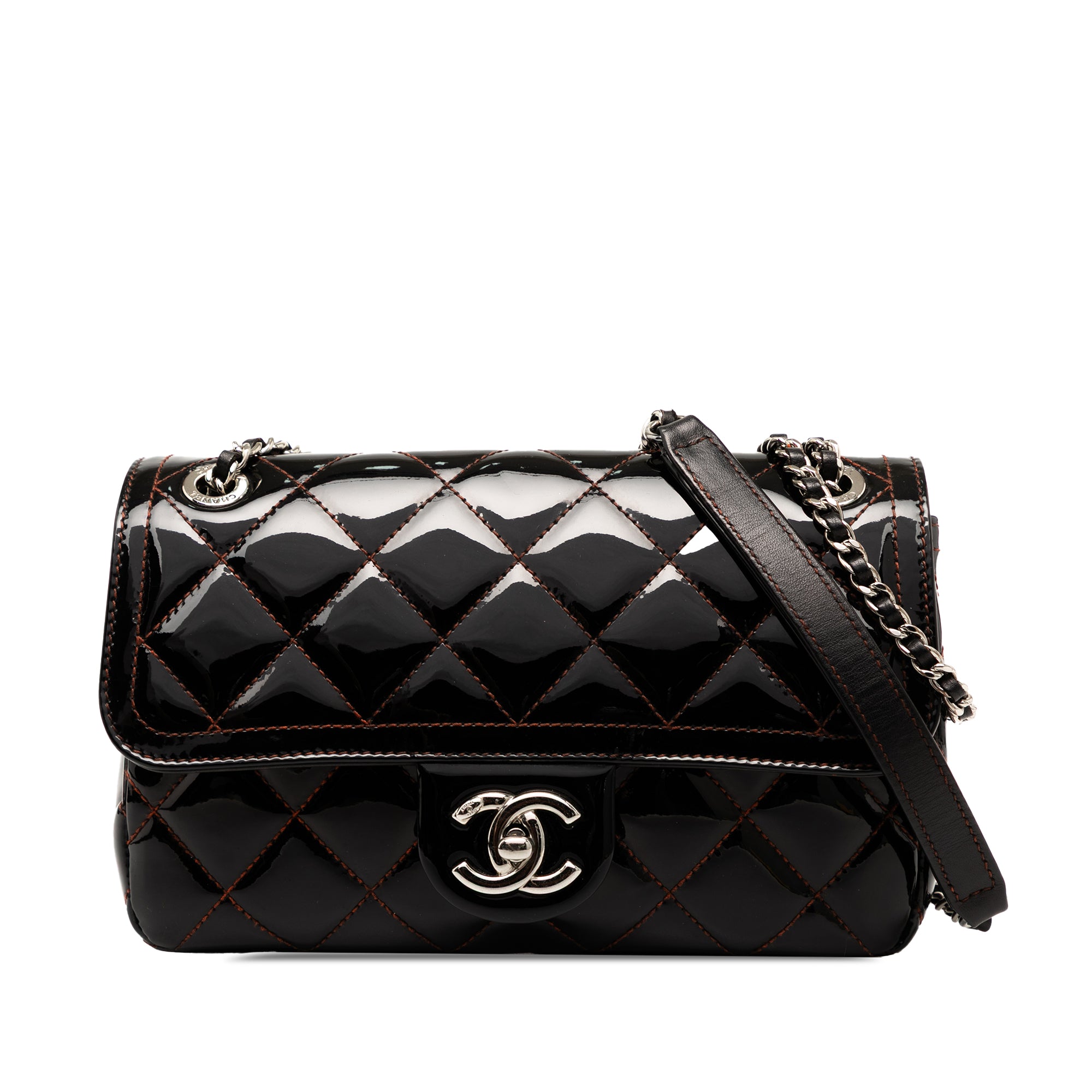 This shoulder bag features a quilted patent leather body, a leather-woven chain strap with leather guard, a top flap with CC turn lock closure, an interior zip compartment, and an interior zip pocket. Retail Price: 3100.00