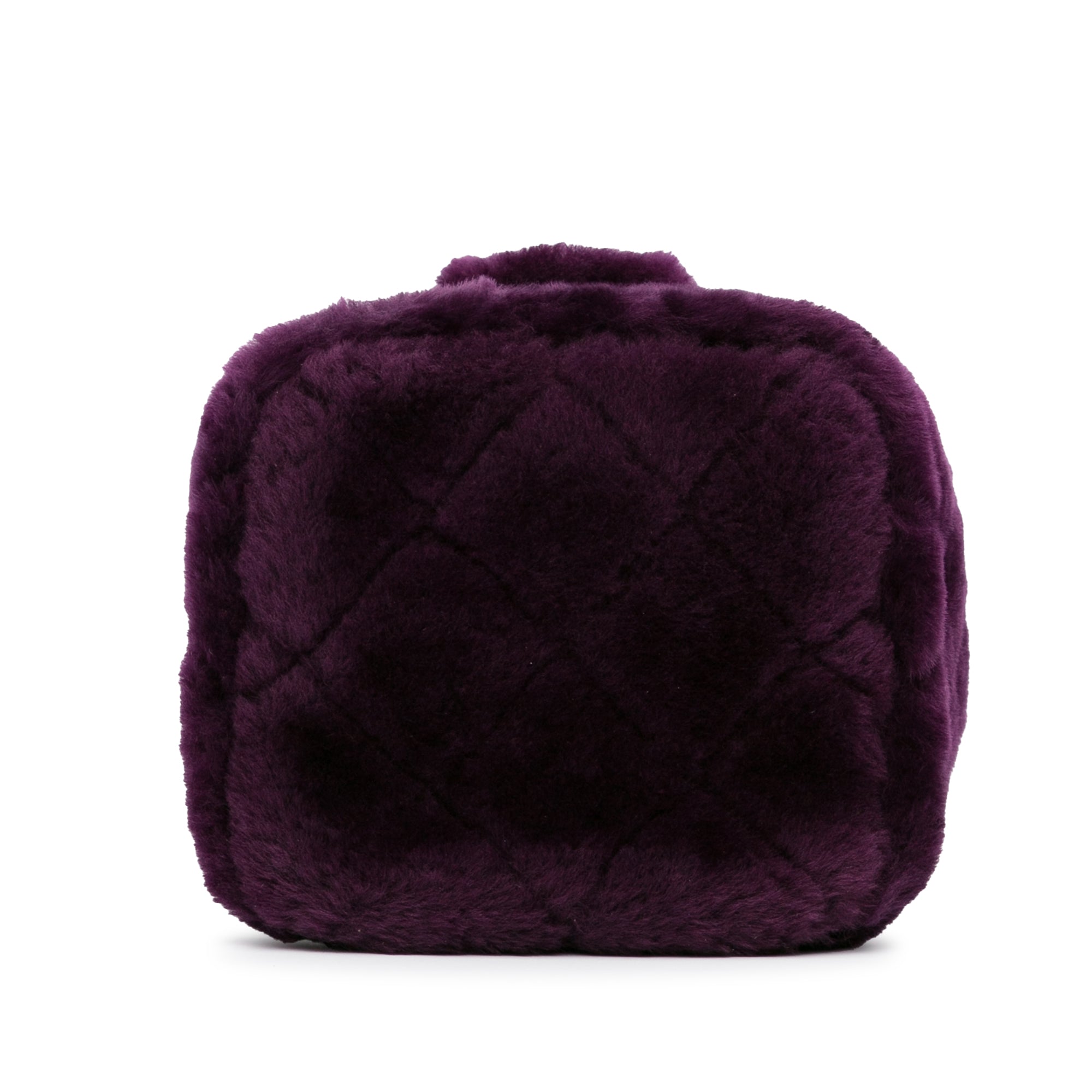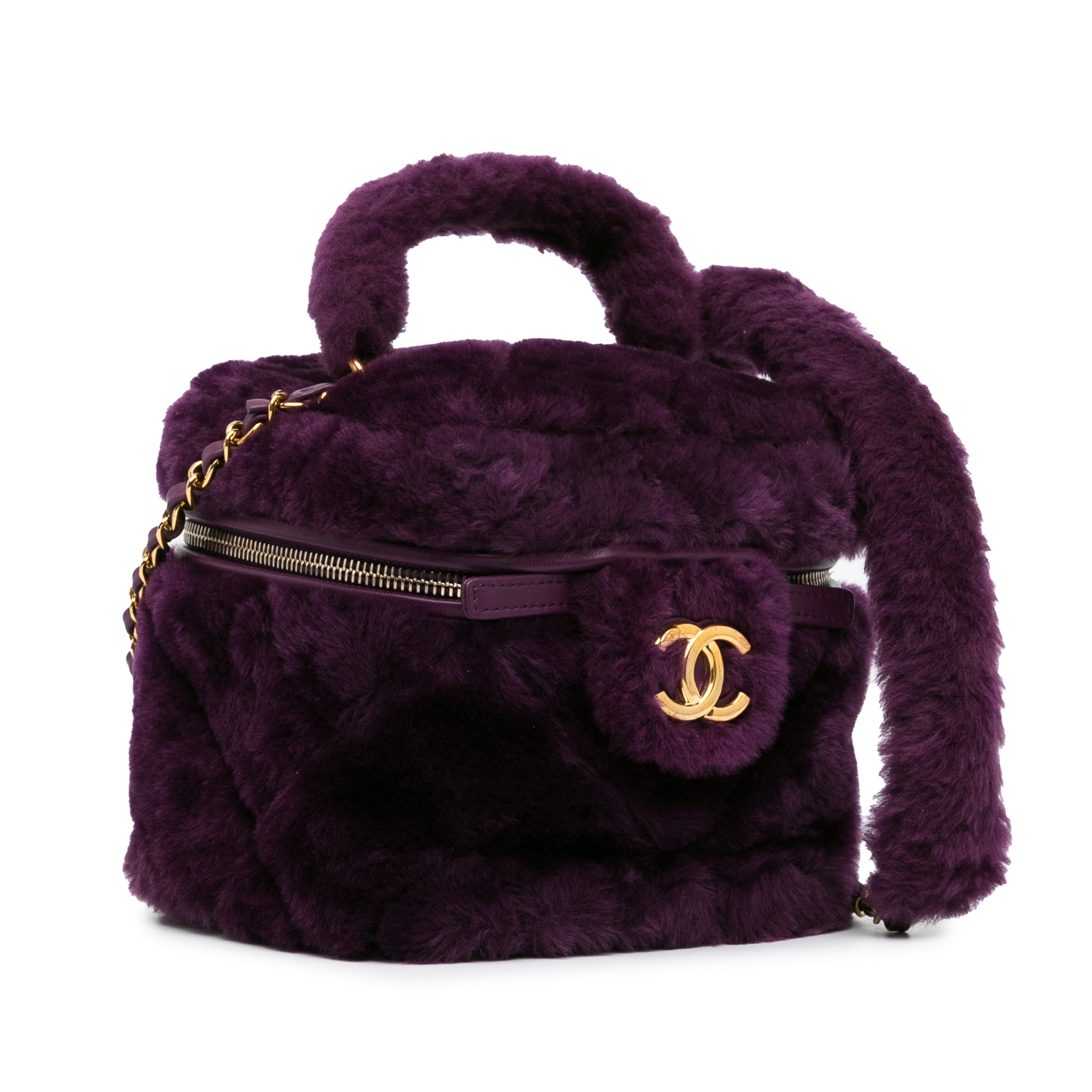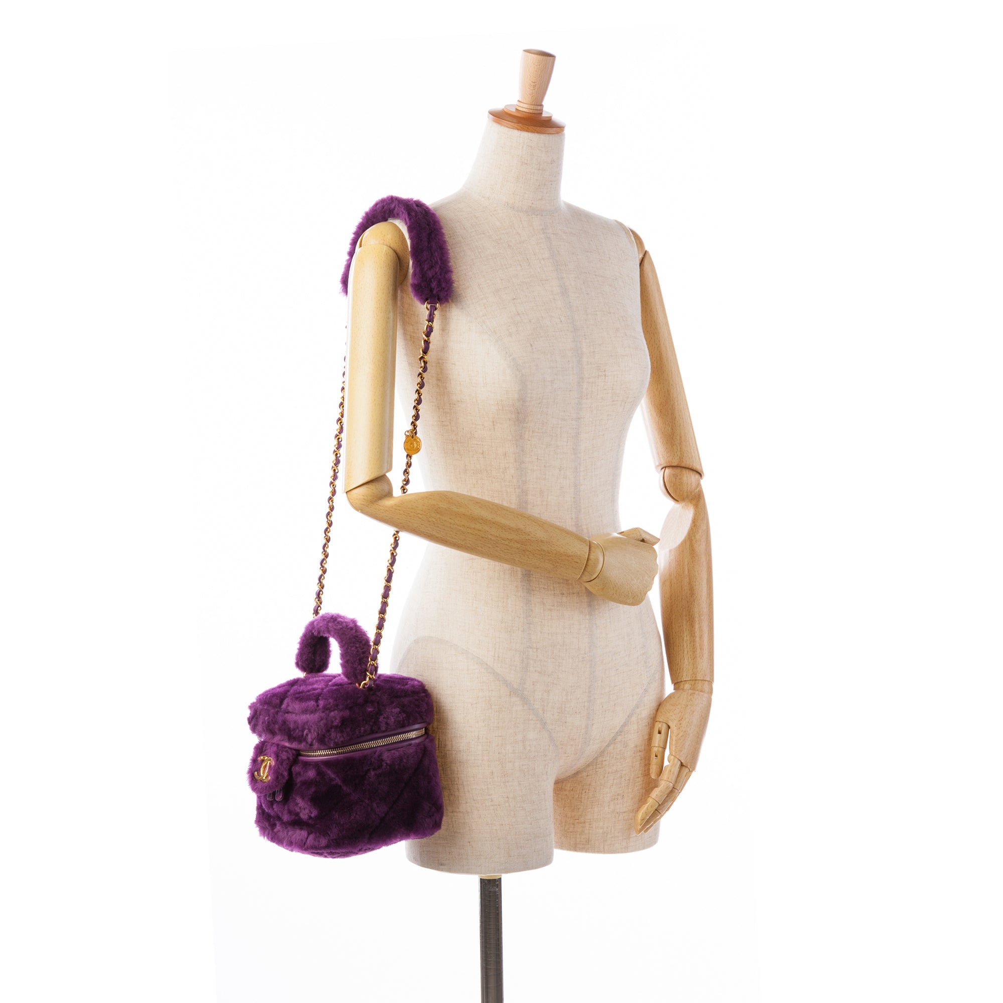 This vanity case features a quilted shearling body with leather trim, a rolled shearling top handle, a leather-woven chain shoulder strap with a shearling guard, a zip-around closure, and interior slip pockets. Retail Price: 4910.00