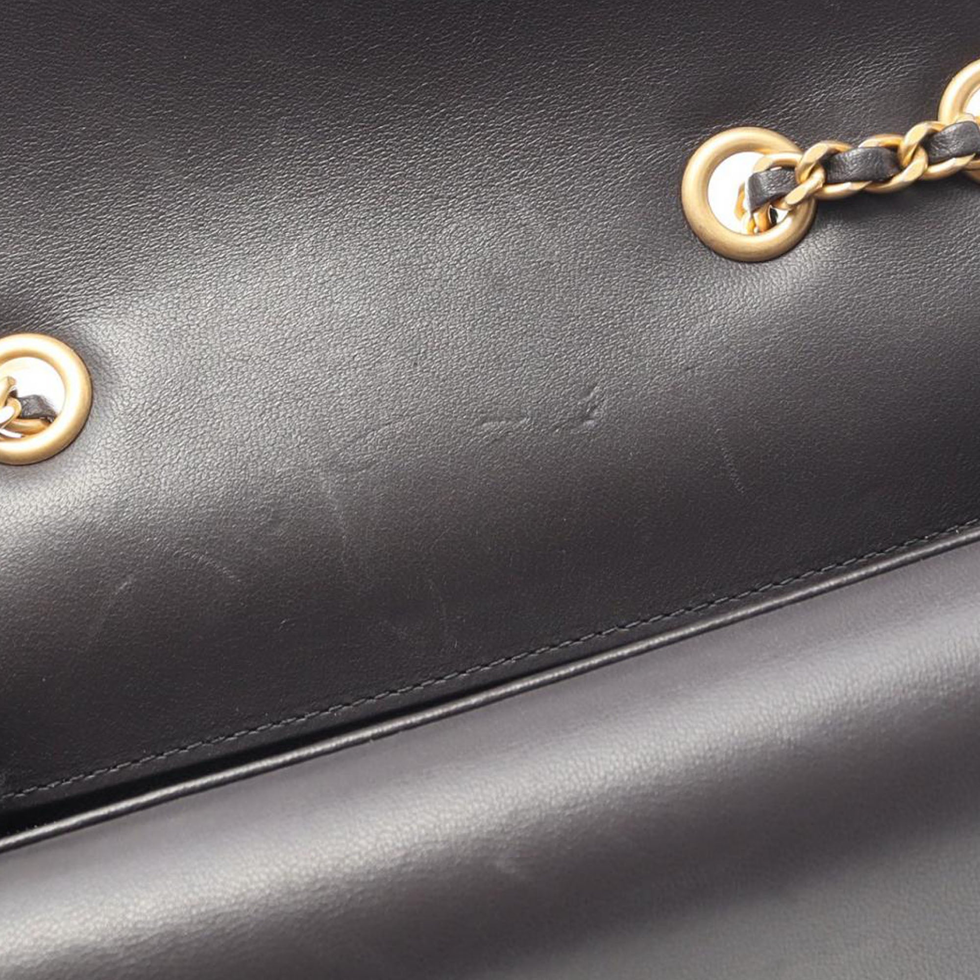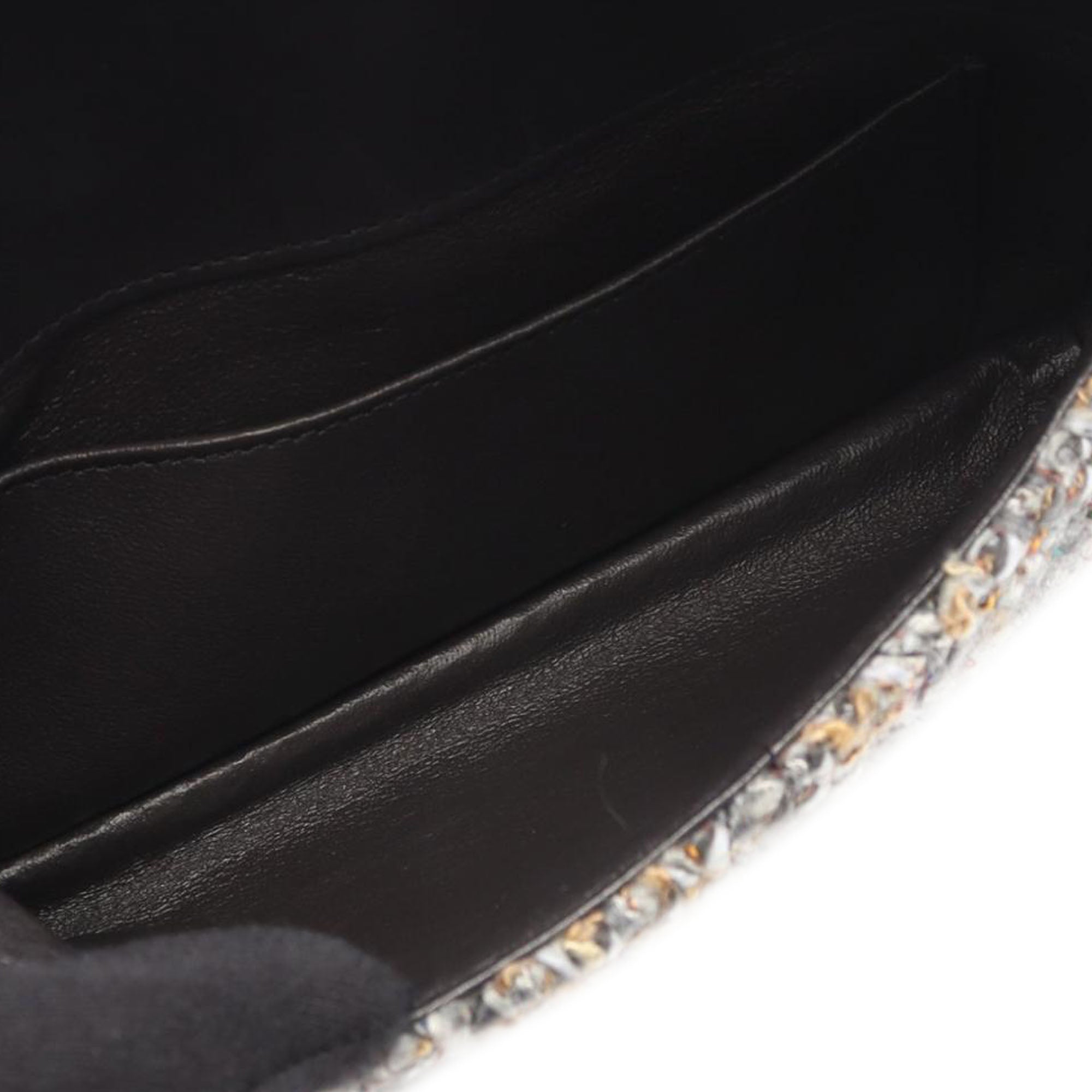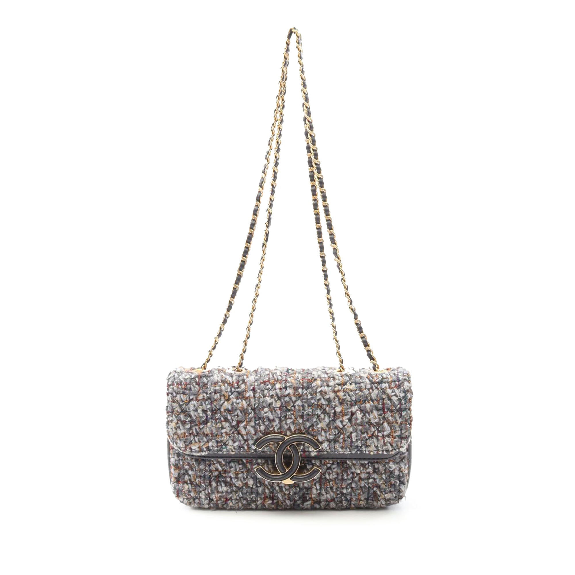 This shoulder bag features a quilted tweed body, leather woven chain straps, double front flaps with a push lock closure, two interior compartments, and interior zip and slip pockets. Retail Price: 5518.00