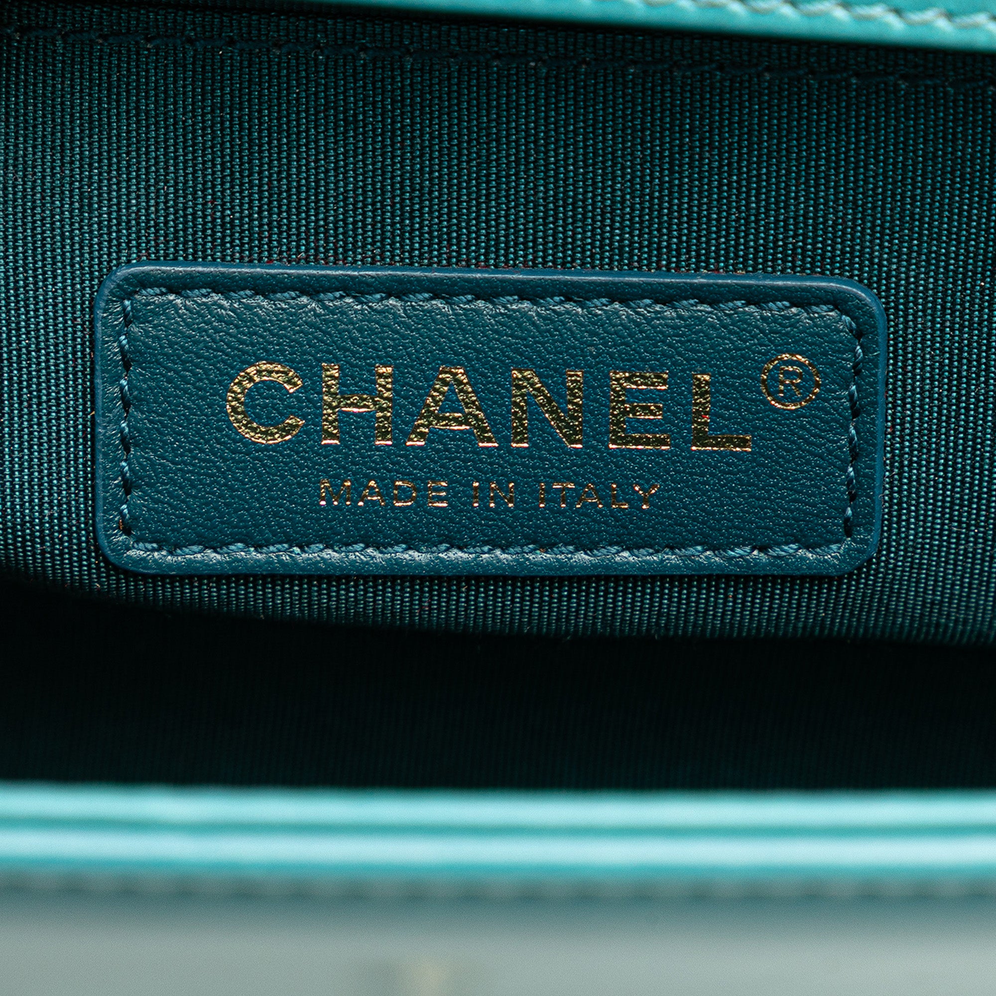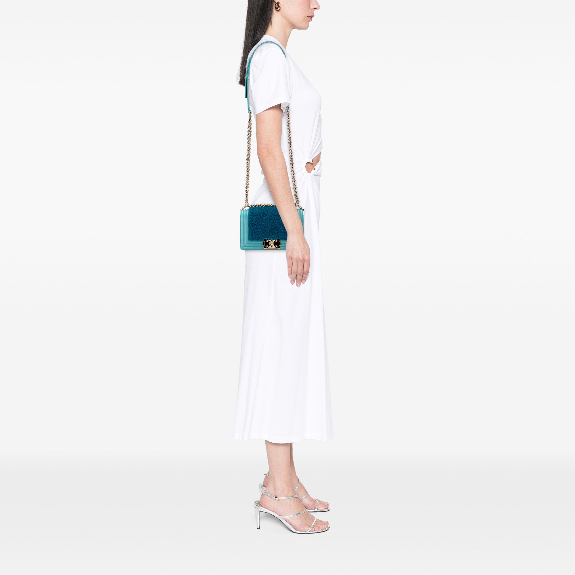 The Boy flap features a fur body with leather trim, a gold-tone curb chain and adjustable leather strap, a front flap with push lock closure, and an interior slip pocket. Inclusion: authenticity card. Retail Price: 4400.00