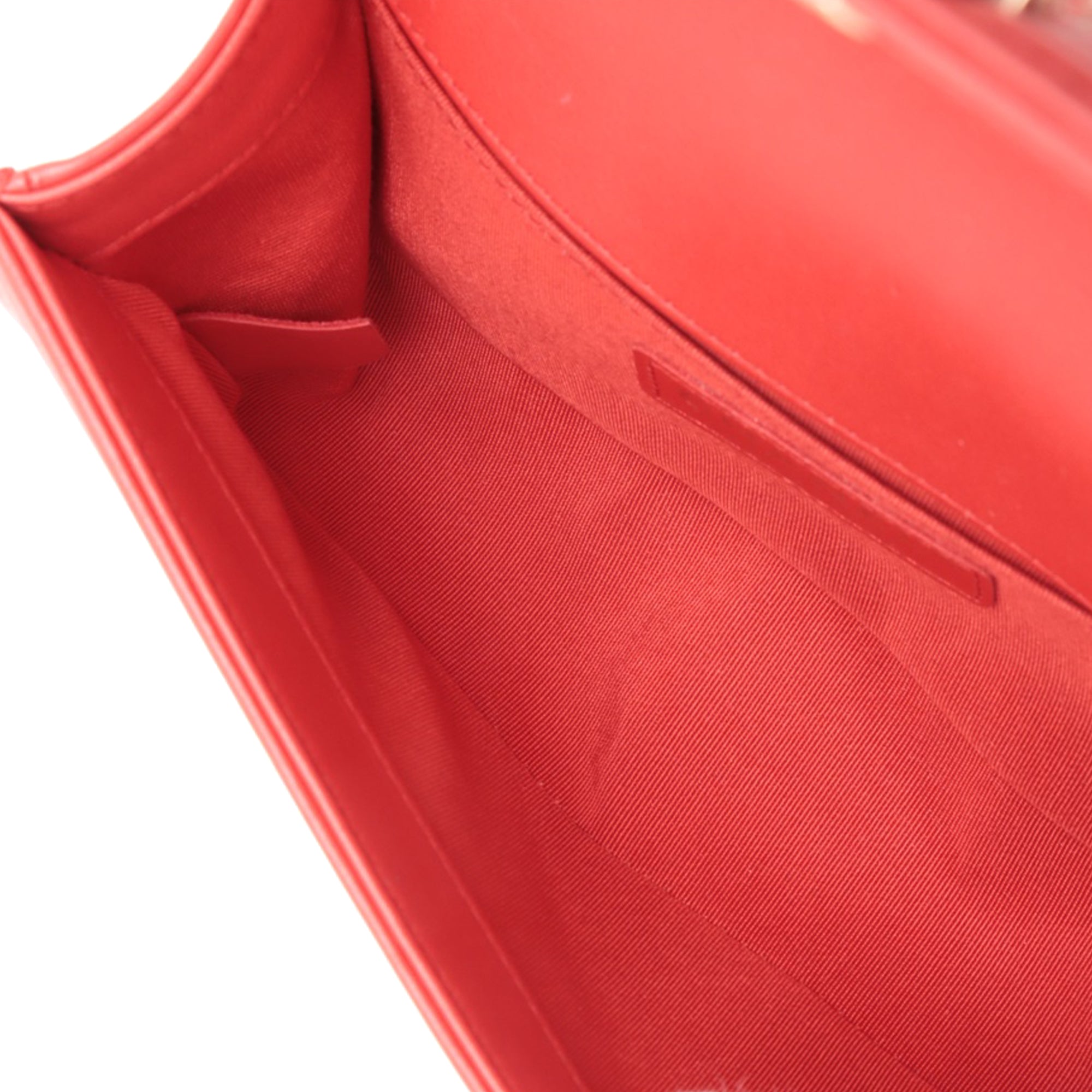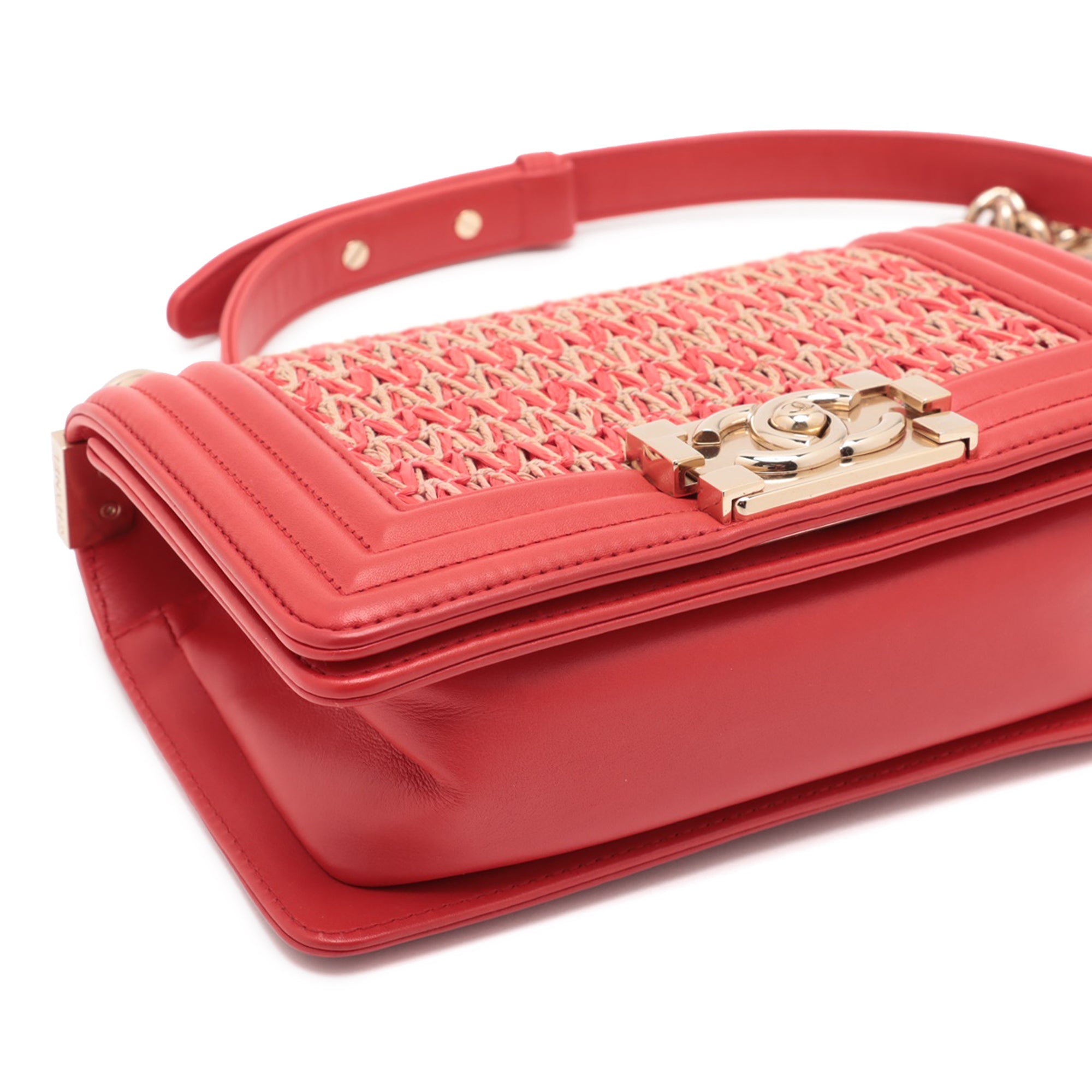 The Boy Flap bag features a woven straw and lambskin leather body, a chain link and leather shoulder strap, a flap with push-lock closure, and an interior slip pocket. Retail Price: 3700.00