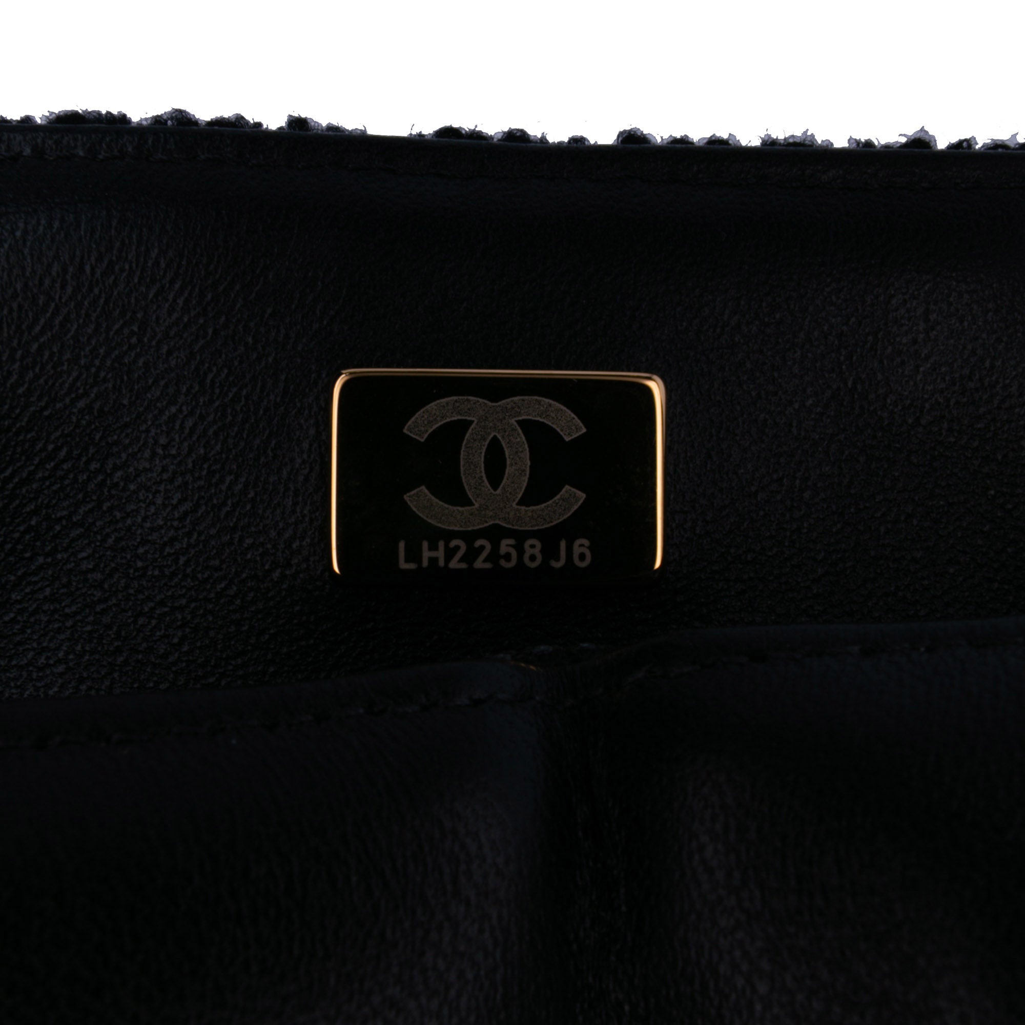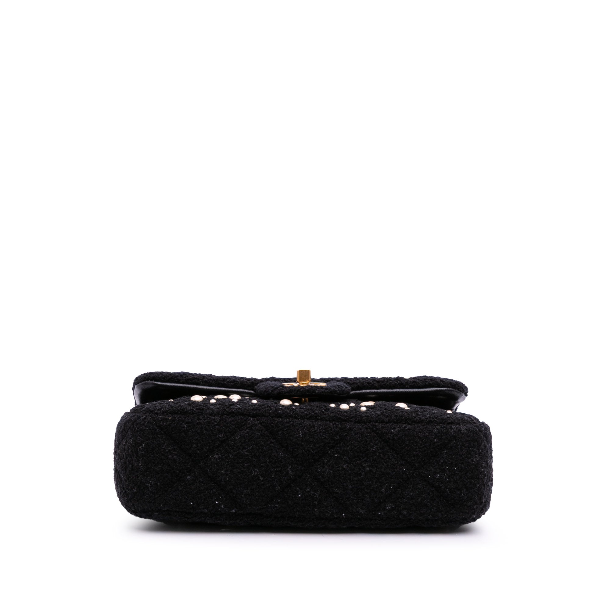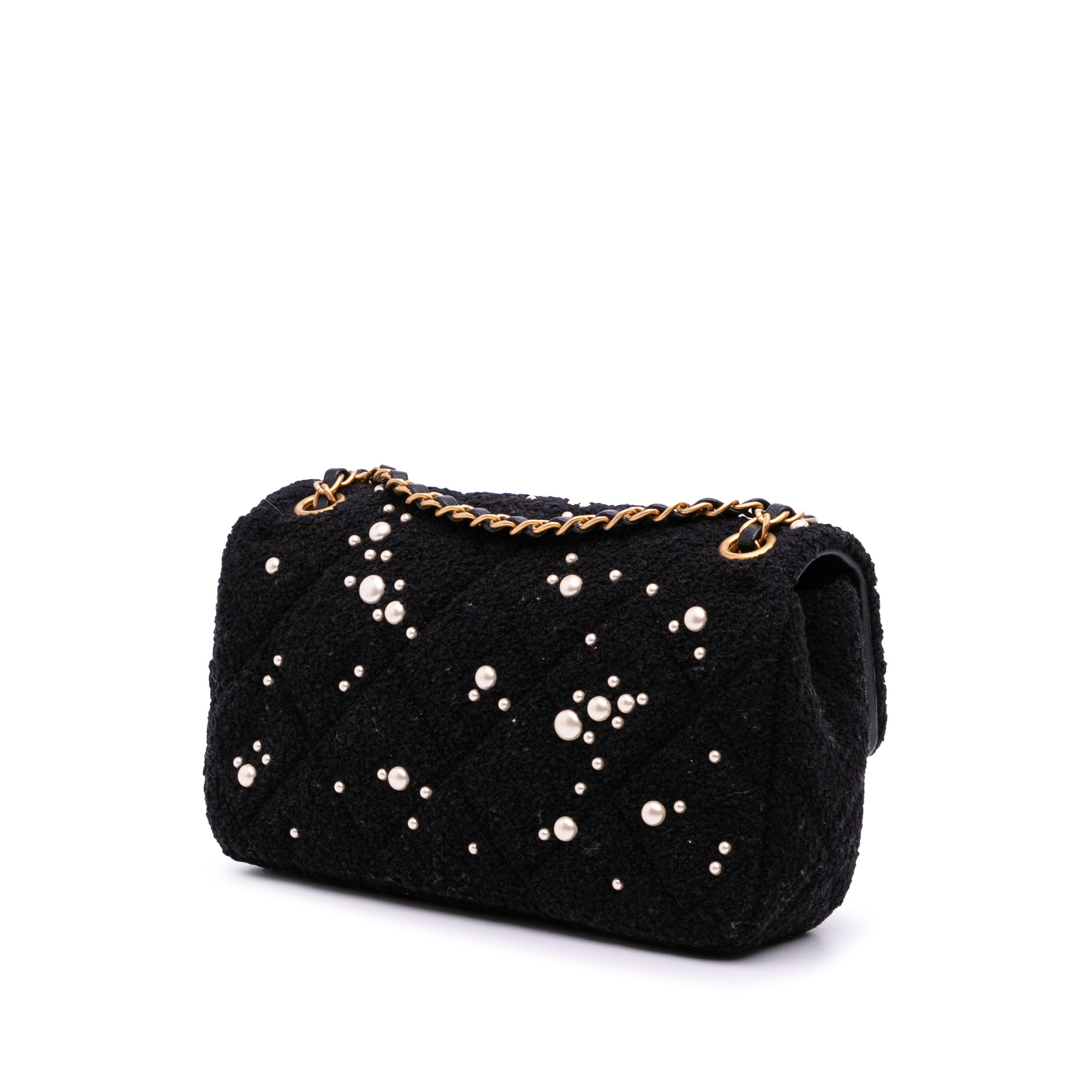 This crossbody bag features a tweed body with pearl detail, a leather woven strap, a front flap with interlocking Cs and a twist lock closure, and an interior zip pocket. Retail Price: 7000.00