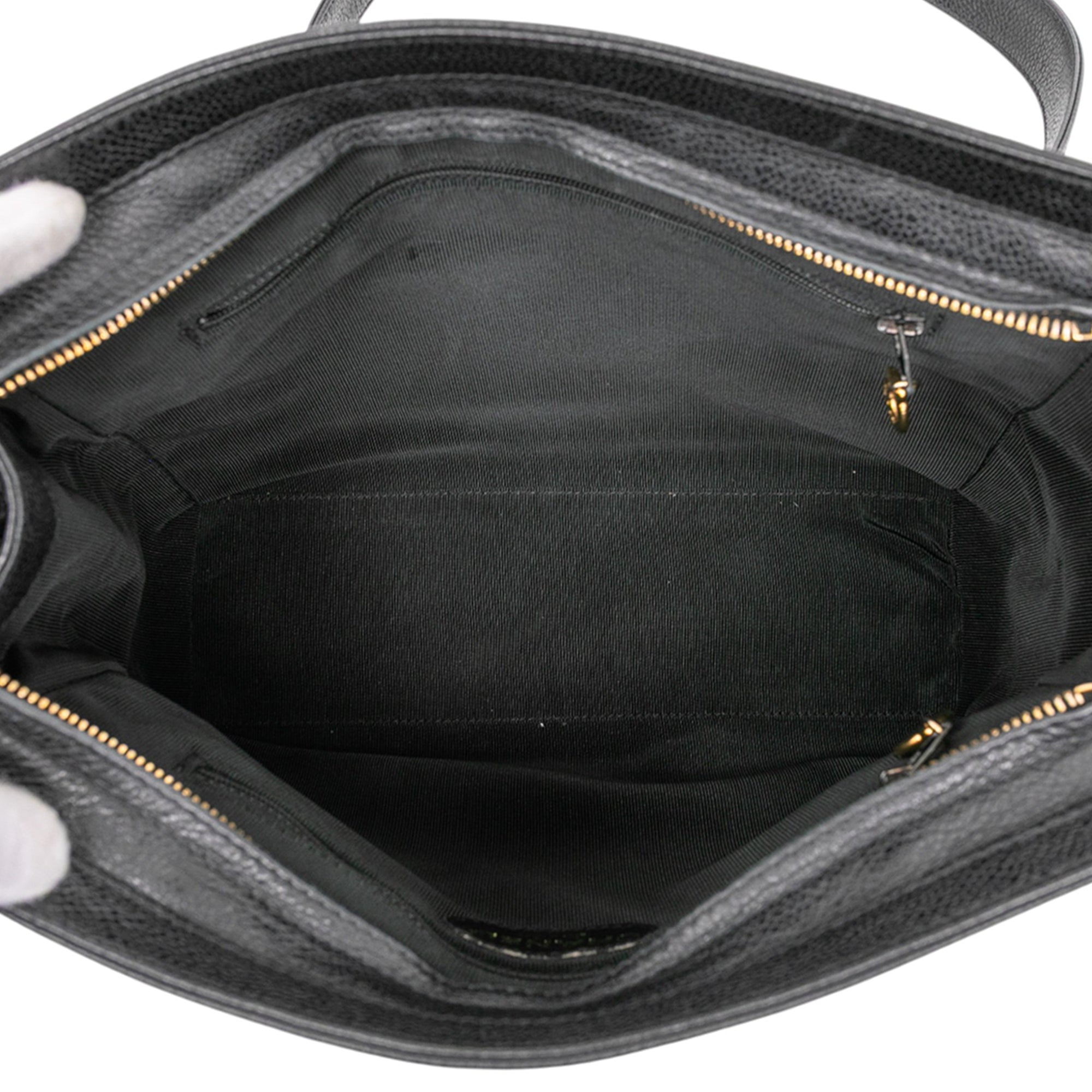 This shoulder bag features a caviar leather body, chain link and leather shoulder straps, a top zip closure, exterior slip pockets, and interior zip pockets. Retail Price: 3000.00
