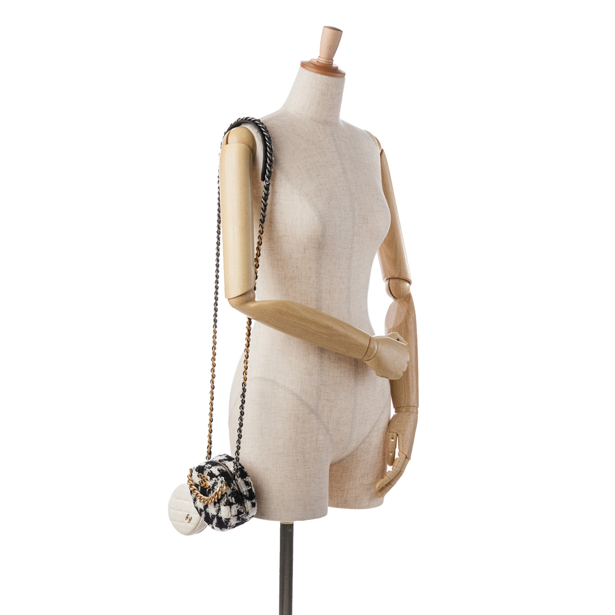 This satchel features a tweed body, a gold-tone chain handle, a woven chain strap with leather guard, a top zip closure, and interior slip pockets. Retail Price: 3100.00