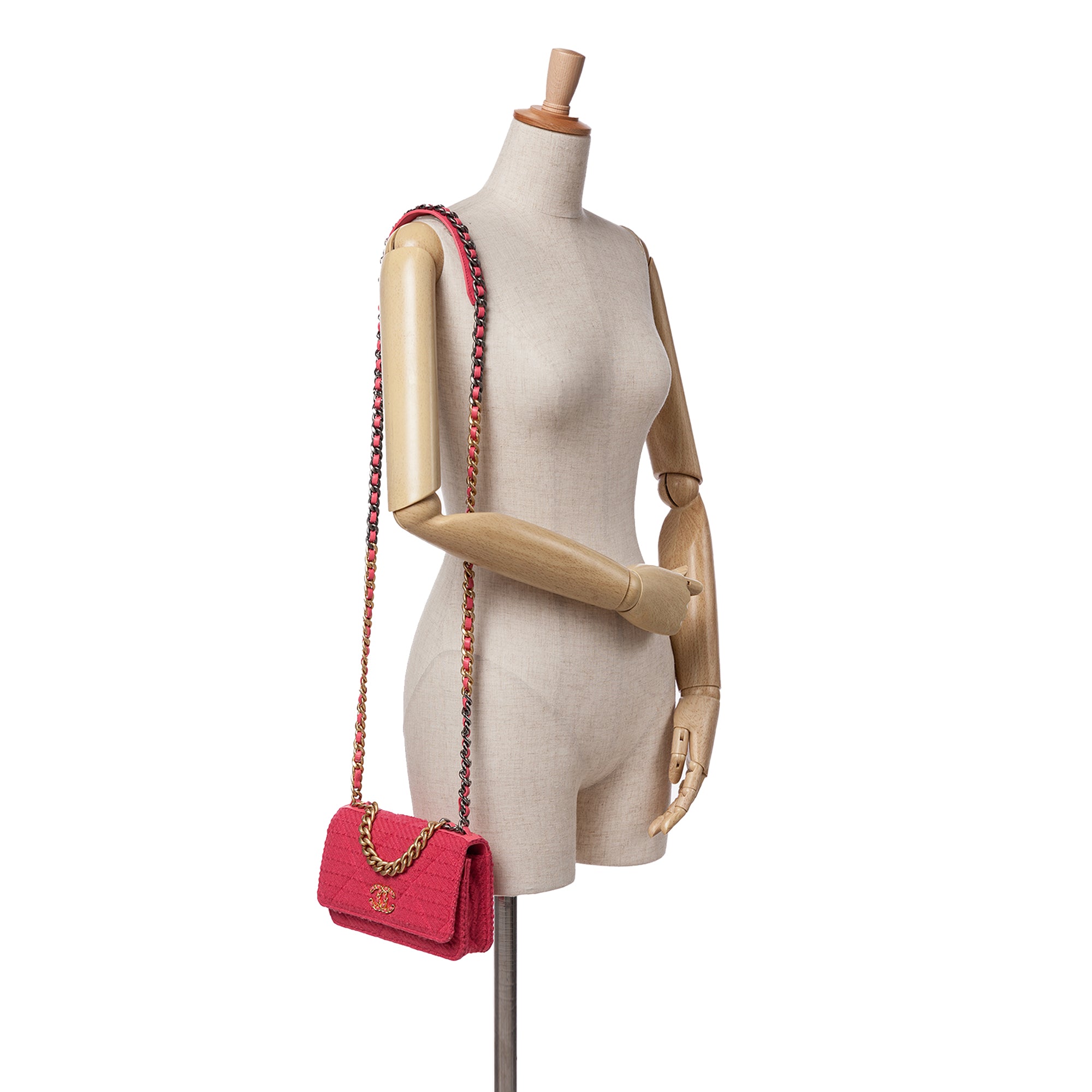The 19 wallet on chain features a tweed body, a chain-link handle, a leather woven-in chain strap with a leather shoulder guard, a front flap with snap button closure, and interior zip and slip pockets. Inclusion: authenticity card. Retail Price: 4500.00