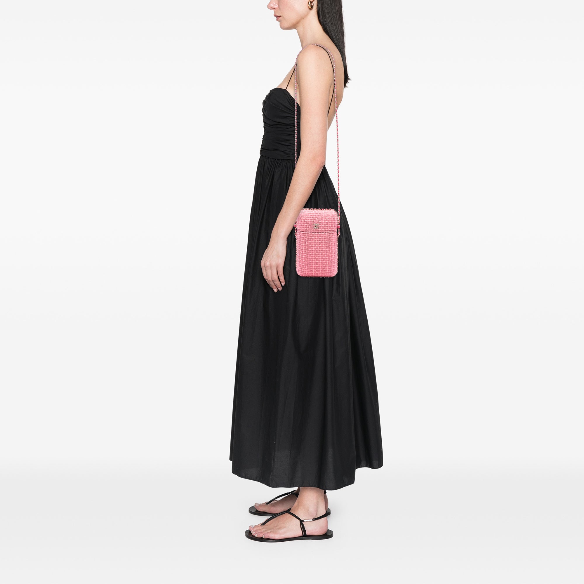 This phone holder features a tweed body, a top cap closure, and a woven chain strap. Inclusion: Dust bag, authenticity card. Retail Price: 2900.00