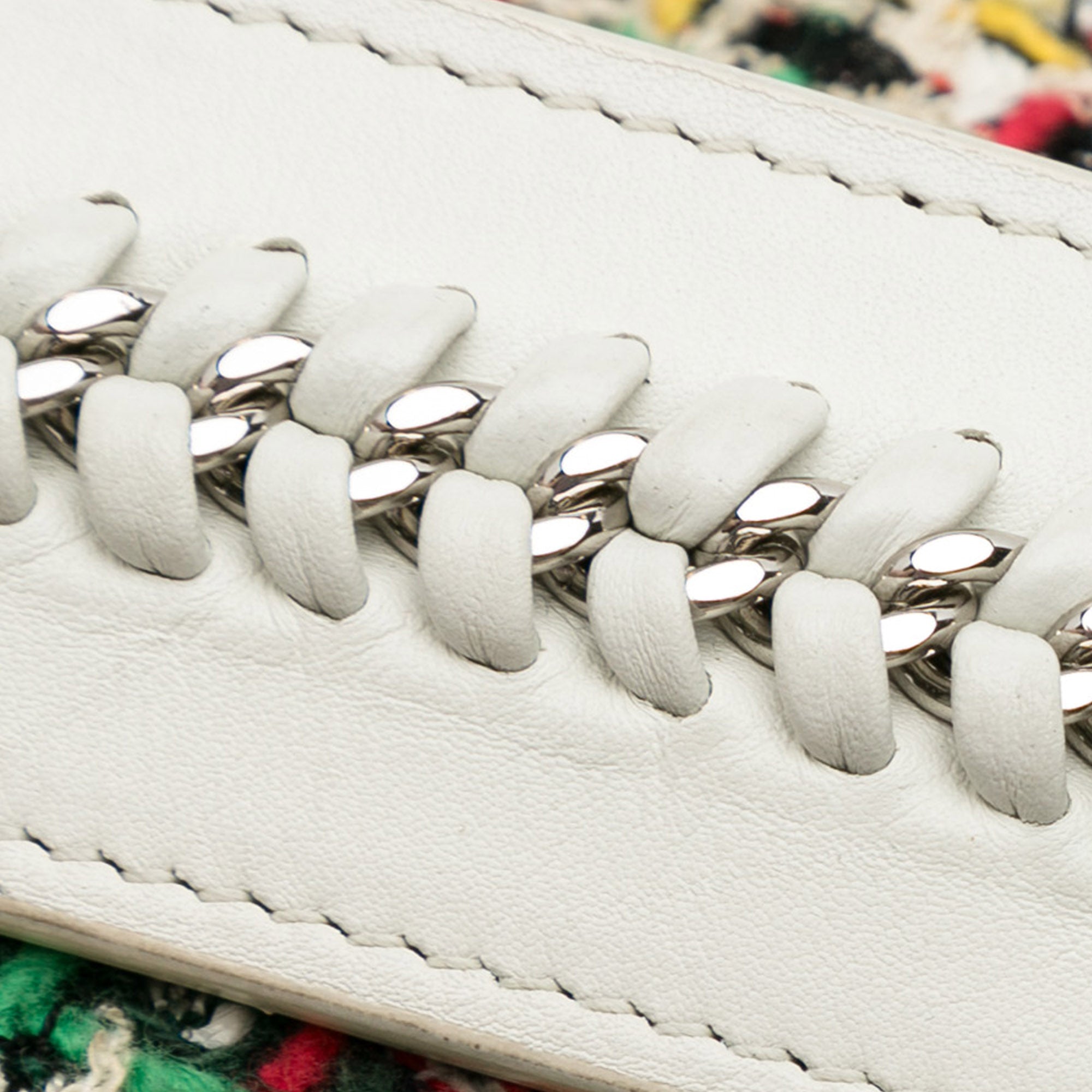This satchel features a tweed body with leather trim, a detachable leather handle, a woven chain strap with leather guard, a top zip closure, and interior zip and slip pockets. Retail Price: 3800.00