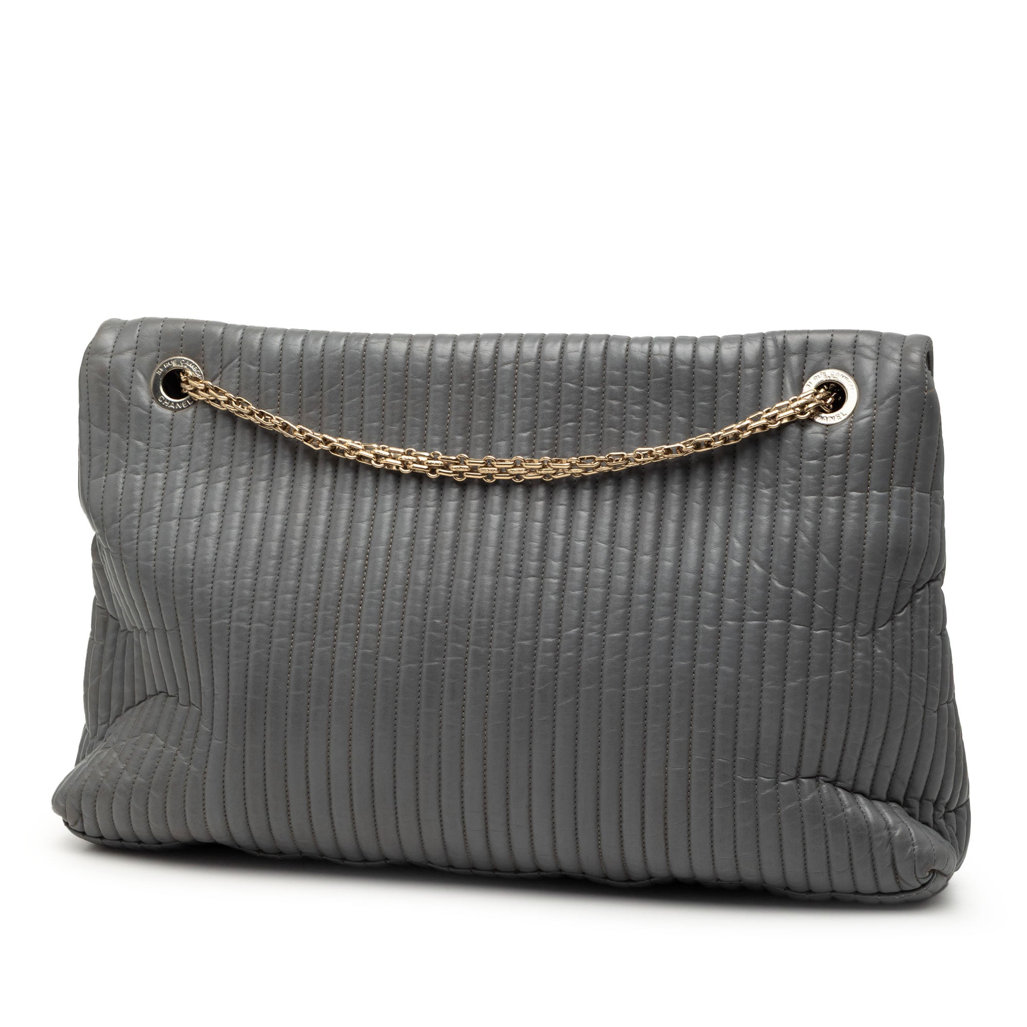 This shoulder bag features an iridescent calfskin leather body, bijoux chain shoulder straps, front flap with turn lock closure, and interior zip and slip pockets. Retail Price: 5500.00