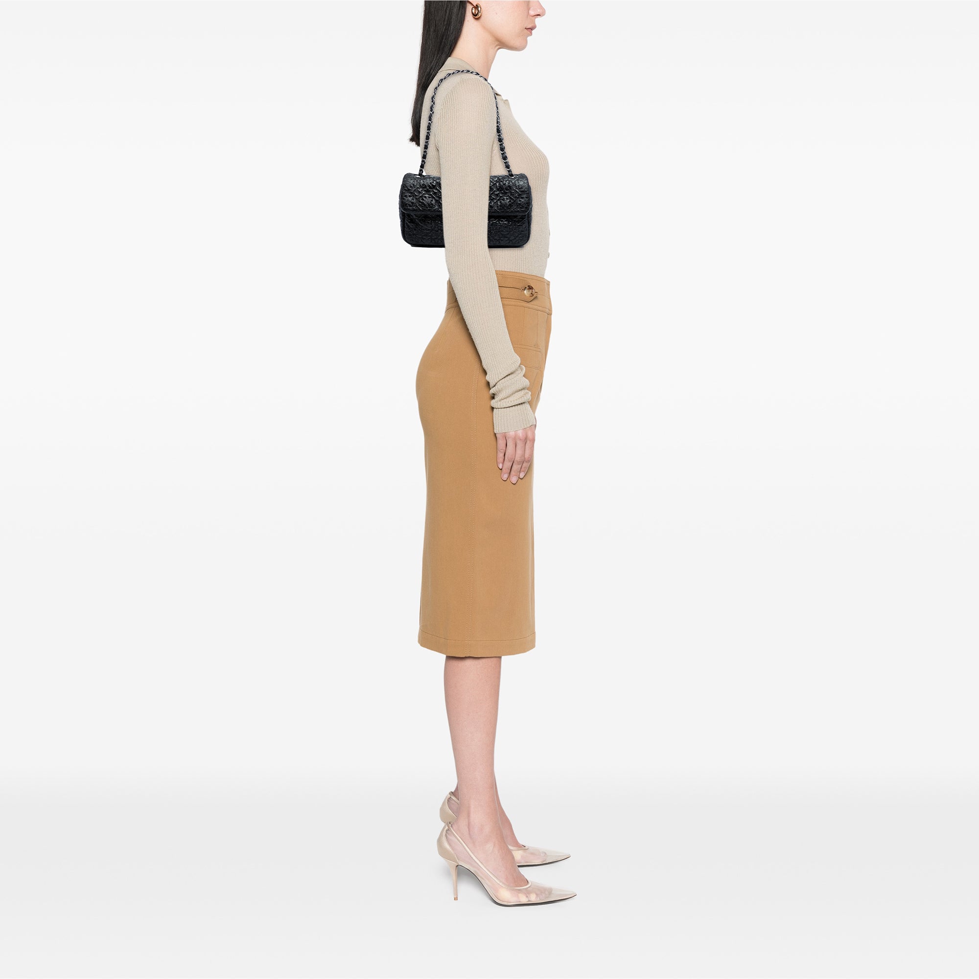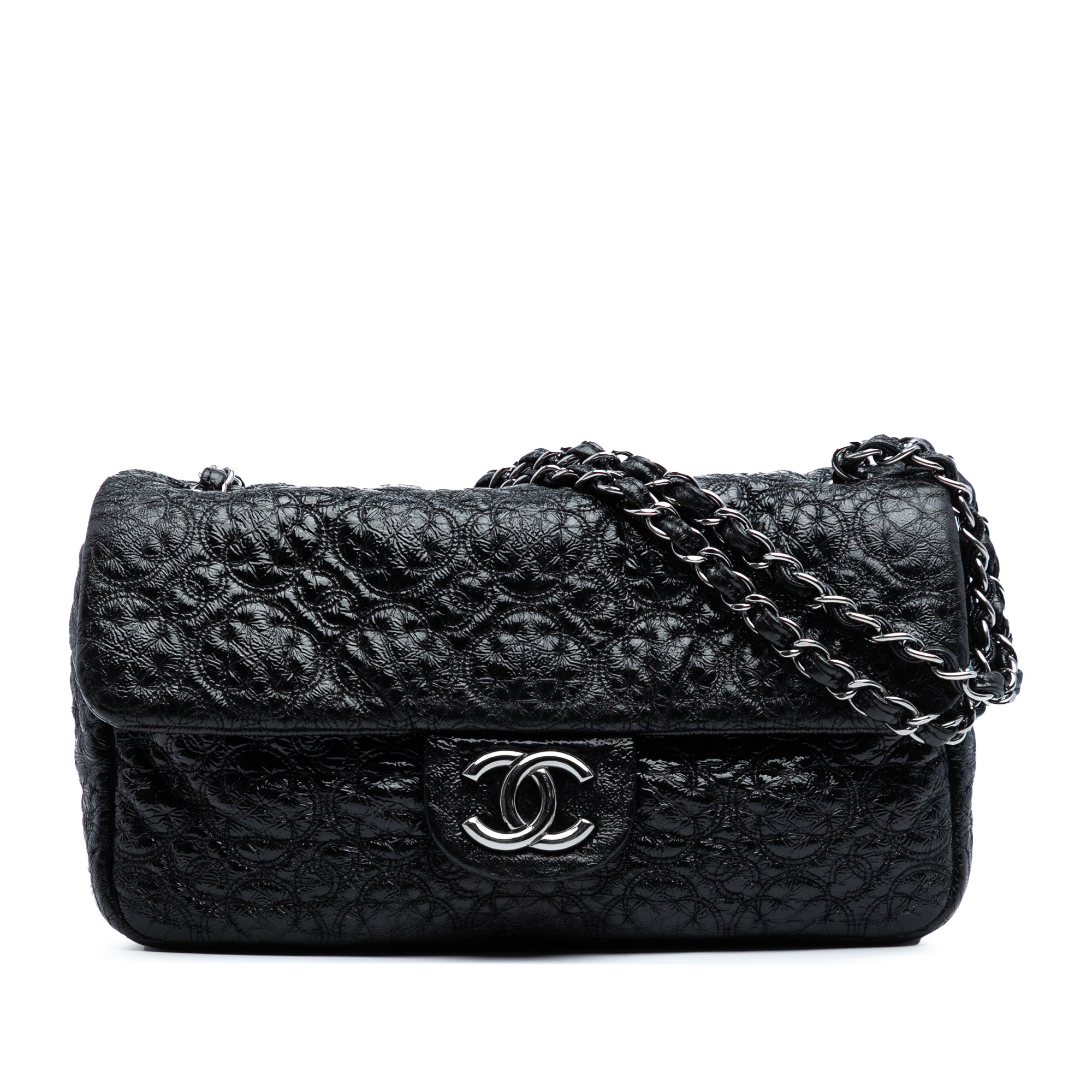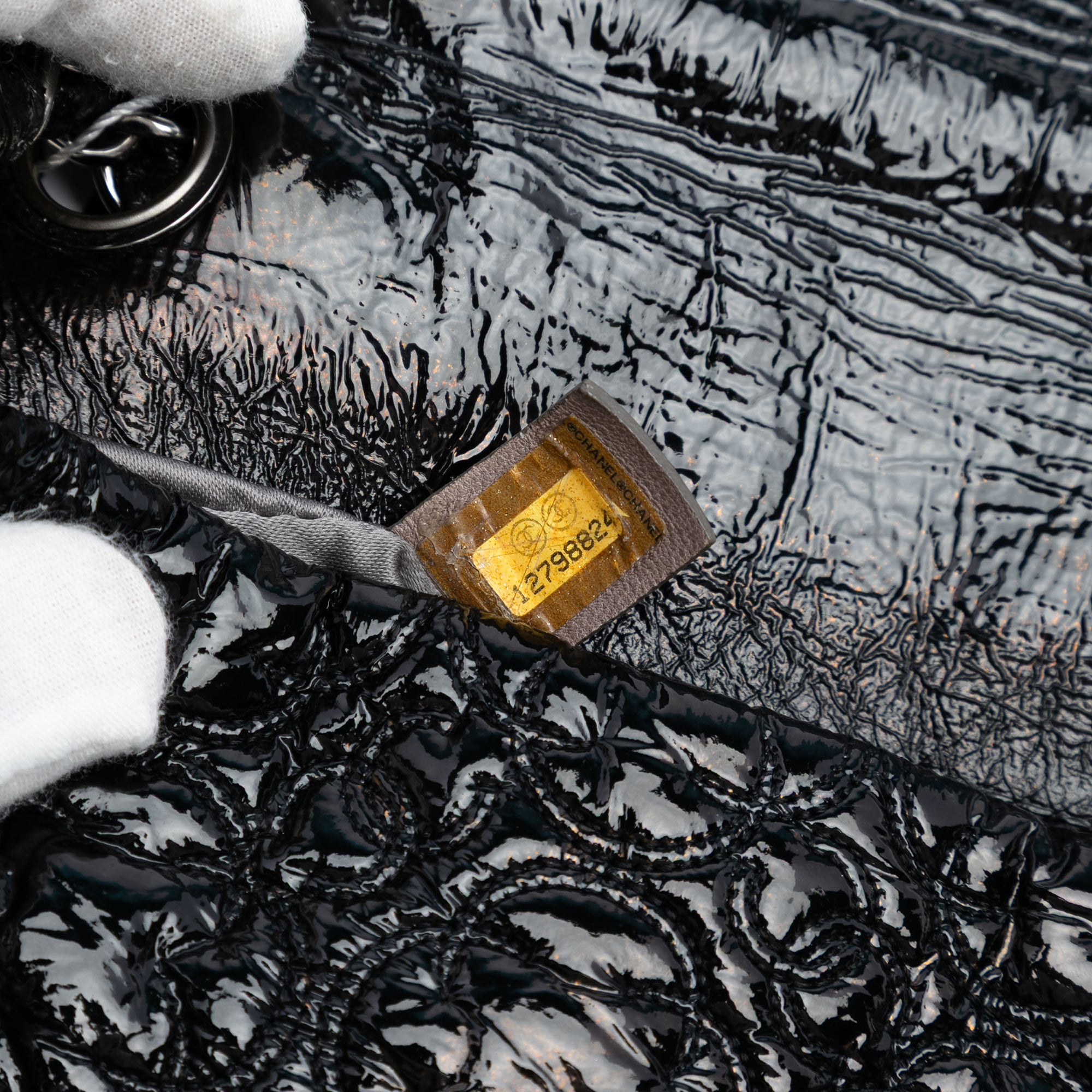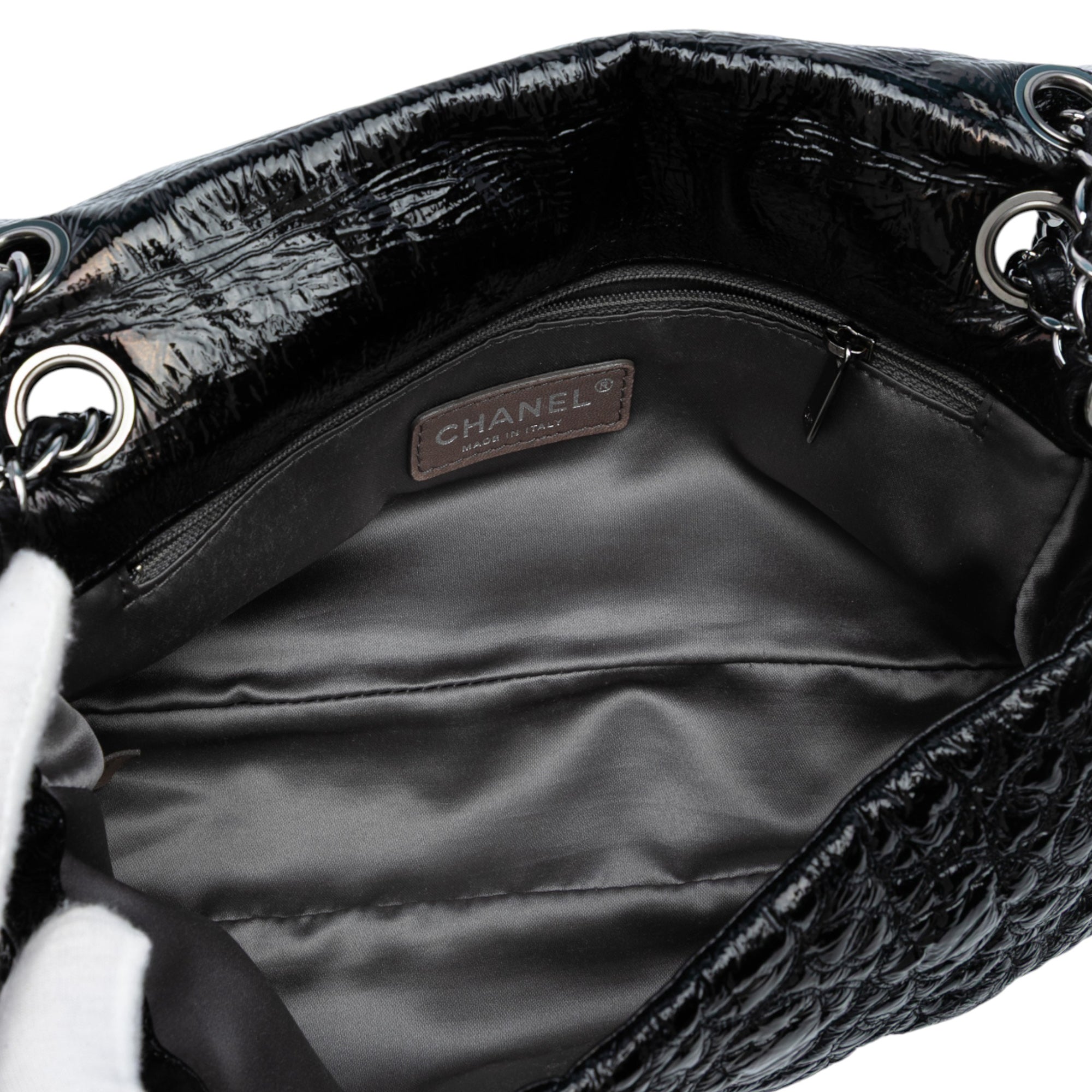 This shoulder bag features a a quilted vinyl body, vinyl woven chain straps, a front flap with magnetic snap closure, and an interior zip pocket. Retail Price: 2650.00