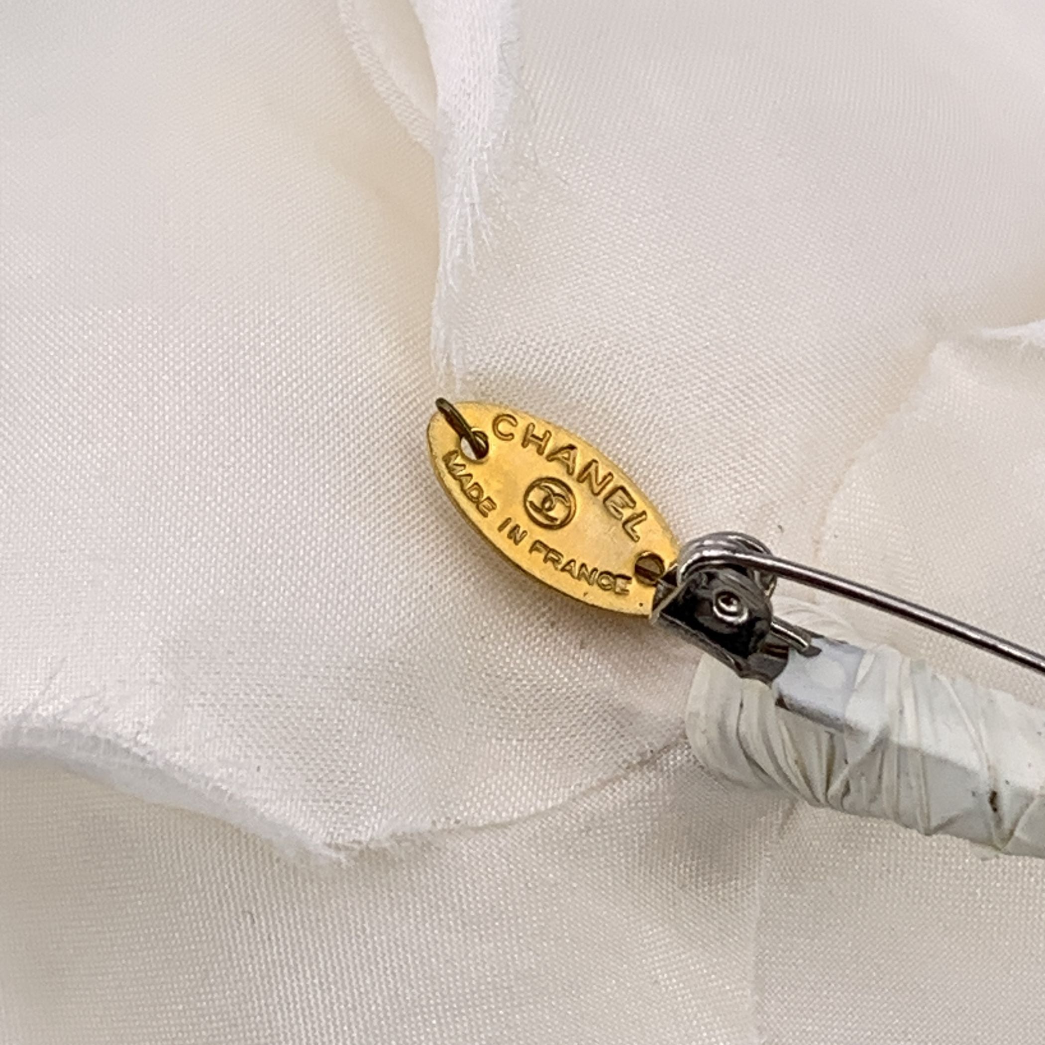 Add a Touch Of Timeless Elegance To Your Collection With This Exquisite Chanel Vintage White Silk Rose Camellia Flower Pin Brooch. Crafted With Delicate White Silk Petals, This Piece Captures The Essence Of Chanel's Signature Femininity And Refinement. The Iconic Camellia Flower, Synonymous With The House Of Chanel, Is Beautifully Reimagined Here, Offering a Soft, Elegant Statement That Pairs Effortlessly With Any Outfit. The Brooch Features a Safety Pin Closure On The Back, Ensuring It Stays Securely In Place Whether Worn On a Jacket, Blouse, Or Accessory. Measuring a Maximum Width Of 3.5 Inches - 9 Cm), It's Perfectly Sized To Make An Impact Without Overwhelming Your Look. An 'Chanel - Cc - Made In France' Oval Tab On The Back Further Affirms Its Authenticity, Making This Vintage Piece a Must-have For Any Chanel Enthusiast Or Collector. With Its Timeless Design And Impeccable Craftsmanship, This Camellia Brooch Is a True Statement Of Luxury And Style.
