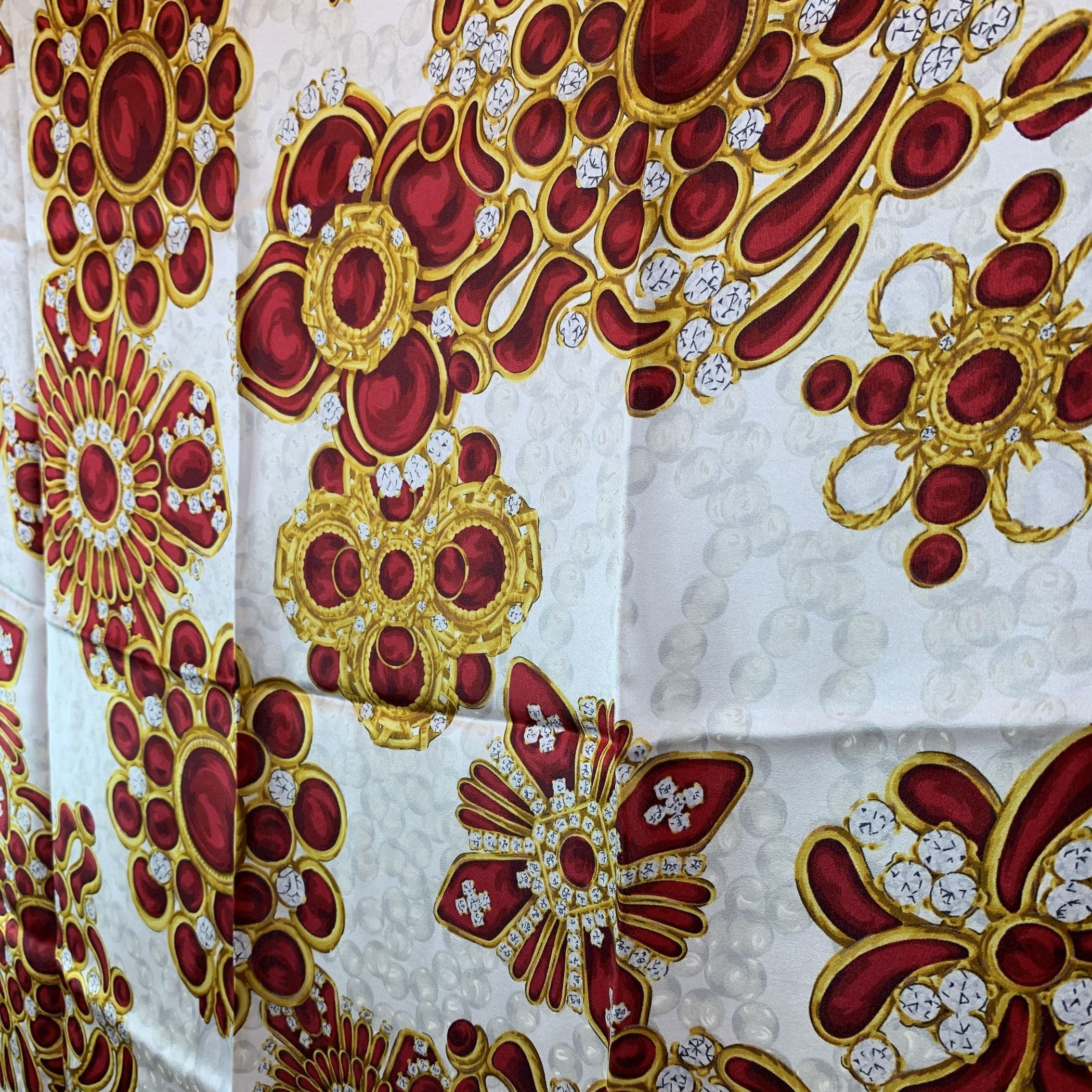 A Striking And Glamorous Accessory, This Vintage Chanel Scarf Is Crafted From 100% Pure Silk And Features An Opulent Yellow Gold Gripoix Jewelry Motif Set Against a Beige/off-white Background. The Intricate Design Captures Chanel's Timeless Fascination With Bijoux And Statement Adornments, Echoing The Maison's Classic Elegance. Finished With a Hand-rolled Edge, This Luxurious Scarf Showcases Exceptional Craftsmanship And Refined Detail-a True Vintage Treasure That Adds a Touch Of Parisian Sophistication And Golden Allure To Any Look.