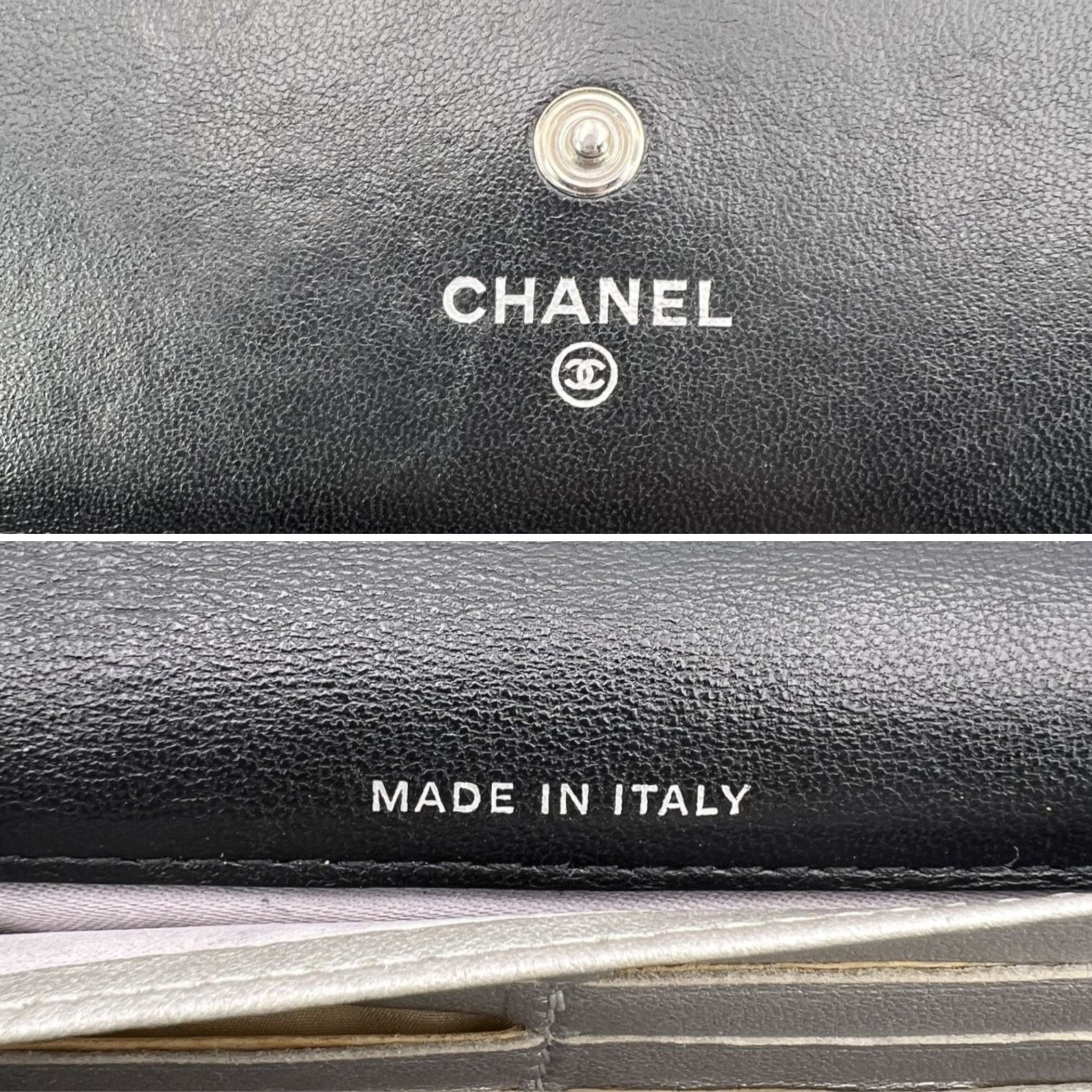 The Flap With Snap-button Closure Opens To a Sophisticated Silver Leather Interior, Thoughtfully Organized With Twelve Credit Card Slots, Two Main Compartments, Two Flat Pockets, And a Zip Coin Pocket For Optimal Functionality. Interior Details Include The Embossed “Chanel Cc” And “Made In Italy” Markings, Along With The Authenticity Hologram Tag.
