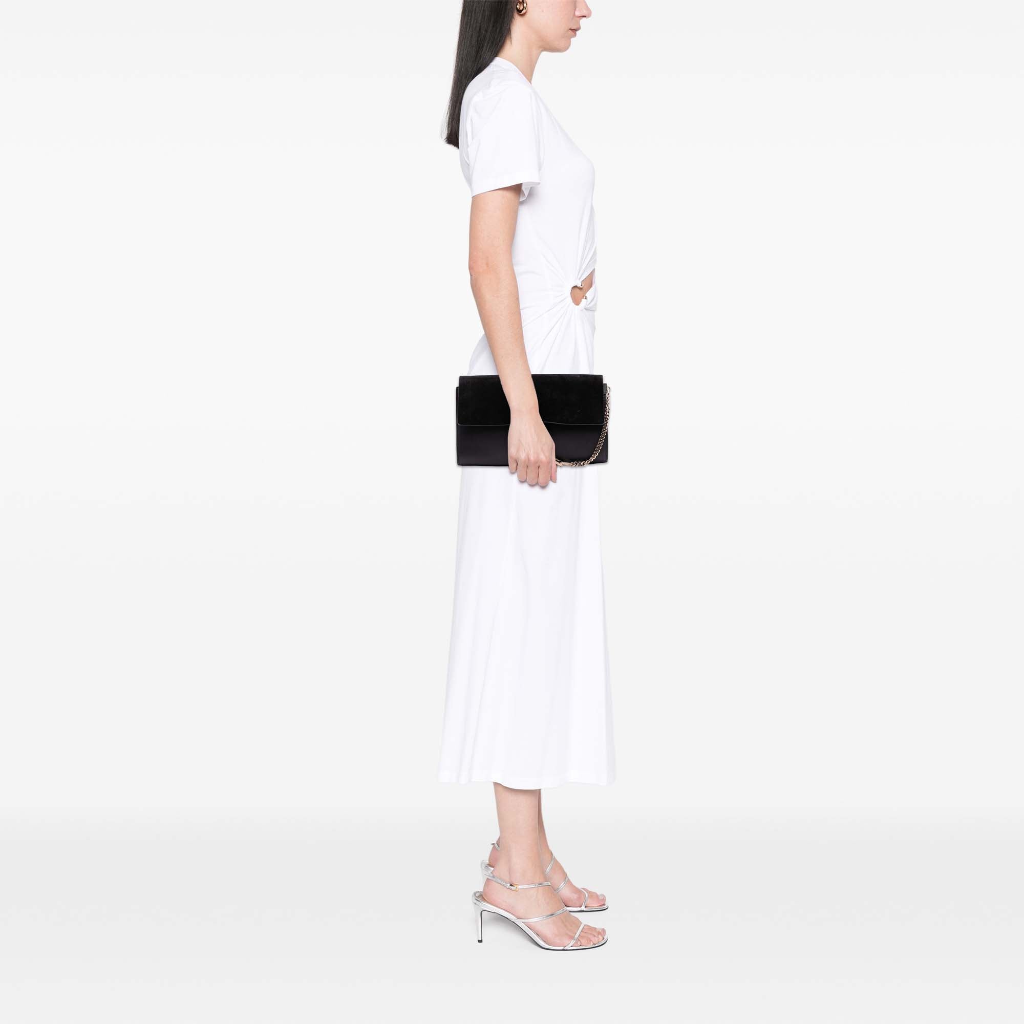 The Faye Clutch features a calf leather body, a suede flap with a hook detail and magnetic snap closure, and interior slip pockets. Inclusion: authenticity card. Retail Price: 890.00