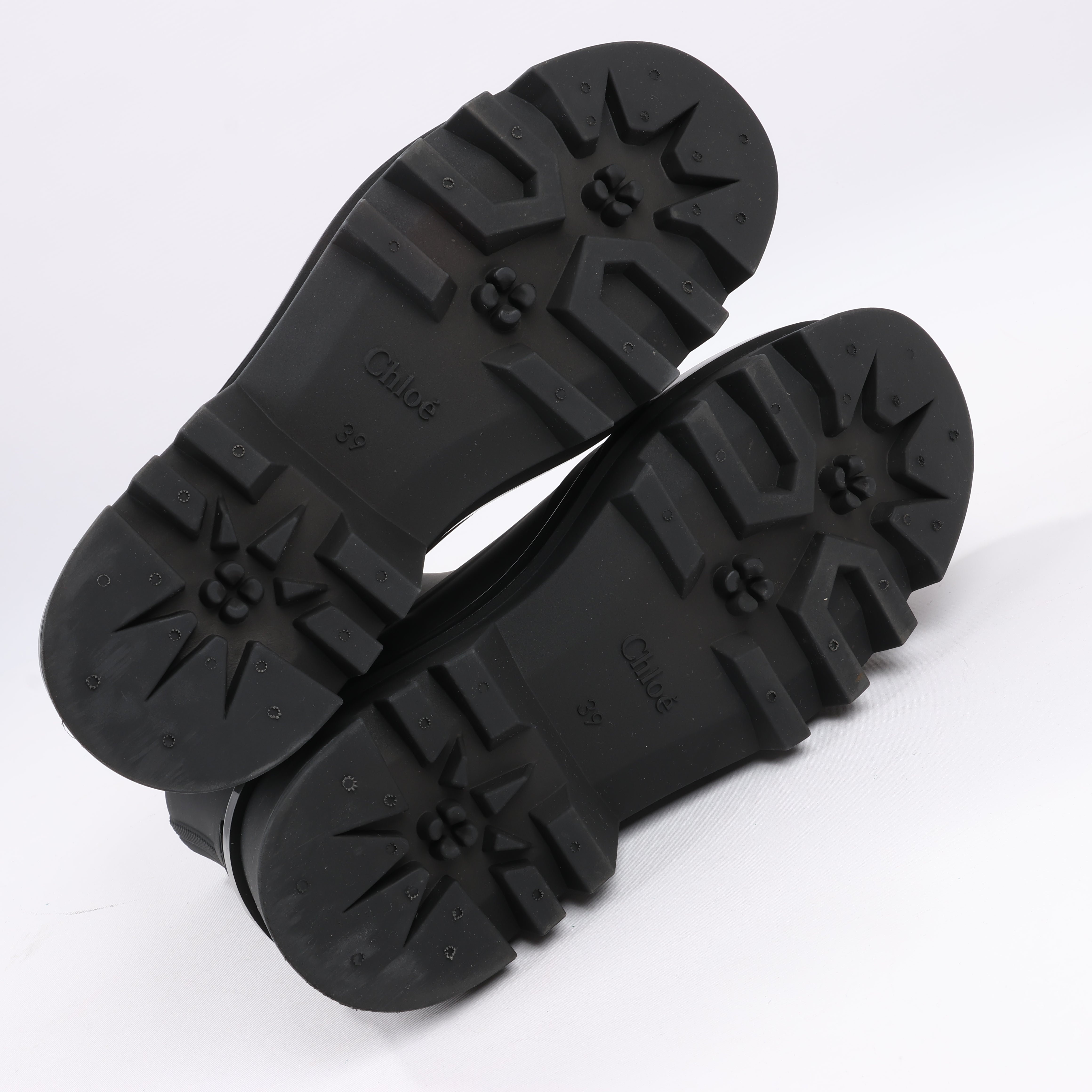 The Chloé Rubber Rain Ankle Boots in black (032324), size 39 EU, feature a durable waterproof design with a chunky treaded sole for maximum grip. Combining practicality with modern style, these ankle boots are perfect for braving wet weather in elegance.