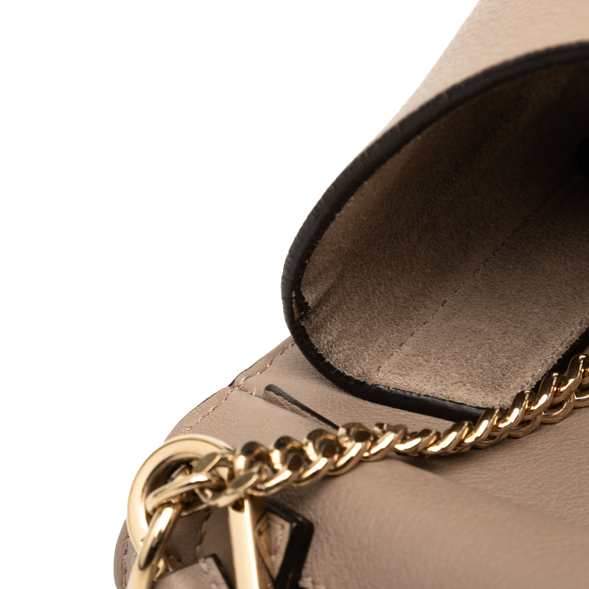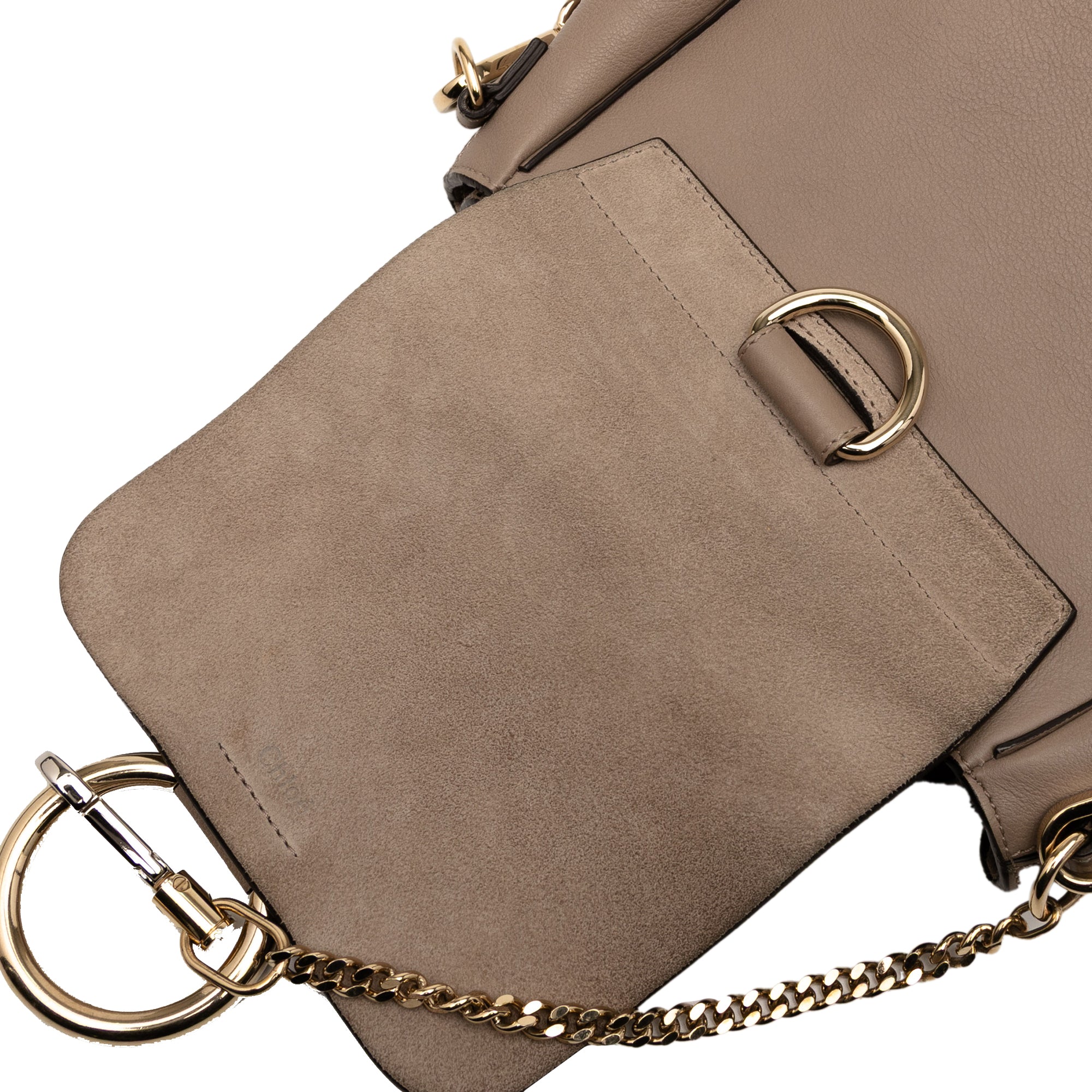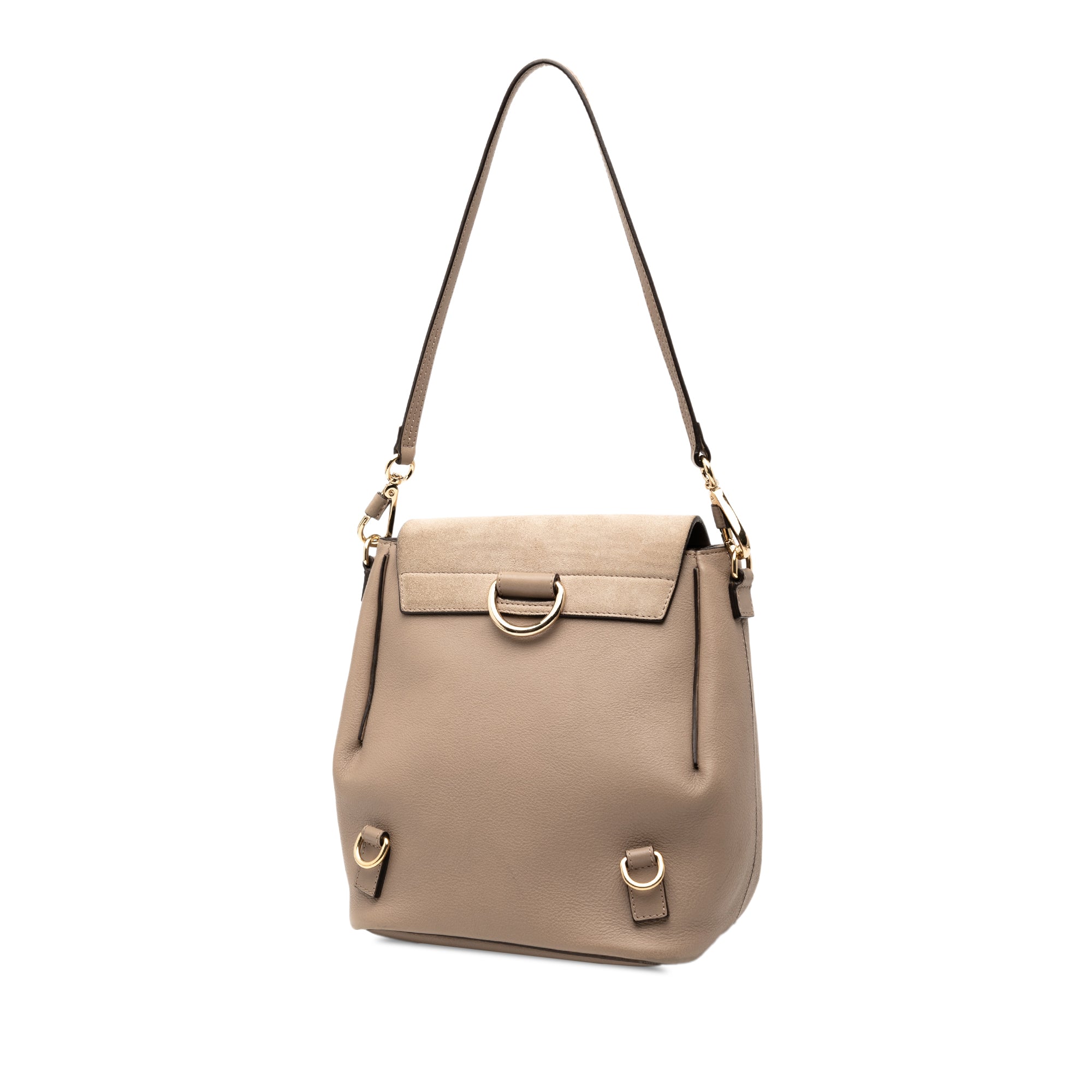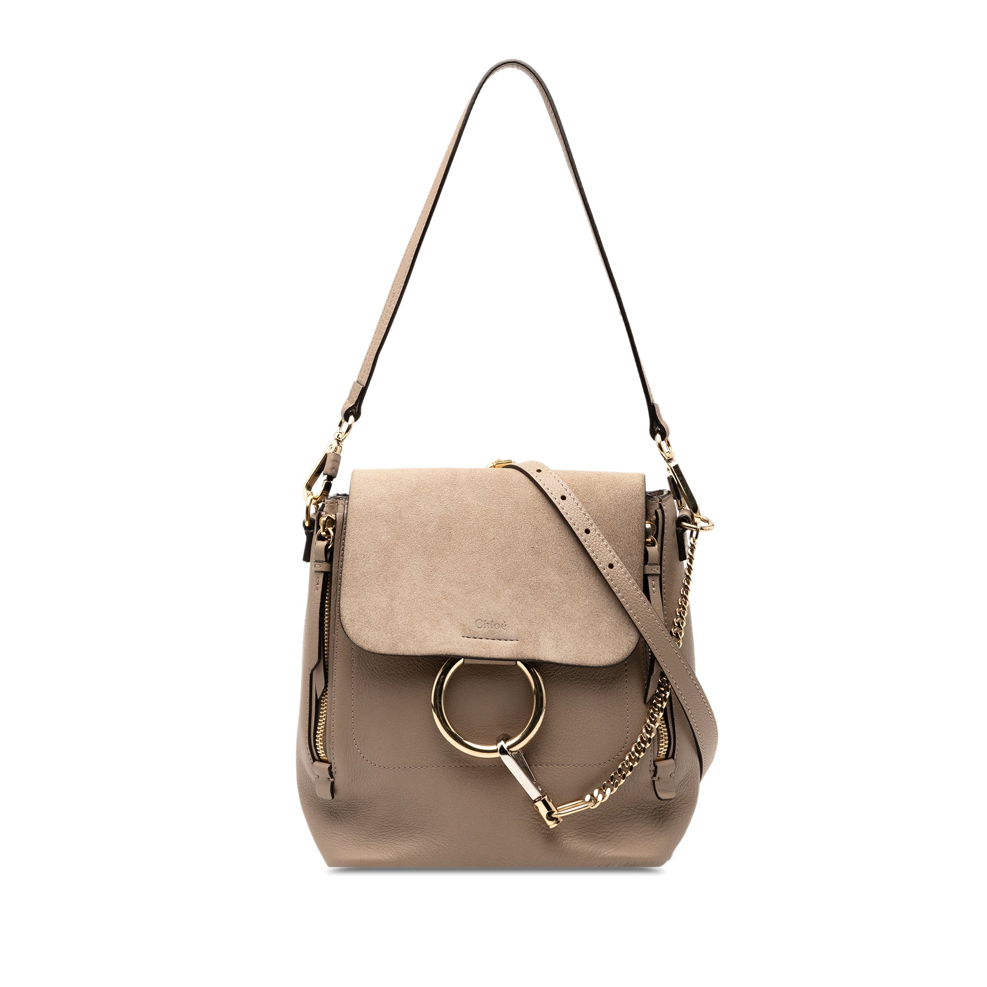 The Faye backpack features a leather body with zip details, adjustable flat back straps, a detachable shoulder strap, a suede front flap with a hook closure, and interior zip and slip pockets. Retail Price: 1705.00