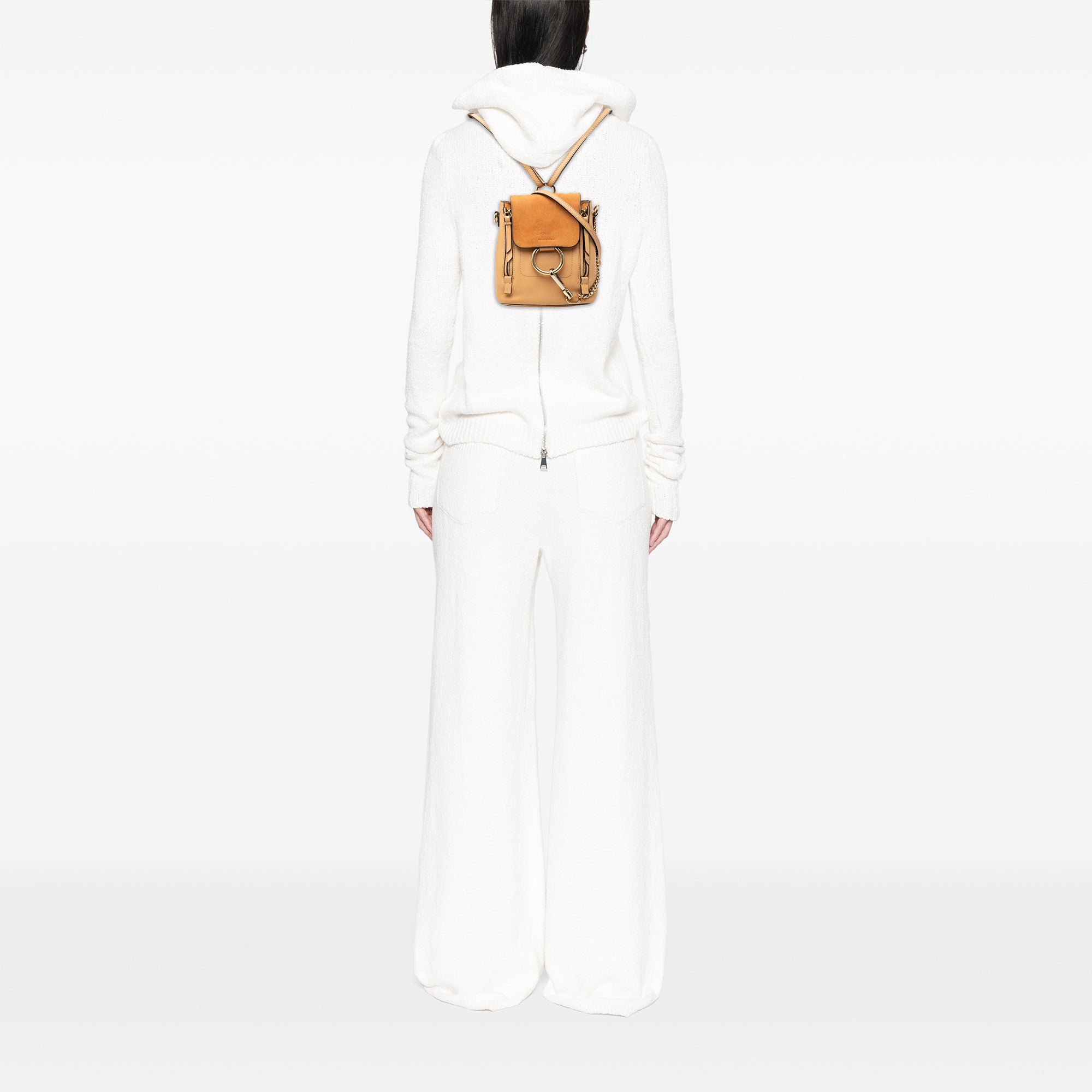 The Mini Faye backpack features a leather body with zip details, adjustable flat back straps, a detachable shoulder strap, a suede front flap with a hook closure, and an interior slip pocket. Retail Price: 1500.00