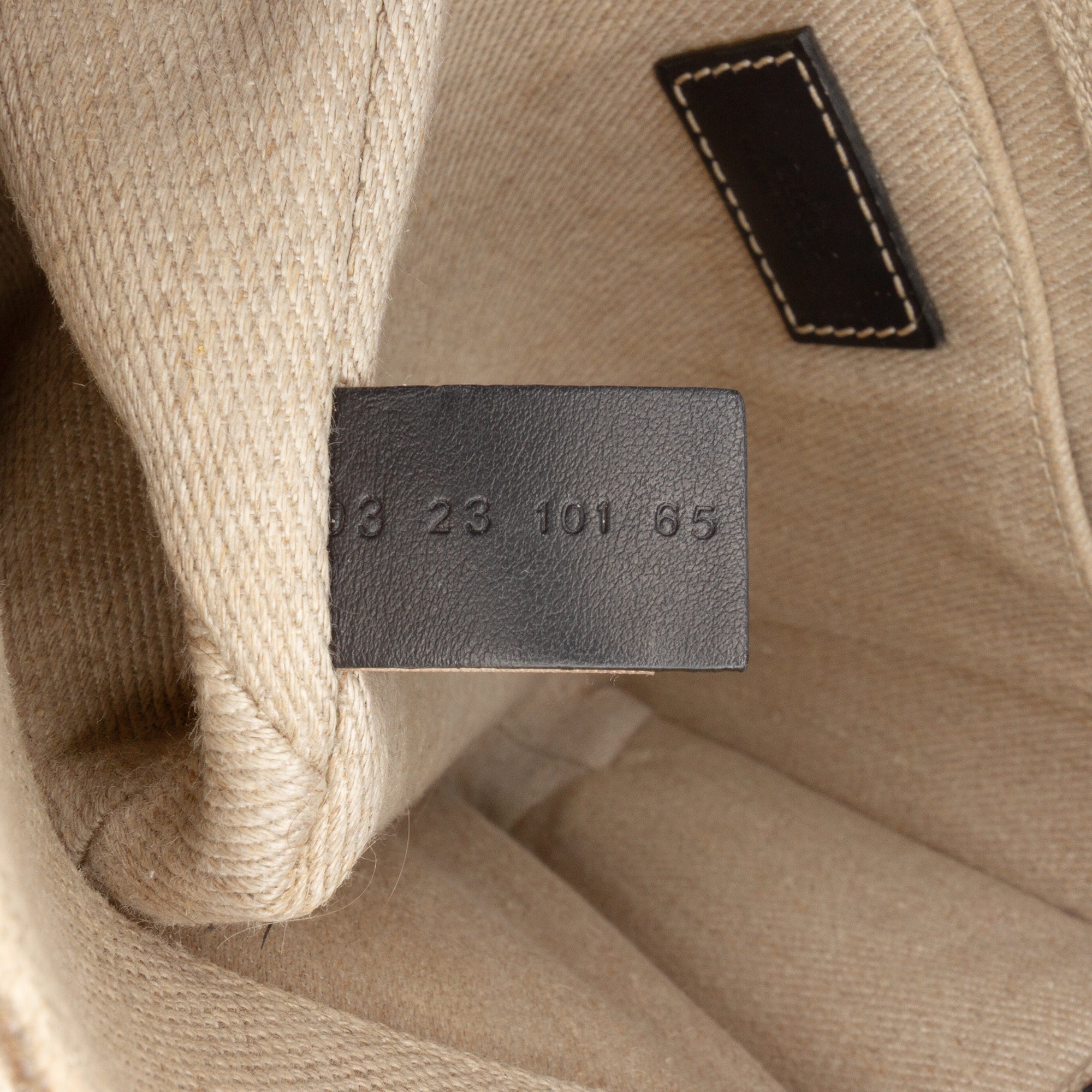 The Woody satchel features a canvas body with leather trim, flat canvas handles with leather details, a flat leather strap, an open top, and an interior slip pocket. Retail Price: 1250.00