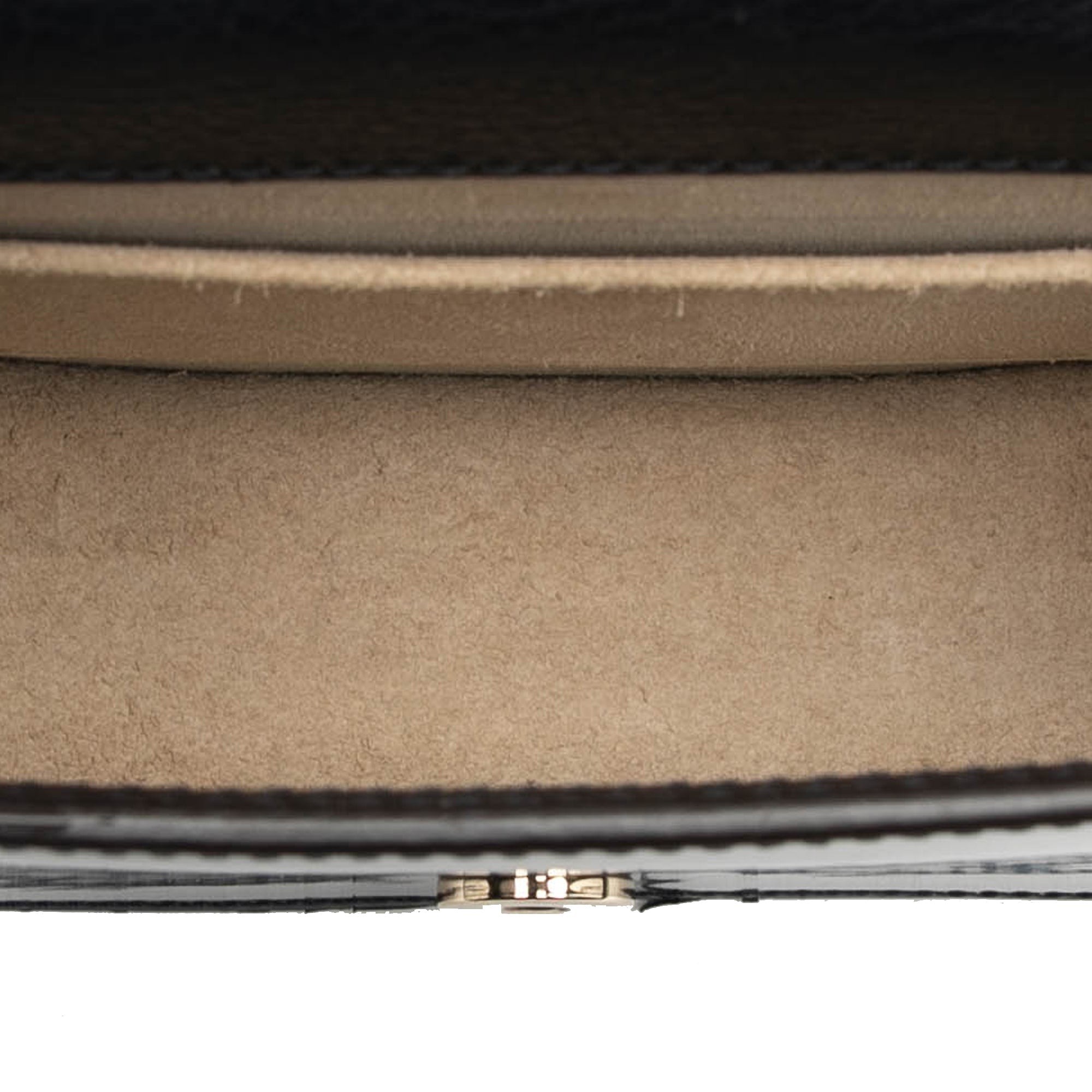 The Nile features a patent leather body, a metal hoop handle, a detachable flat leather strap, a flap with magnetic snap closure, an exterior back slip pocket, and an interior slip pocket. Retail Price: 800.00