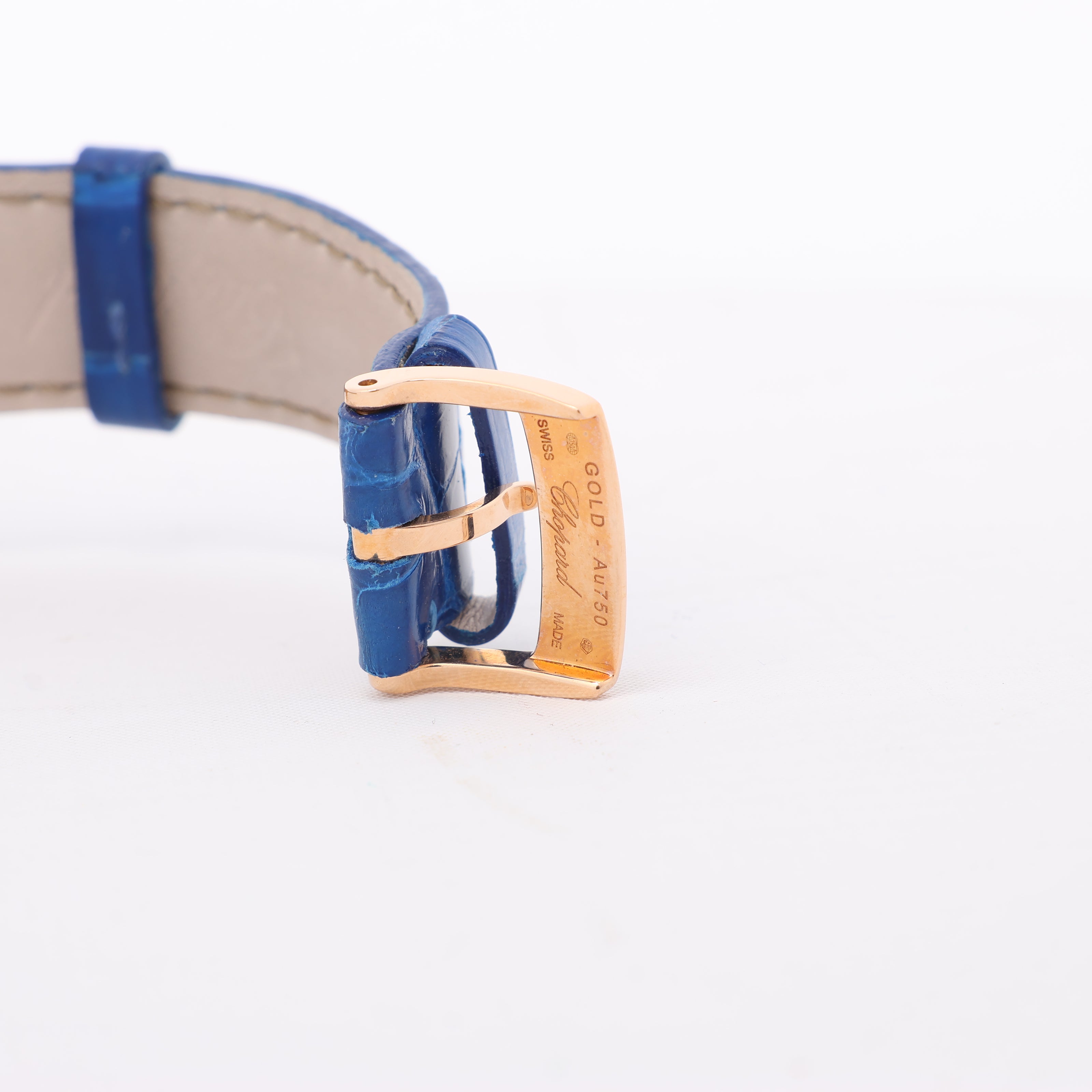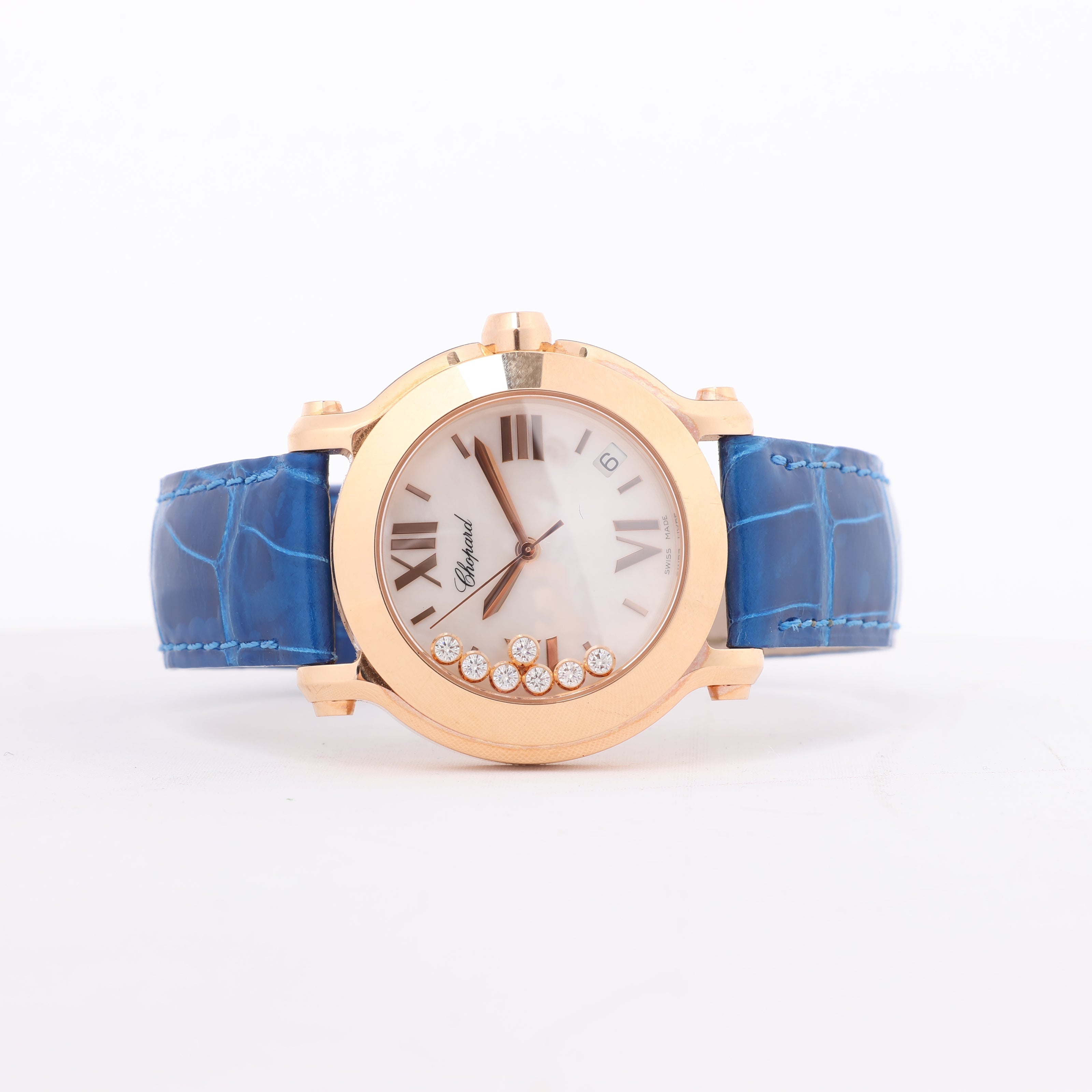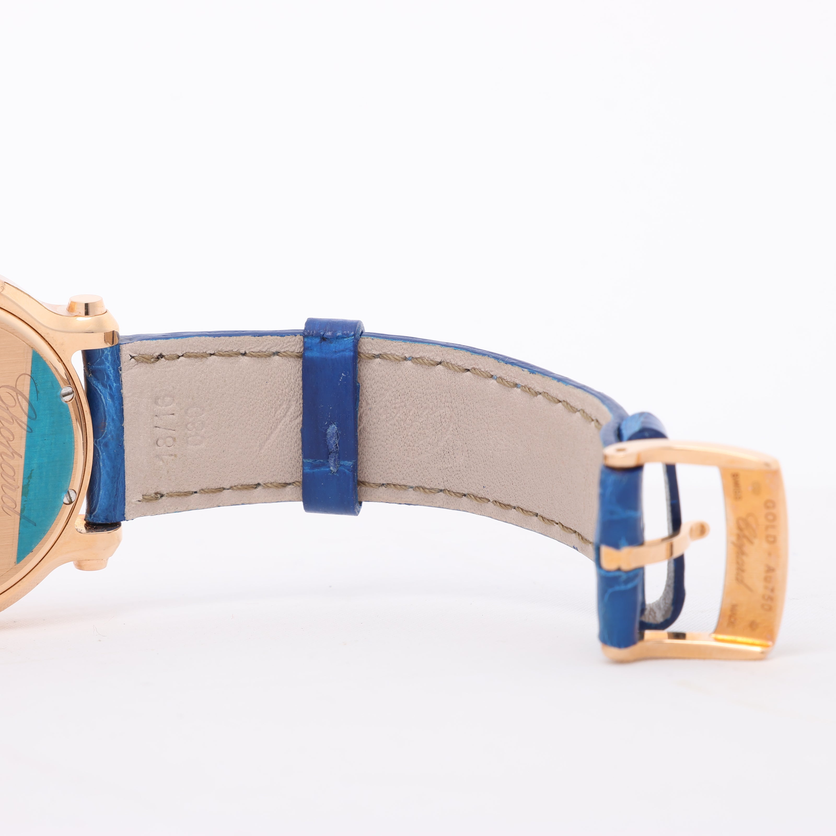 Chopard Happy Sport 277471-5001 features a silver dial with floating diamonds, rose gold case, and vibrant blue leather strap. A playful yet elegant quartz watch that captures joy and timeless luxury.