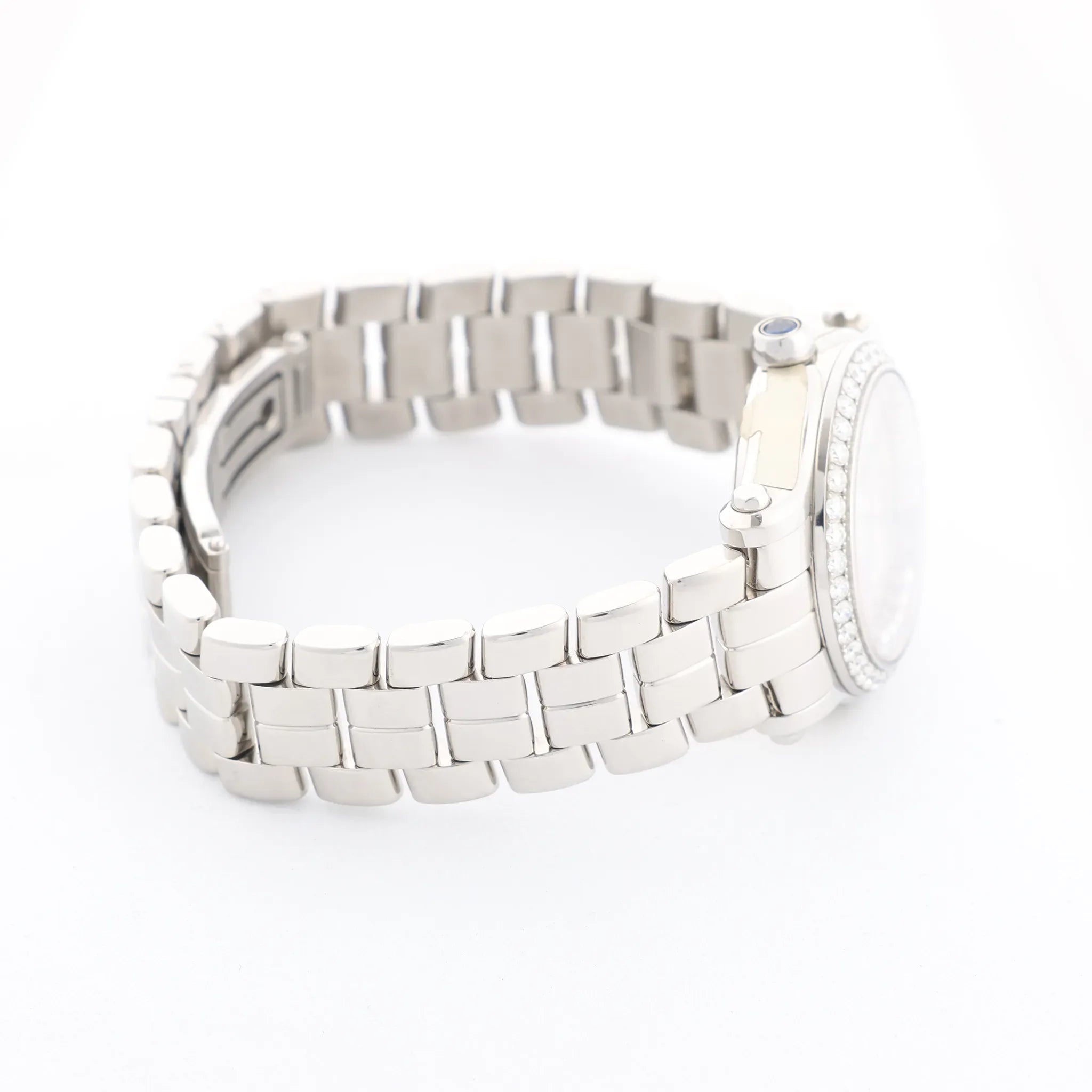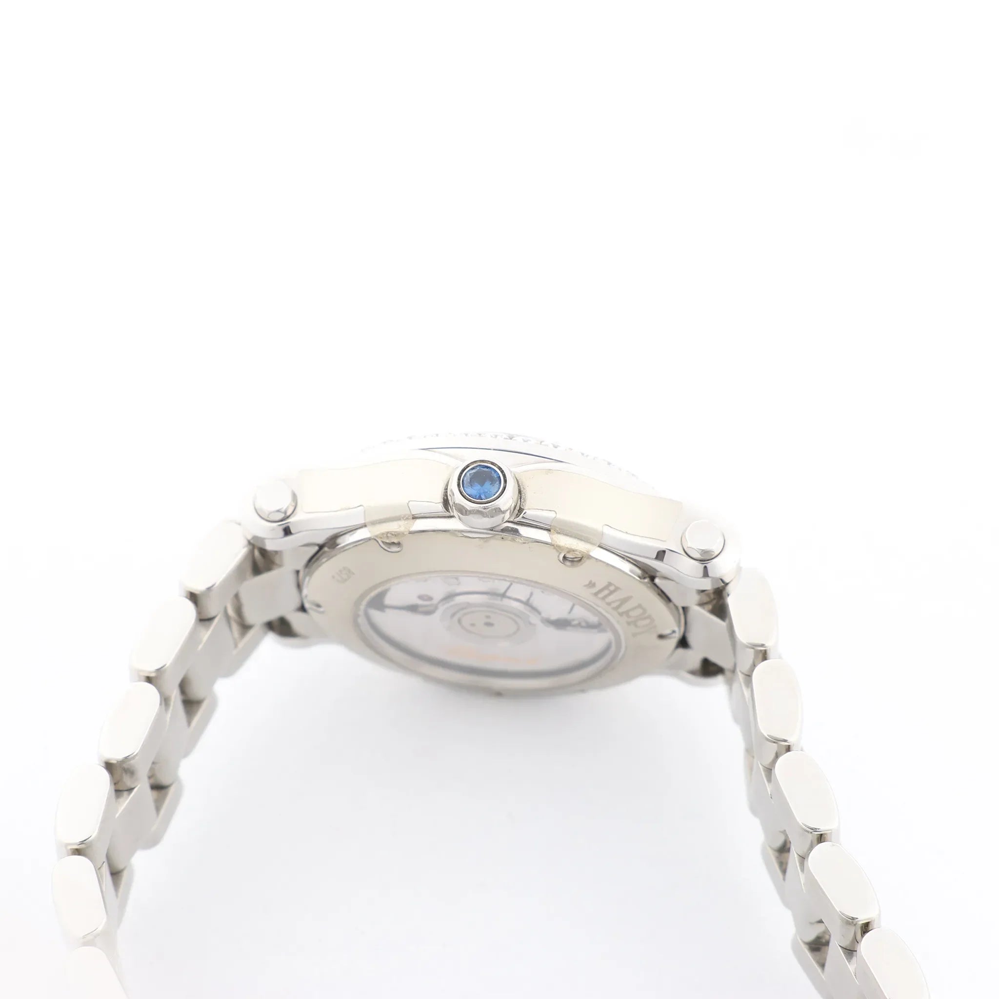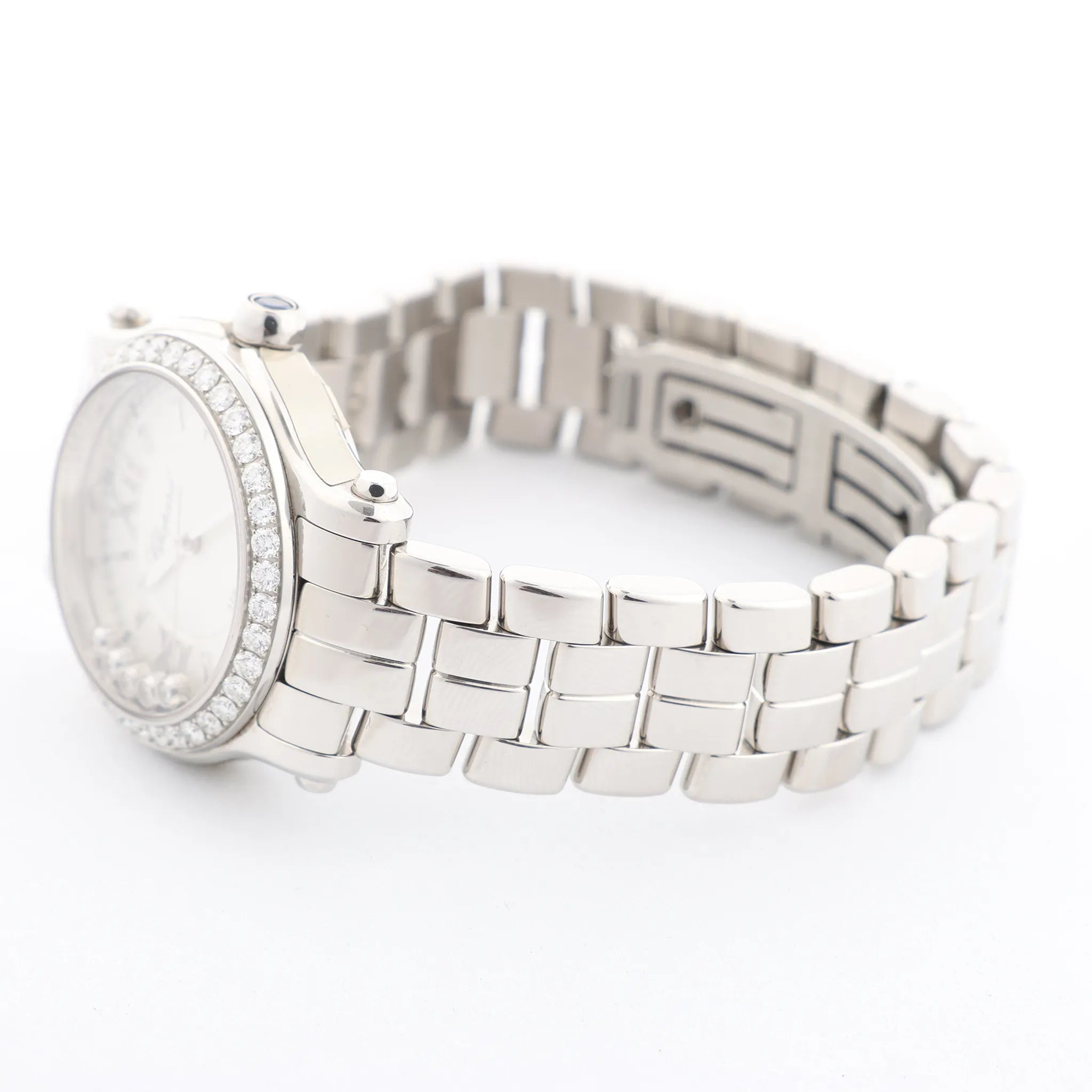 Chopard Happy Sport 278573-3004 stainless steel automatic watch—elegant white dial with Roman numerals, diamond-set bezel, and signature floating diamonds for everyday sparkle.