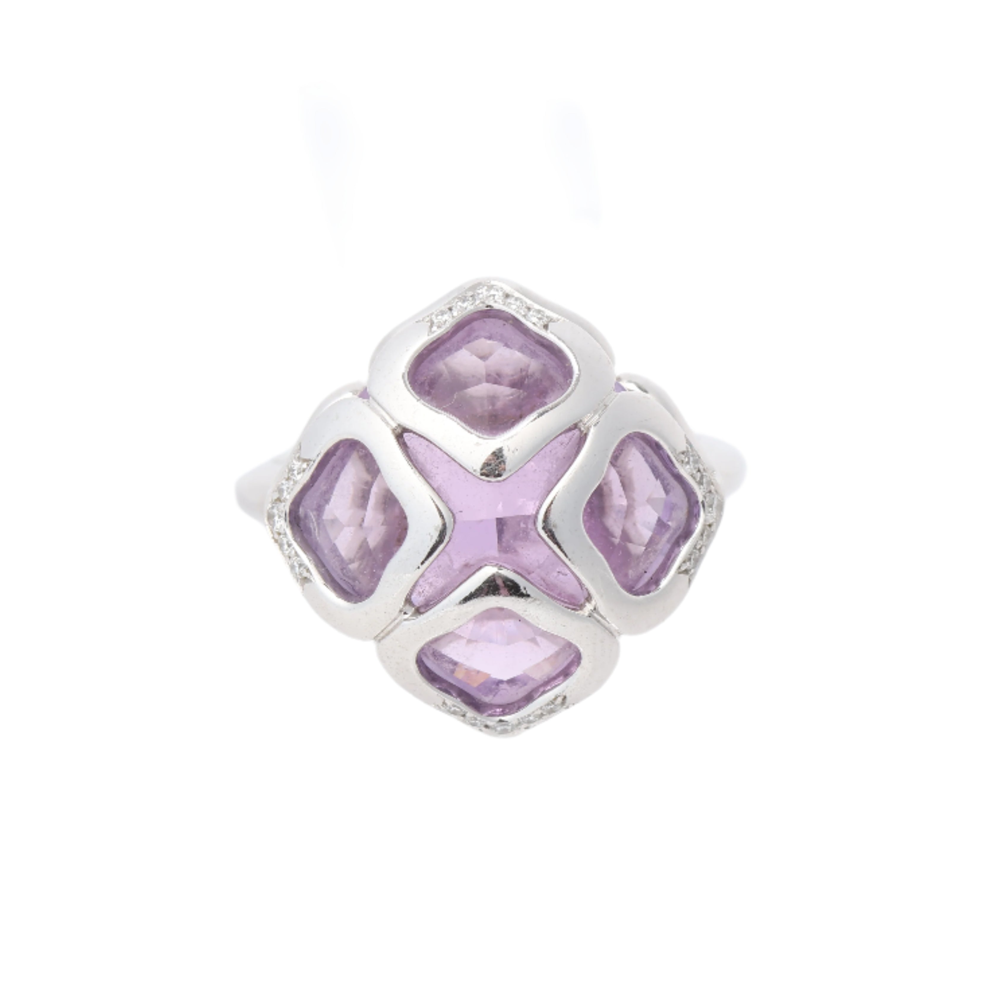 Chopard Imperiale cocktail ring in 18k white gold, featuring radiant amethyst stones and delicate diamond accents. A regal, sculptural piece in size 51 EU that captures elegance with a bold, feminine edge.