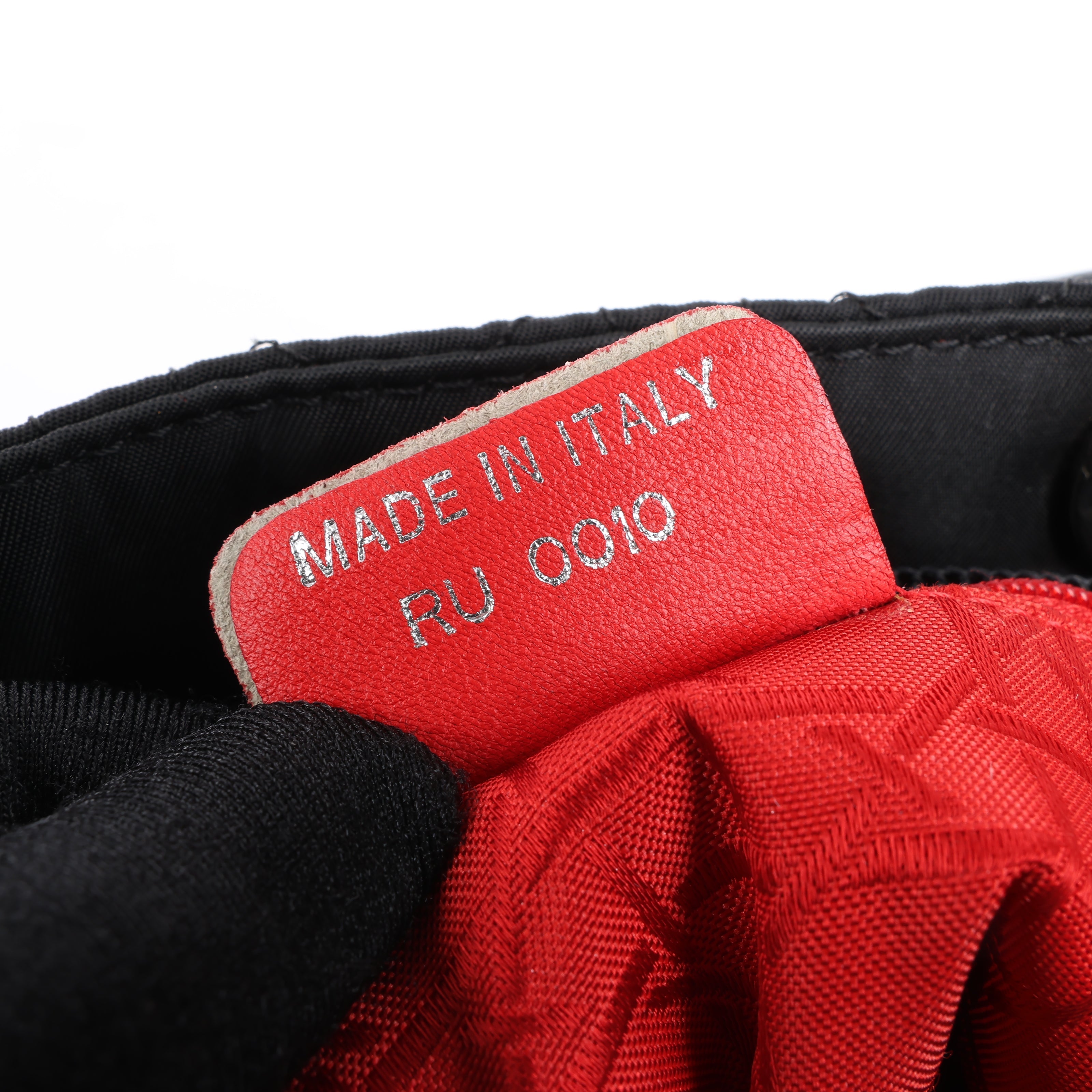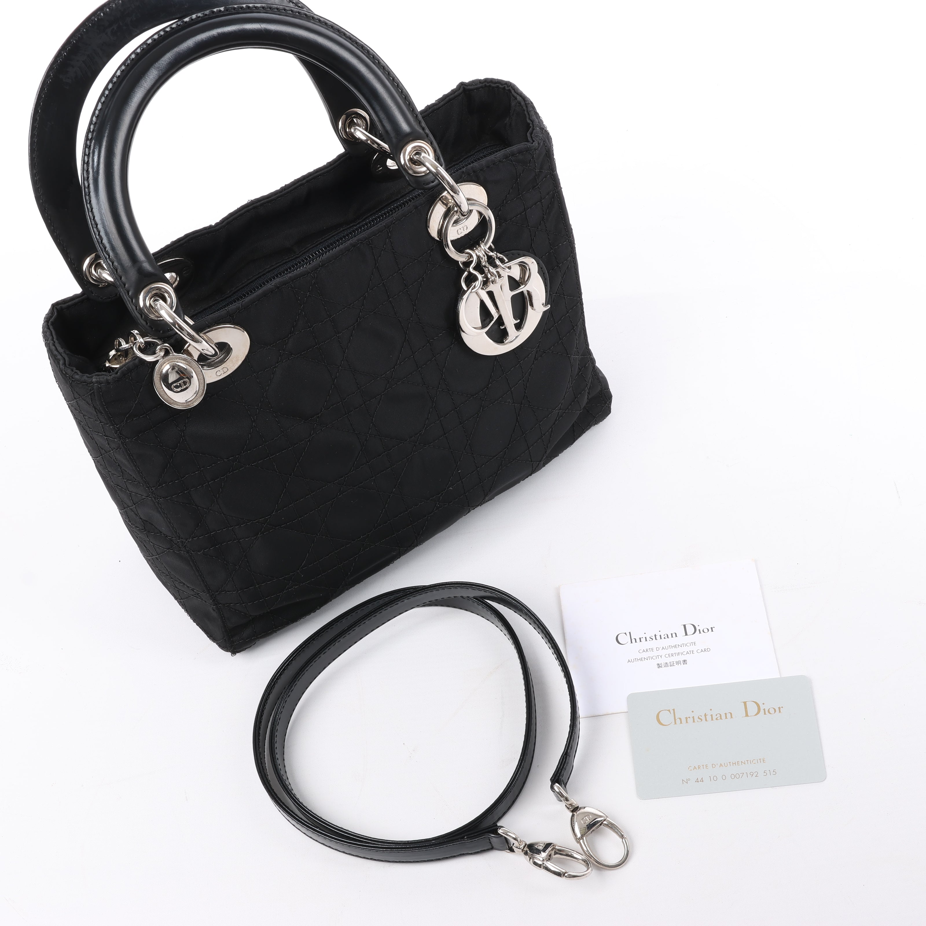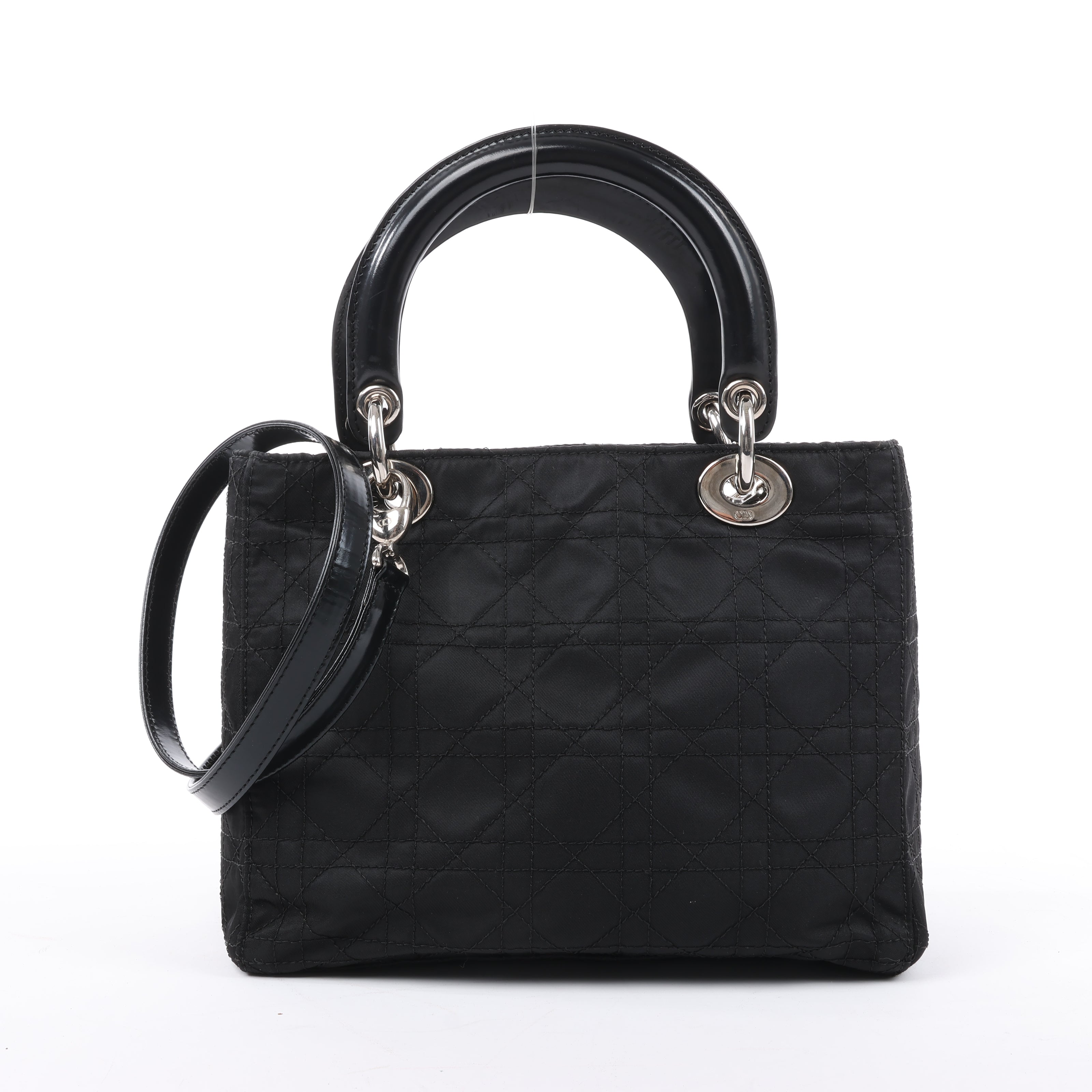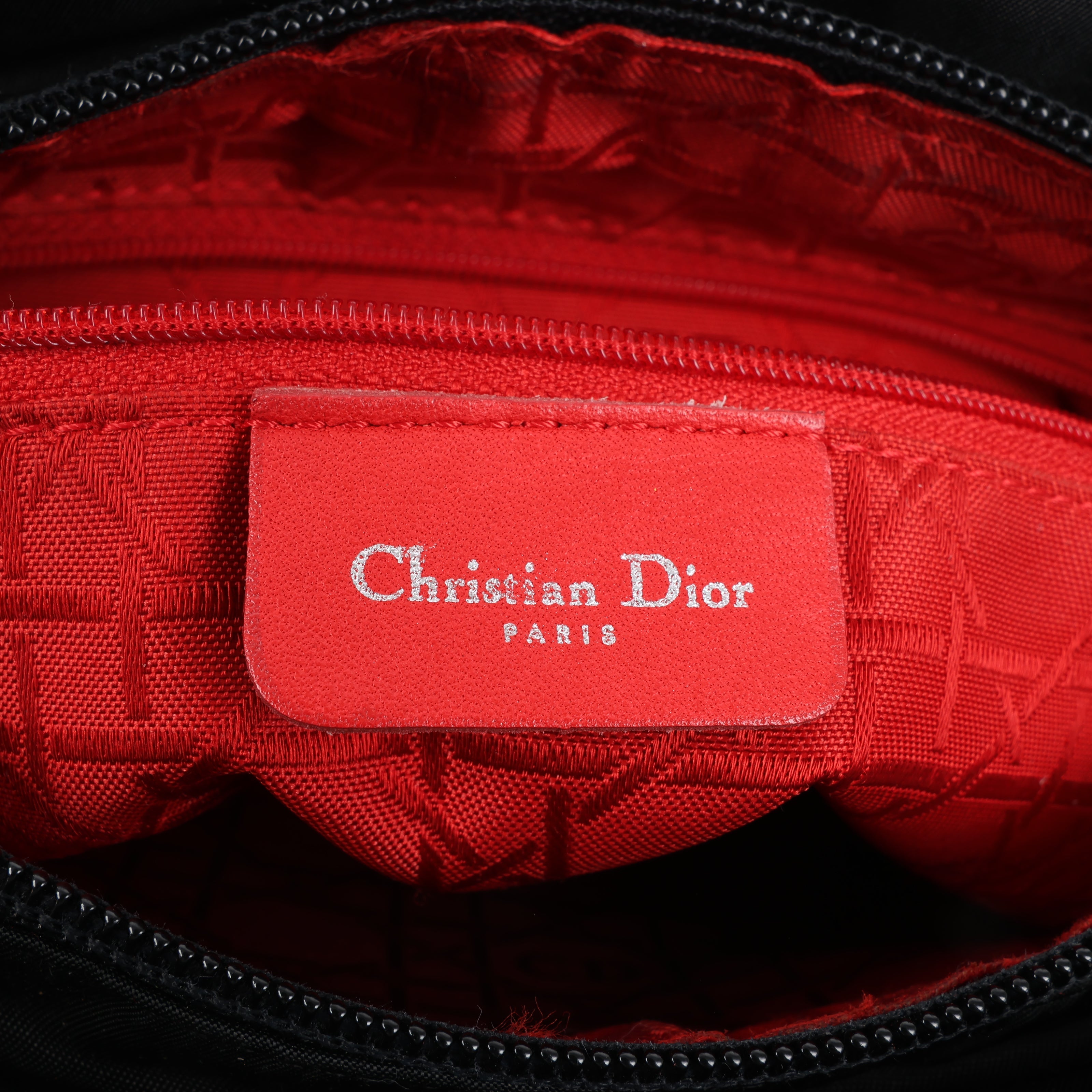 Brand: Dior Model: Lady DiorSize: MediumWidth: 23.5 cmHeight: 19 cmExterior Condition: ExcellentInterior Condition: ExcellentCondition Details: Exterior fabric is in excellent condition, but with creases. The handles are clean and firm with some scratches. Hardware is still shiny and crisp with some surface scratches and darkening. The interior lining is clean and in excellent condition - like new.Colour: BlackInterior Colour: RedHardware Colour: SilverMaterial: Polymers (Nylon)Comes With: Shoulder strap, authentication card