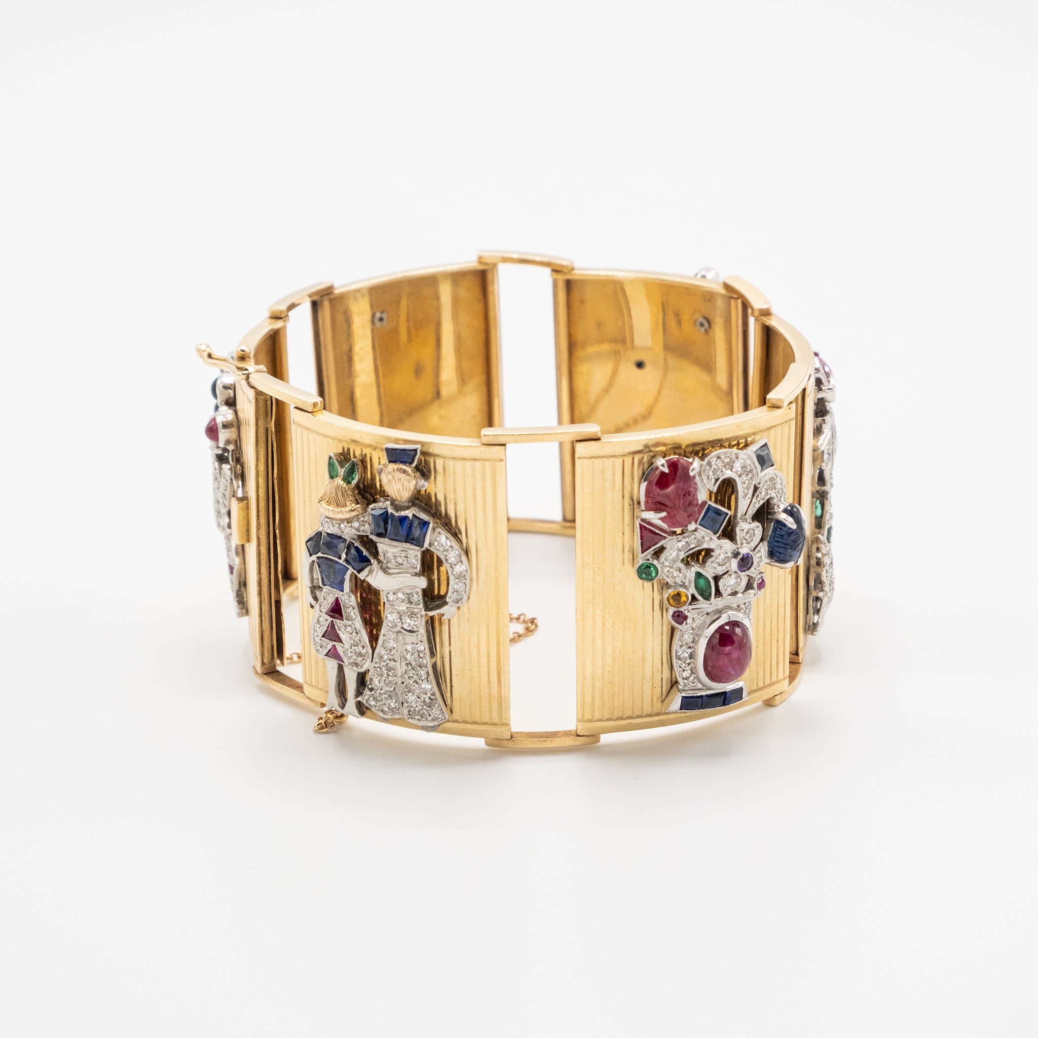 A rare and theatrical masterpiece from the 1940s, this wide French bracelet showcases exceptional craftsmanship and playful luxury. Composed of articulated vertical panels in rich 18K yellow gold, each segment is meticulously adorned with figurative gem-set scenes — from charming dogs and flowers to stylized dancers and musicians — rendered in a dazzling combination of carved rubies, sapphires, emeralds, and brilliant-cut diamonds.