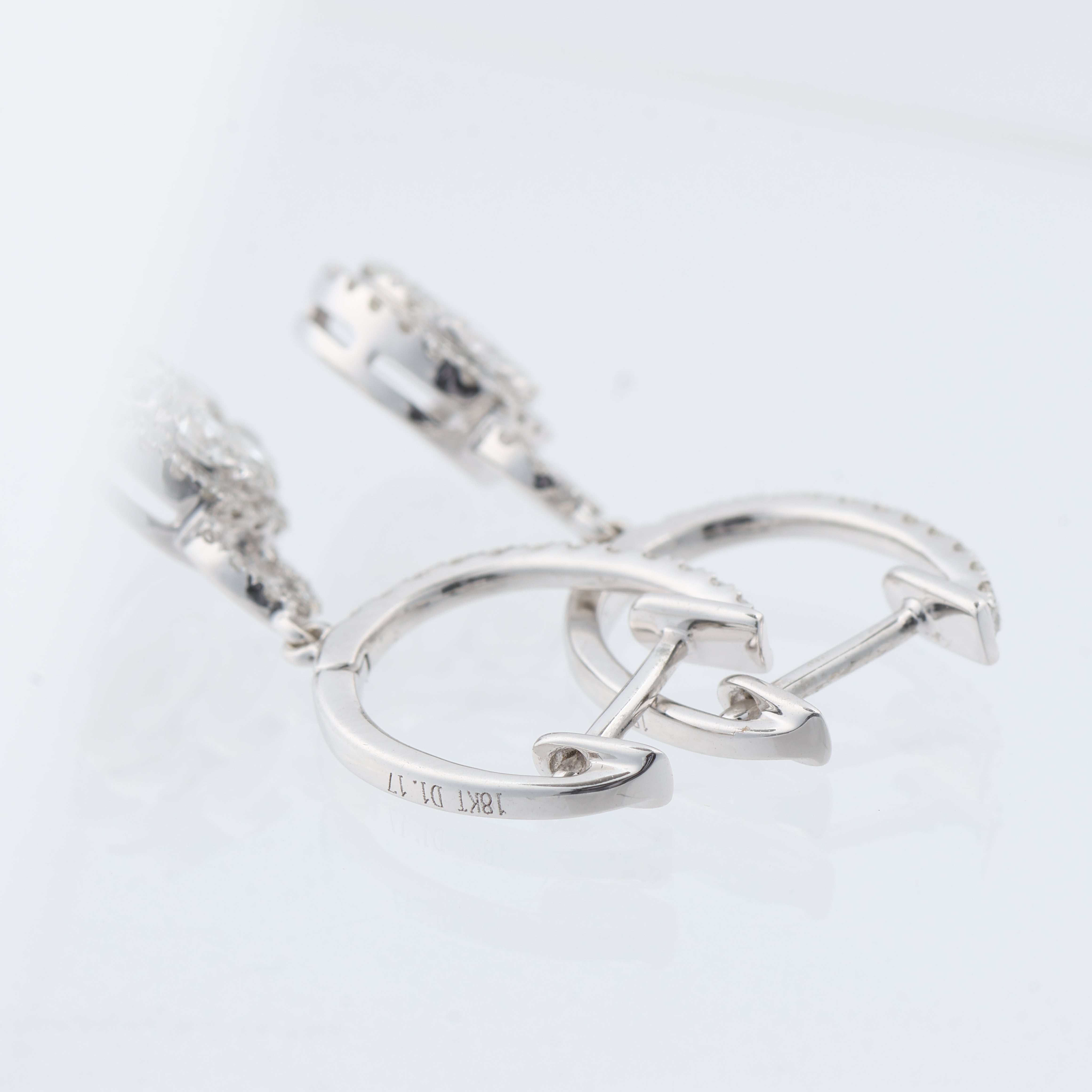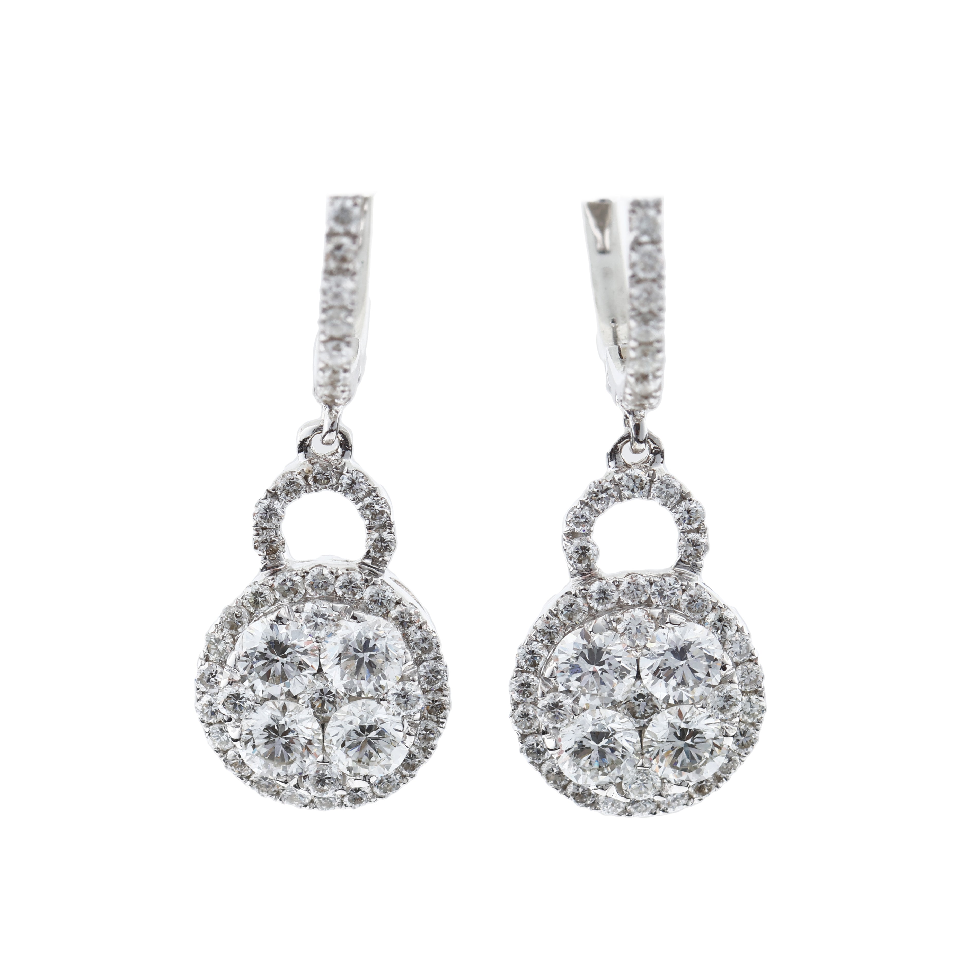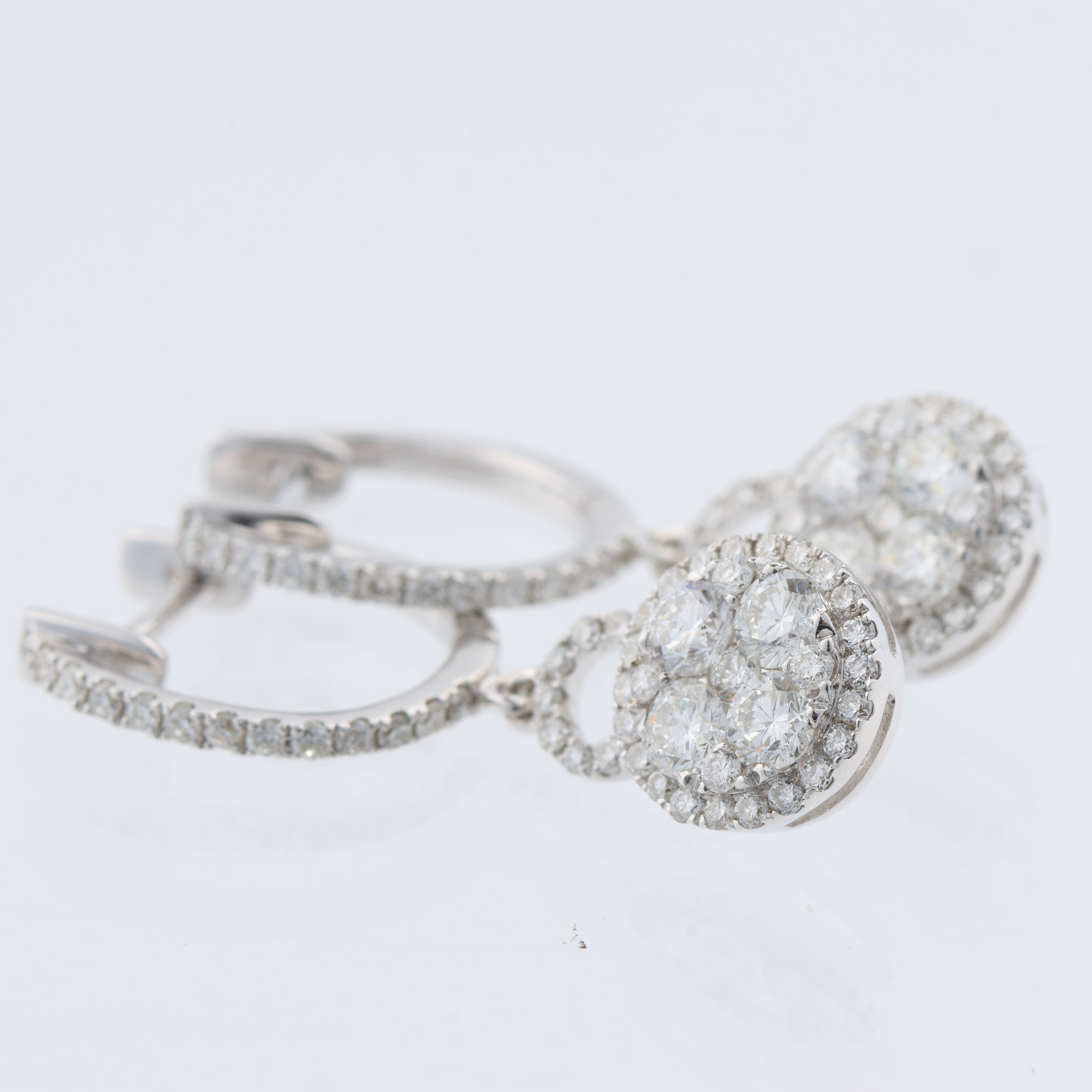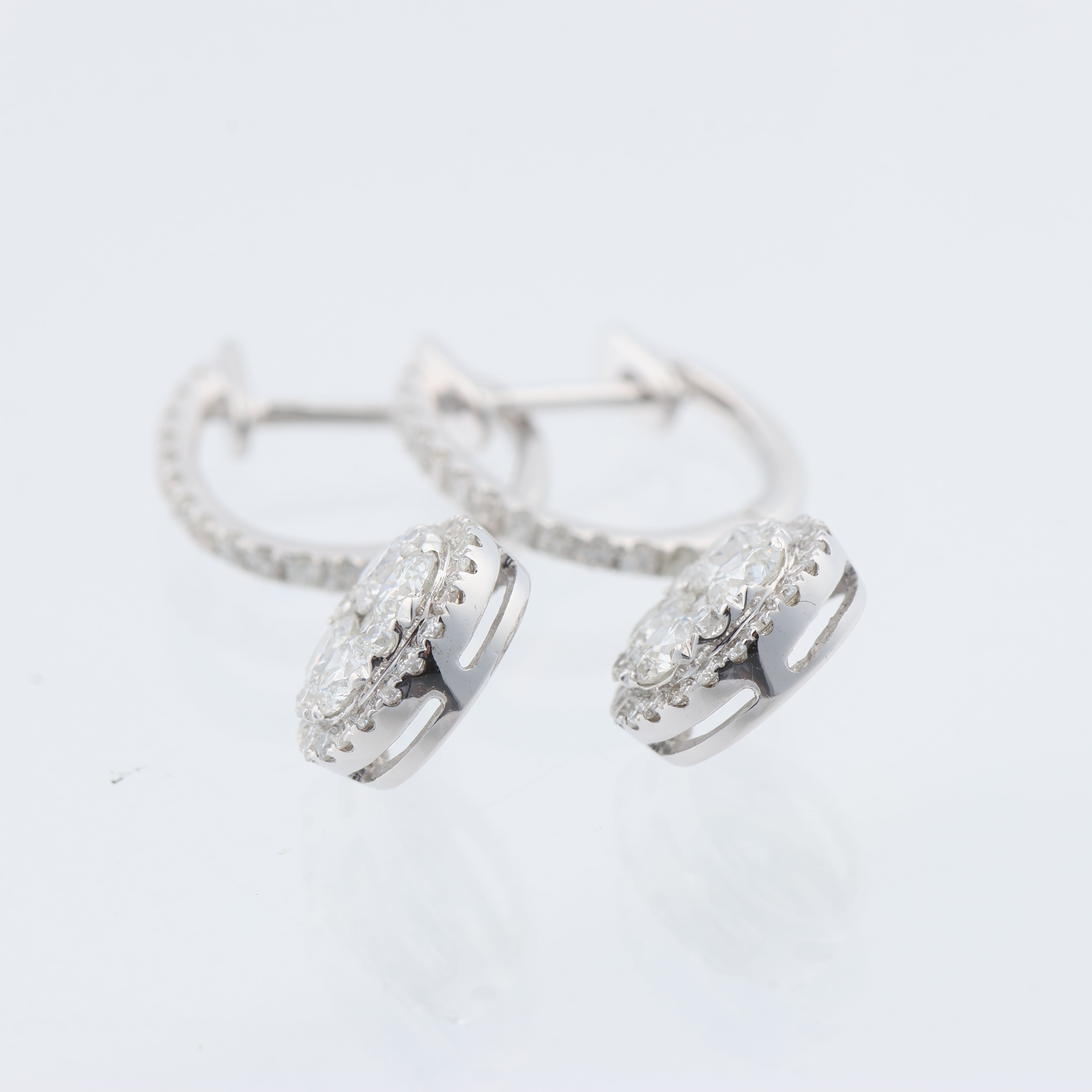 Elegant 18K white gold earrings weighing 3.17 g, adorned with 104 natural diamonds totaling \~1.17 ct. Featuring near-colorless brilliant-cut stones (G–H, VS–SI) in a dazzling halo design. A timeless touch of luxury with certified sparkle.