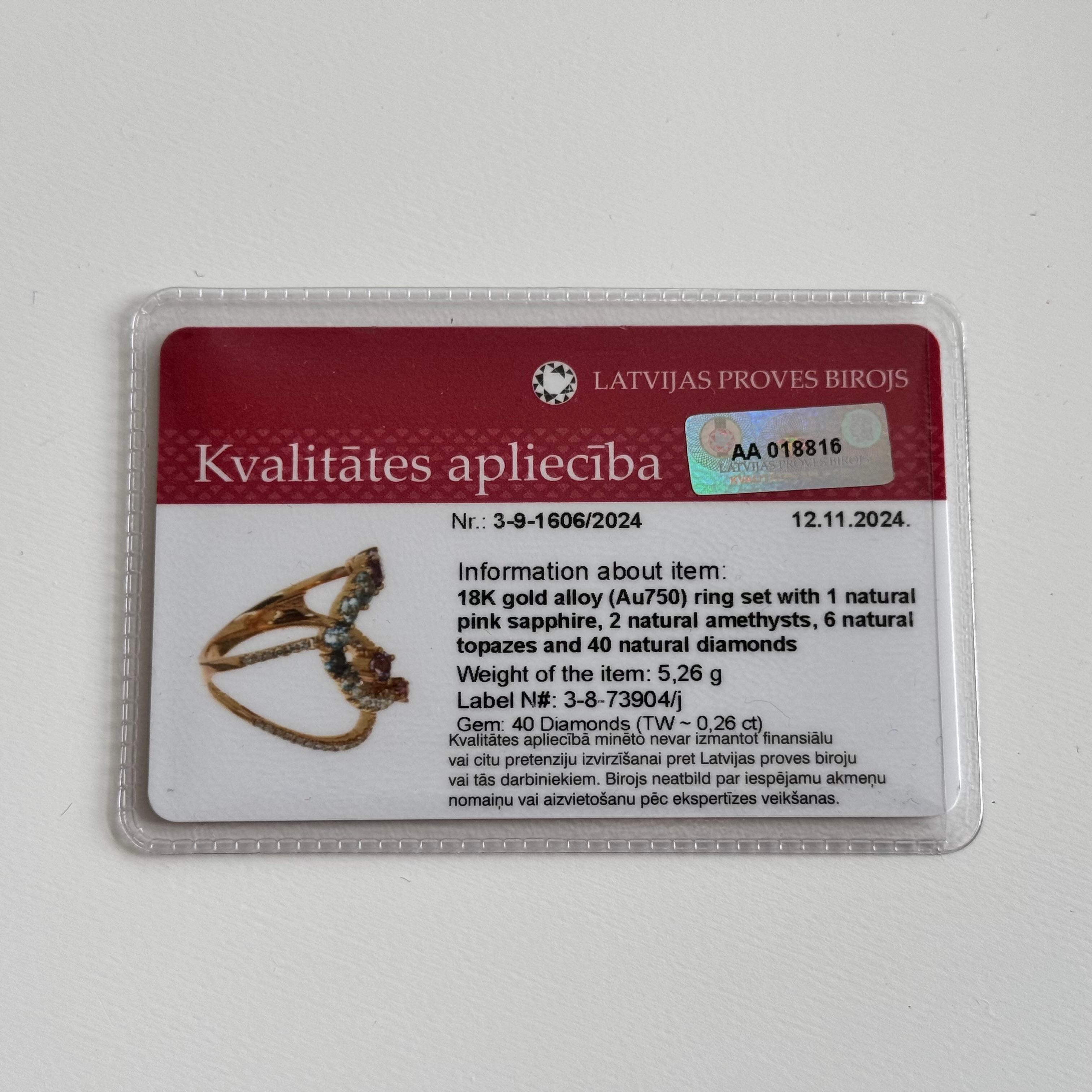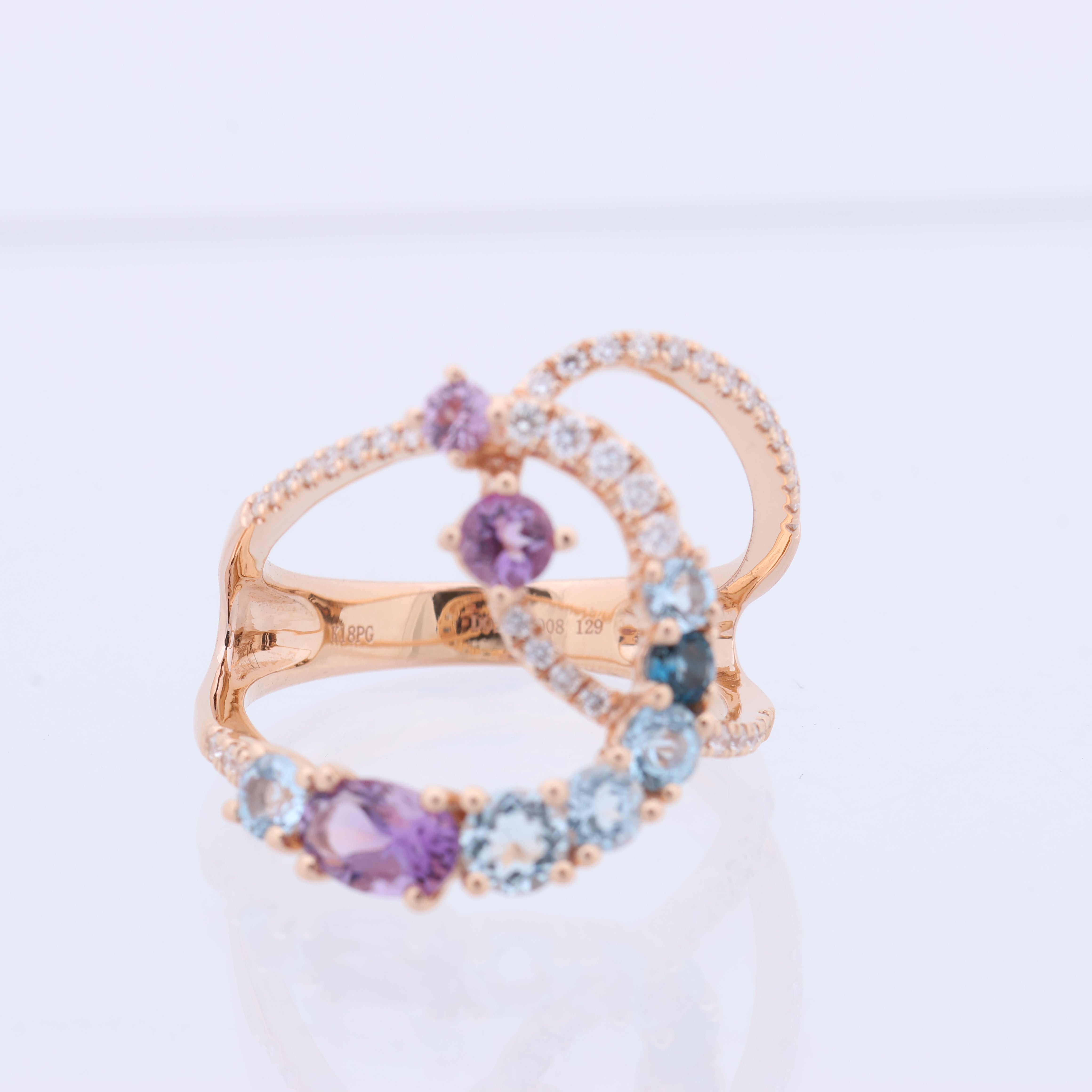 Elegant 18K rose gold ring set with a stunning combination of gemstones: 1 pink sapphire, 2 amethysts, 6 topazes, and 40 brilliant-cut diamonds totaling 0.26ct, enhancing its intricate design. Total weight: 5.3g.
